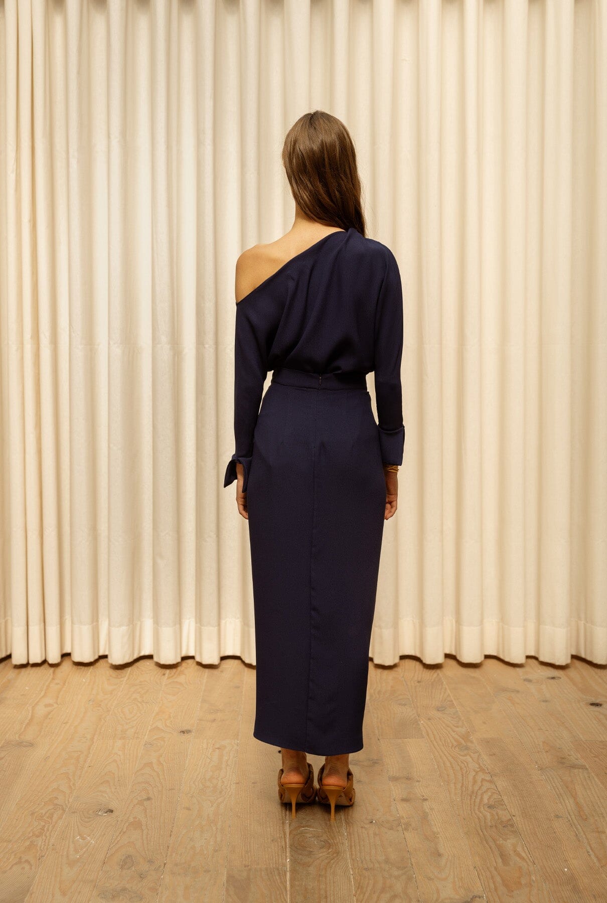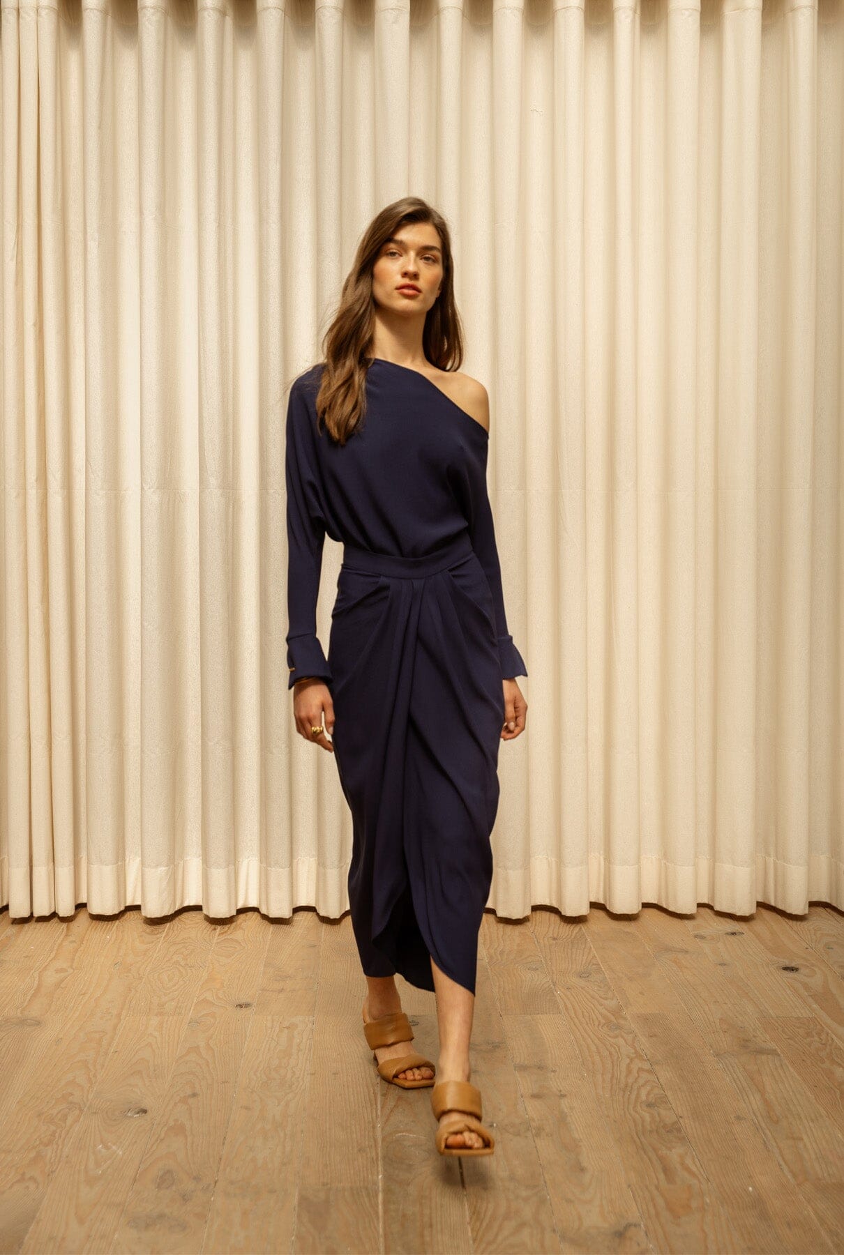 Blusa amplia asimétrica con escote escotado, hombro drapeado y puño abierto.