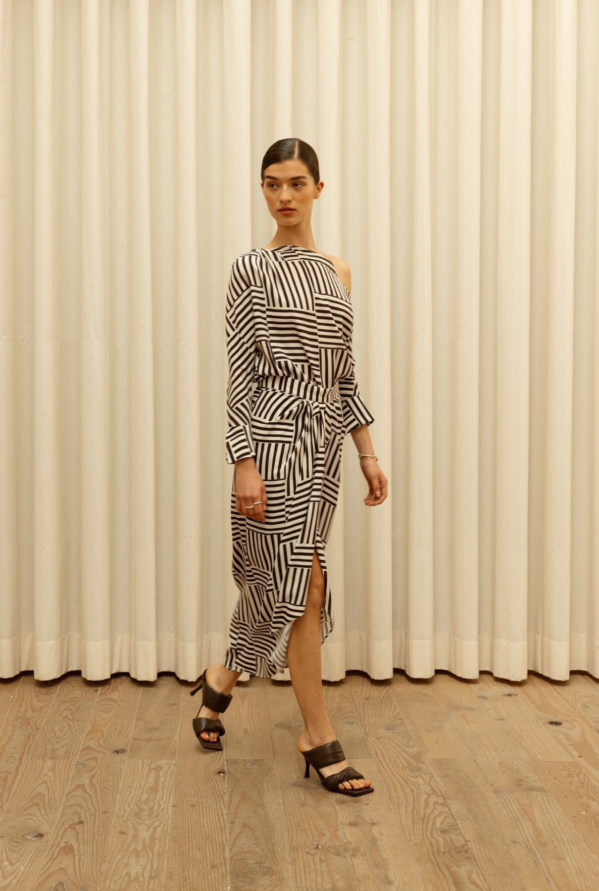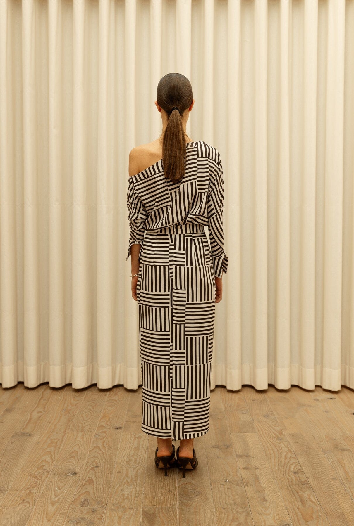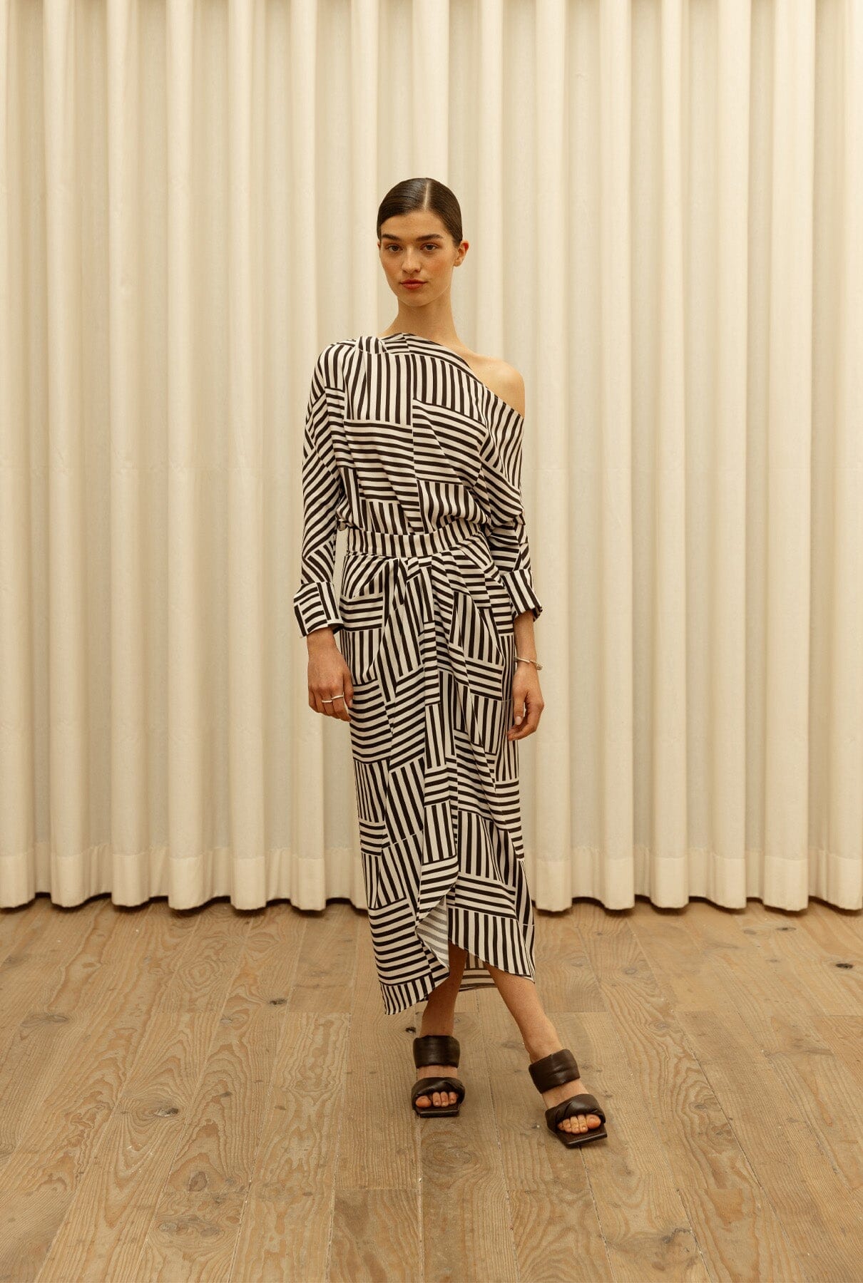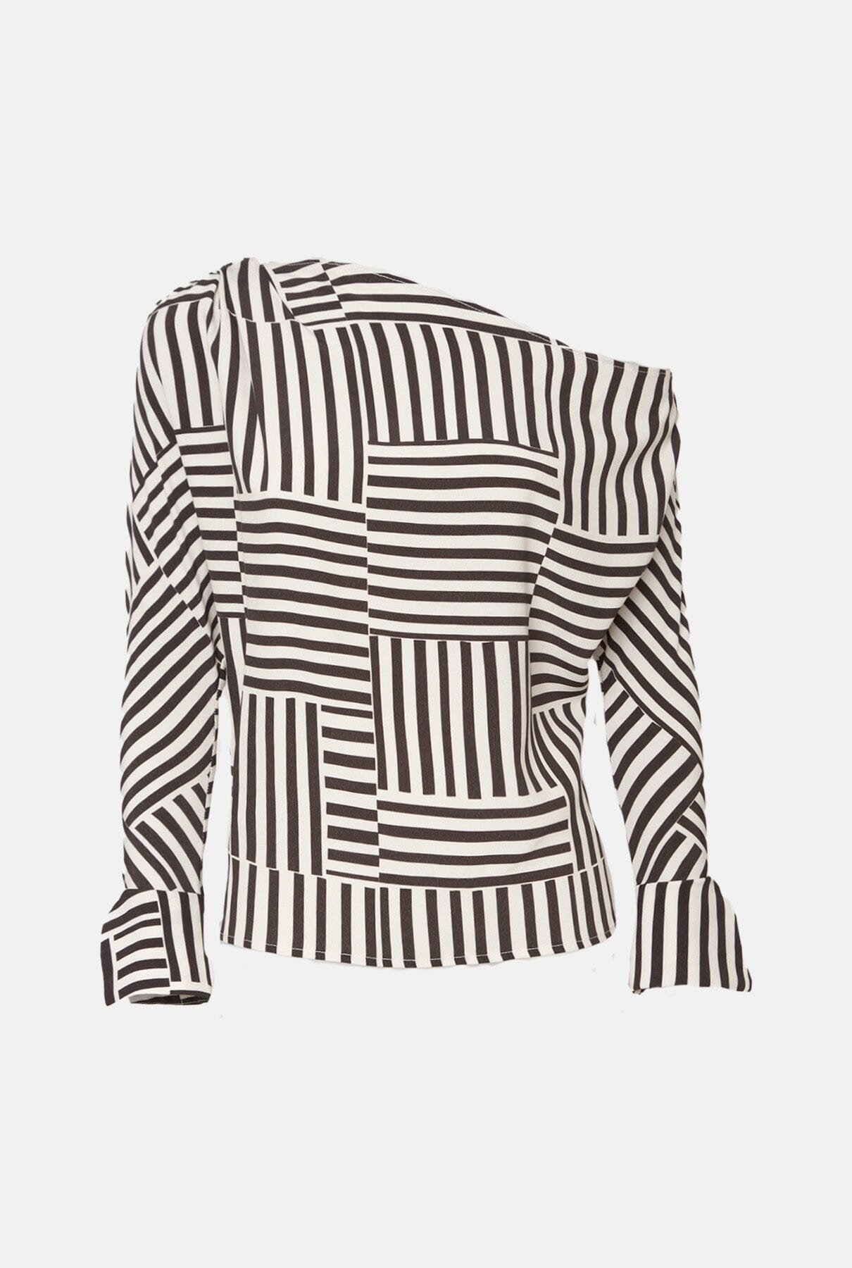 Blusa amplia asimétrica con escote escotado, hombro drapeado y puño abierto.