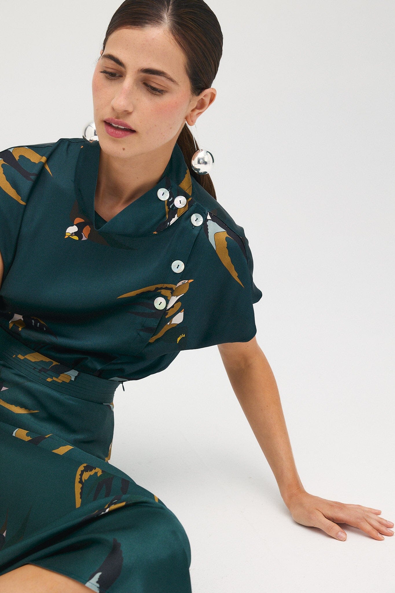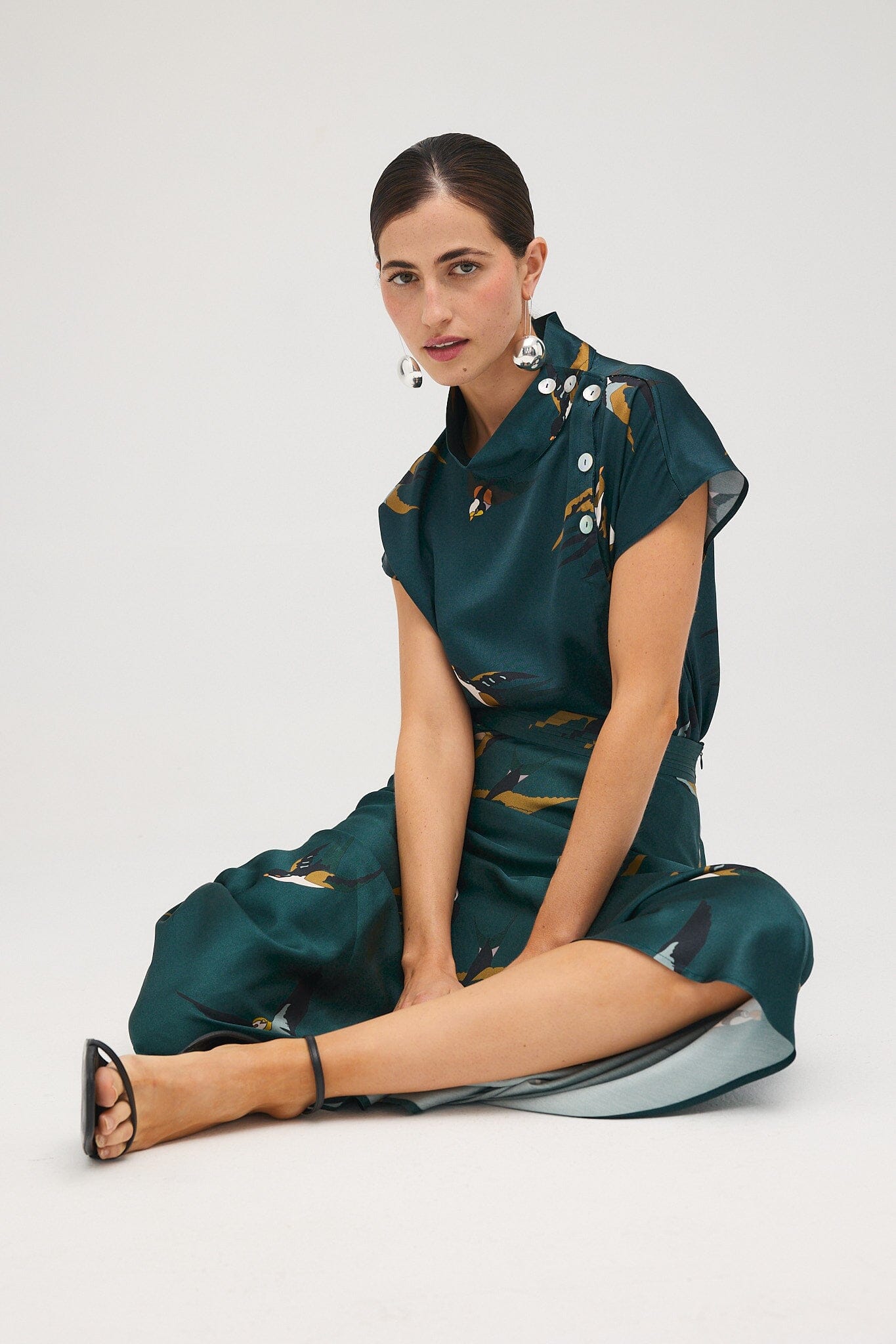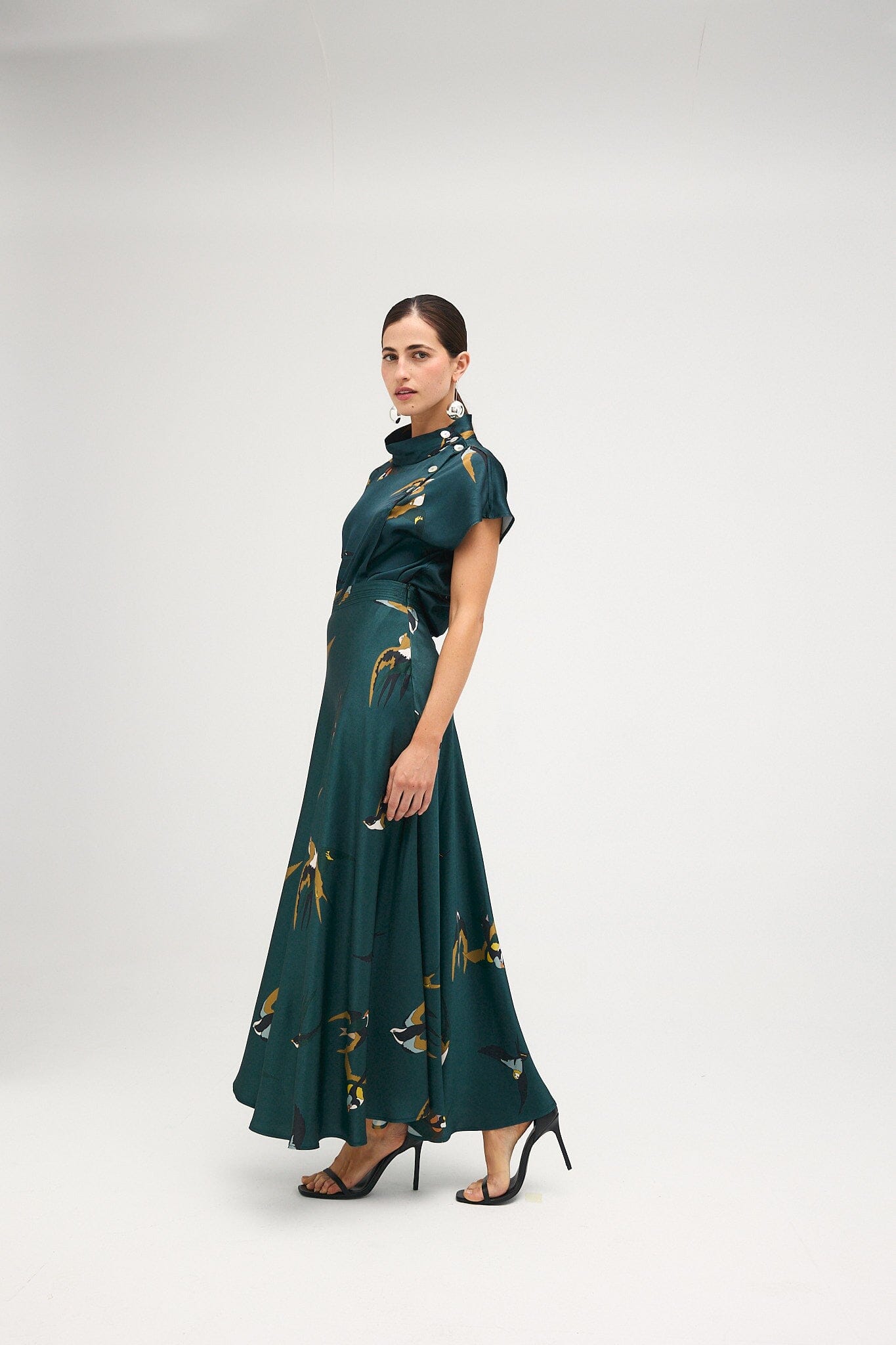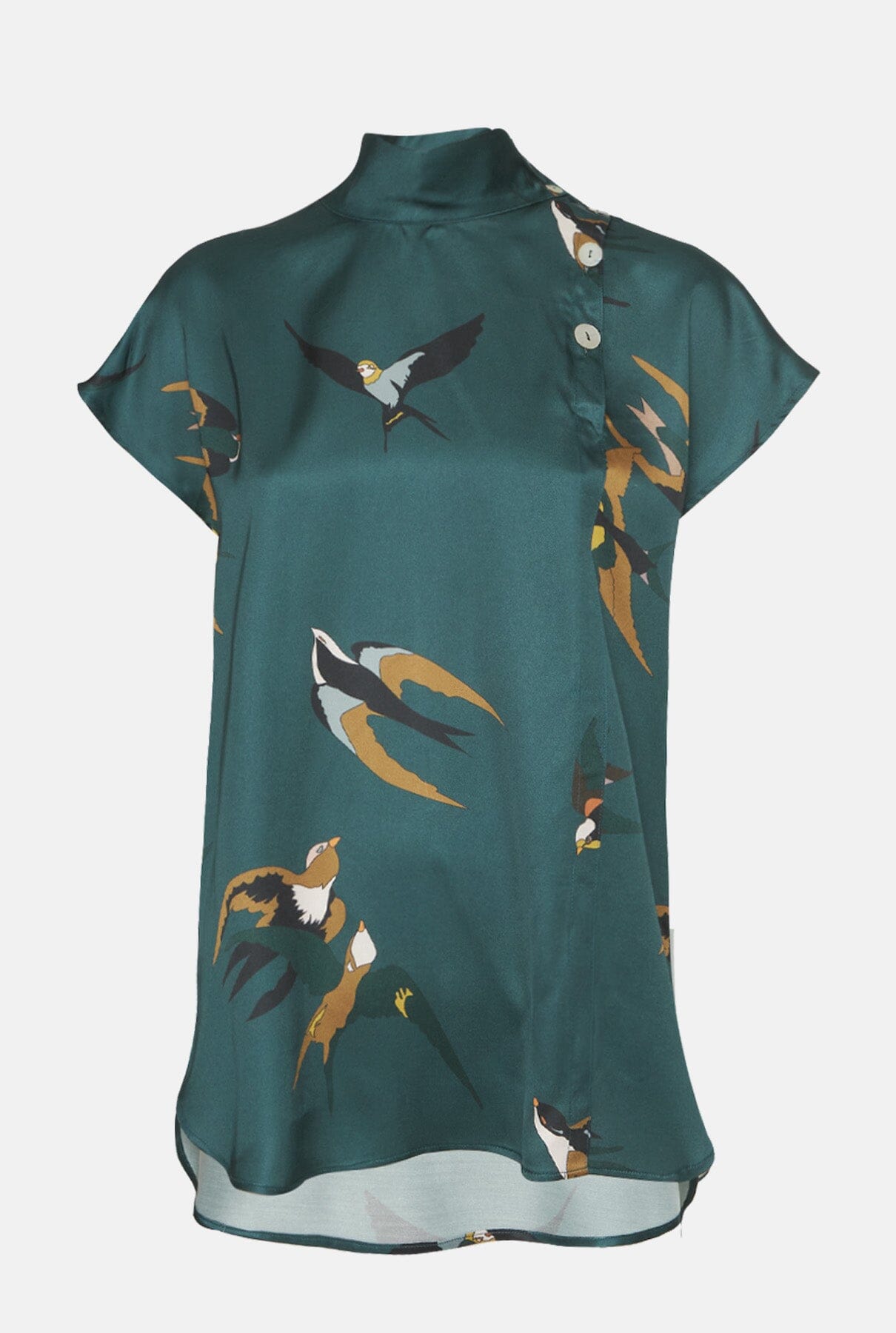 Blusa con hombros caídos y cuello alto. Está confeccionada en un tejido de satén 100% viscosa de color verde pato con estampado de pájaros en tonos verde mostaza, verde negro y crudo. Se cierra con botones de nácar en el lado izquierdo. Con la falda Ali a juego forma un look muy elegante y un vestido de trampantojo. El volante y la caída del tejido le dan un look muy elegante;