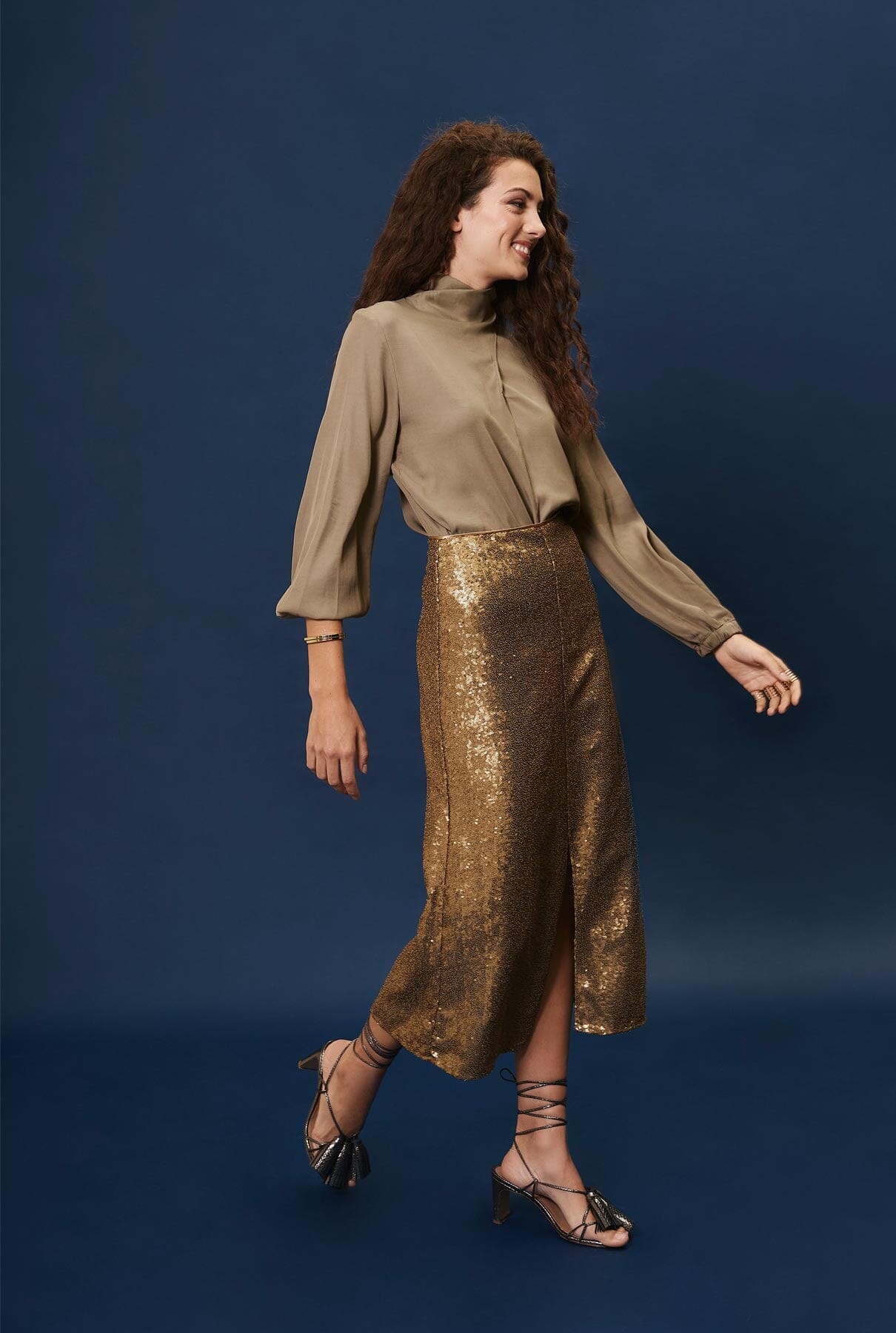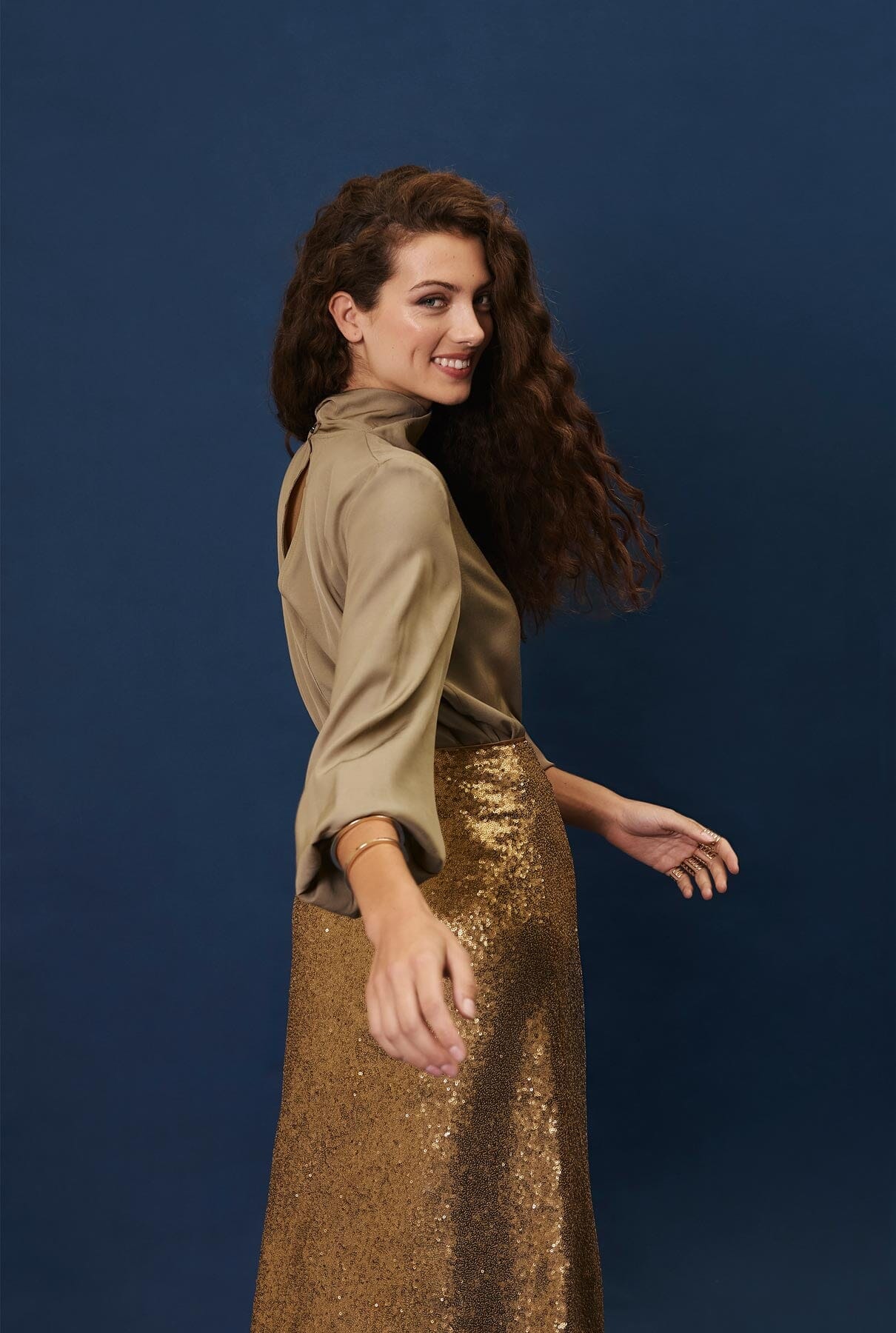 Blusa escote cruzado y cuello subido. Tiene una manga abullonada que cierra con goma por lo que se puede ajustar la altura a la que llevarla. Se abotona en centro espalda con dos botones donde tiene unos pliegues. Está confeccionada en un tejido fluido