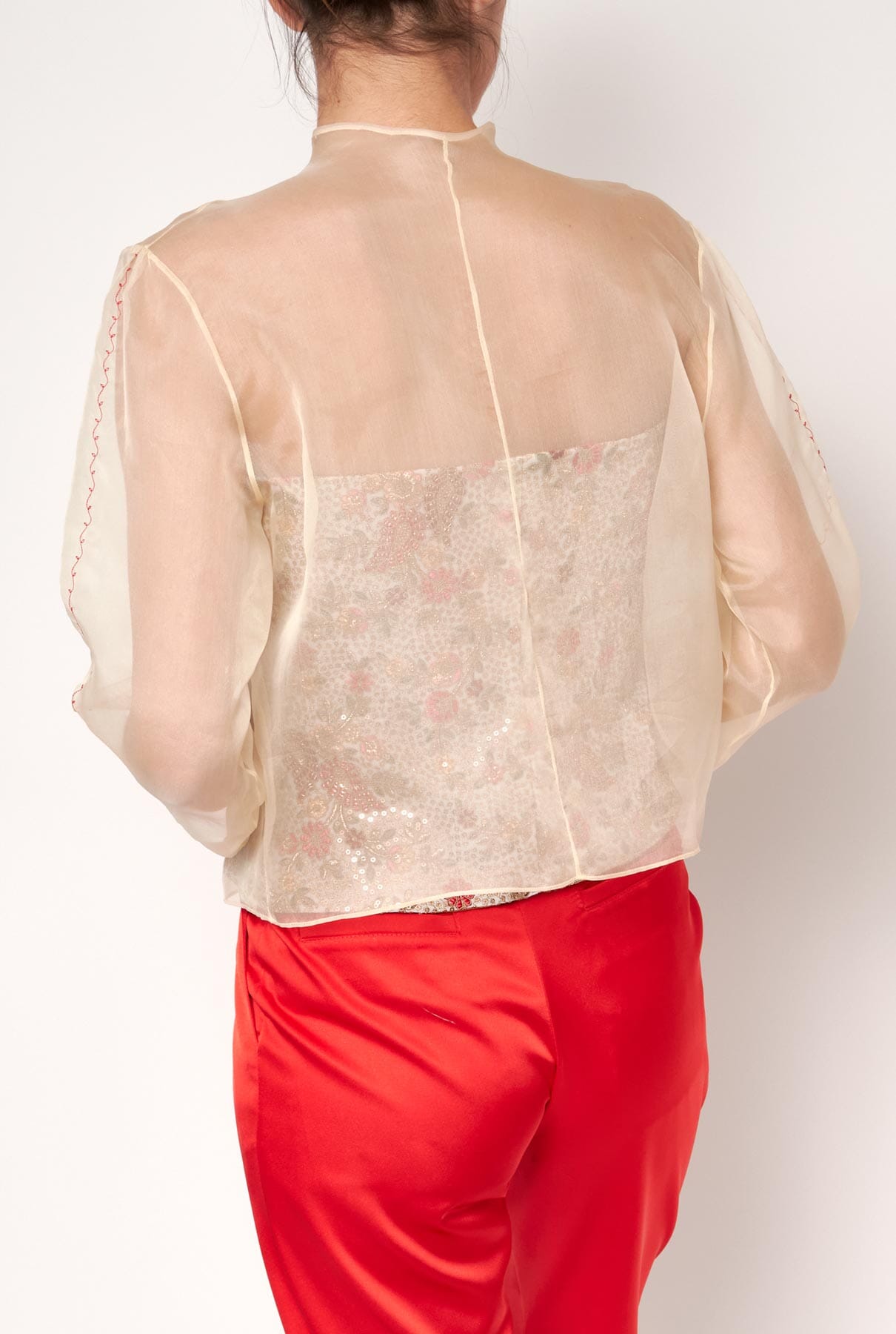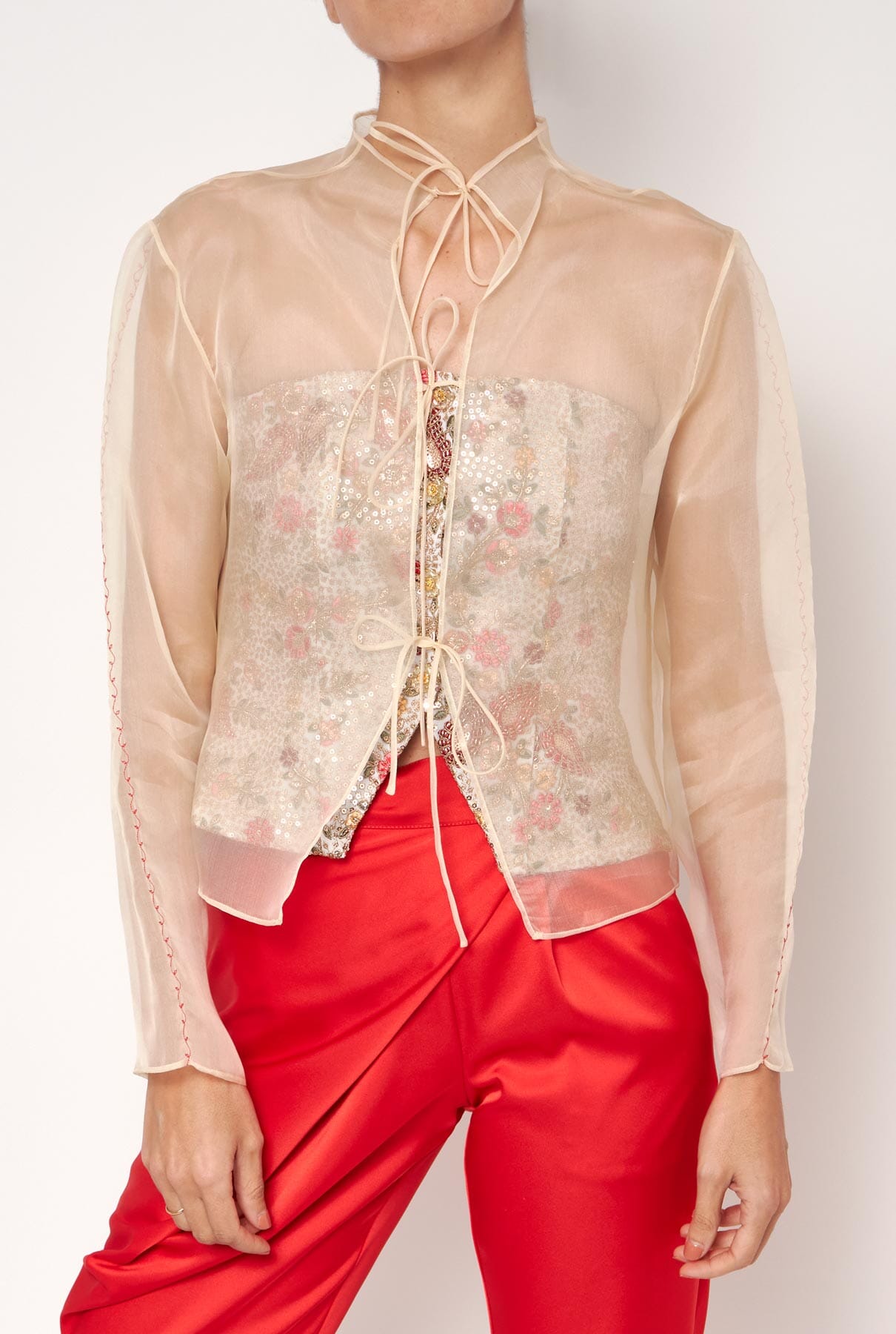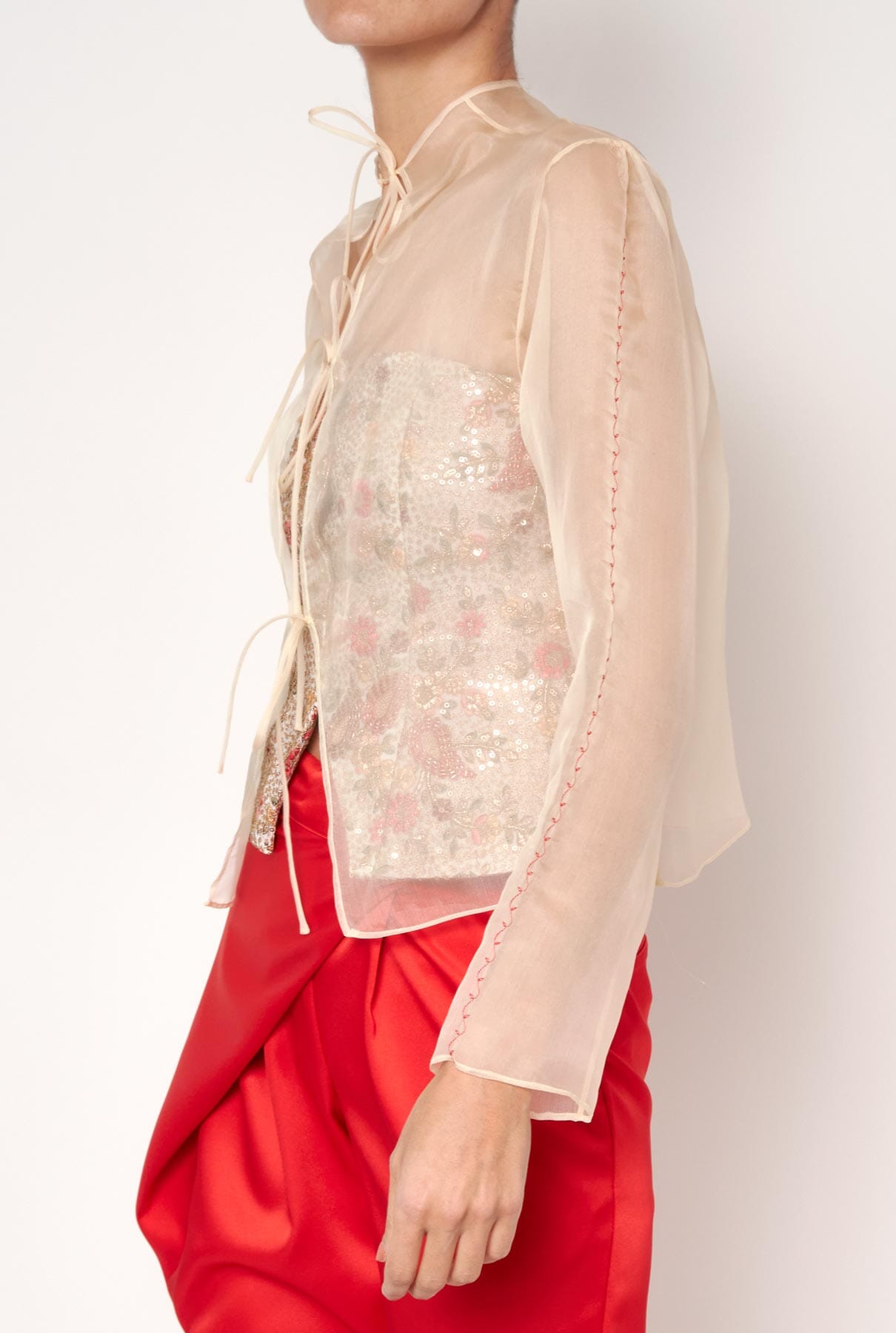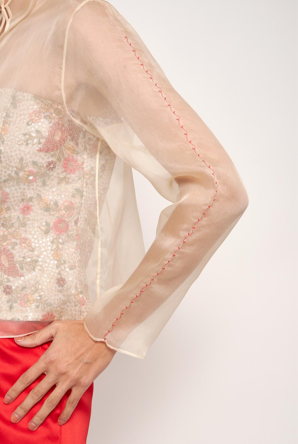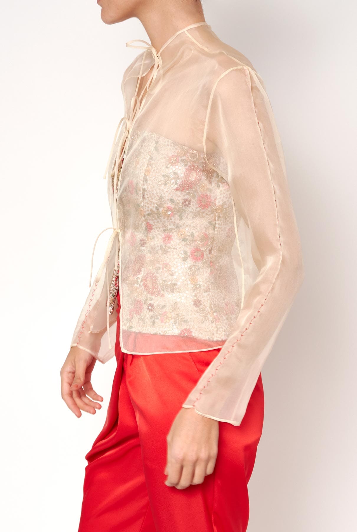 Blusa de organza con cuello chimenea adornada con líneas bordadas. Atado con correas en la espalda.