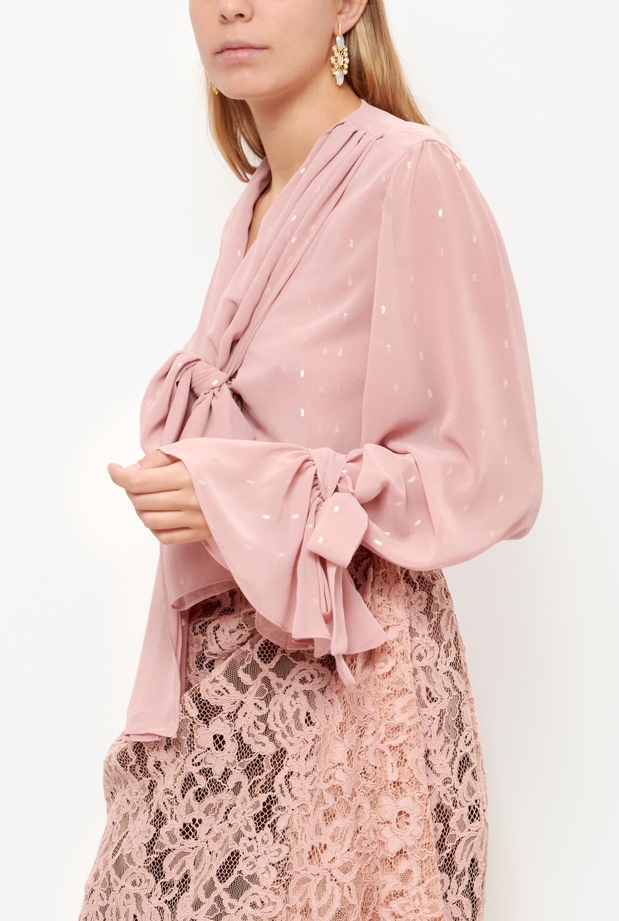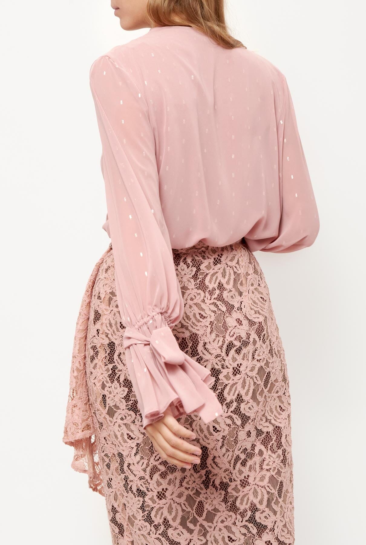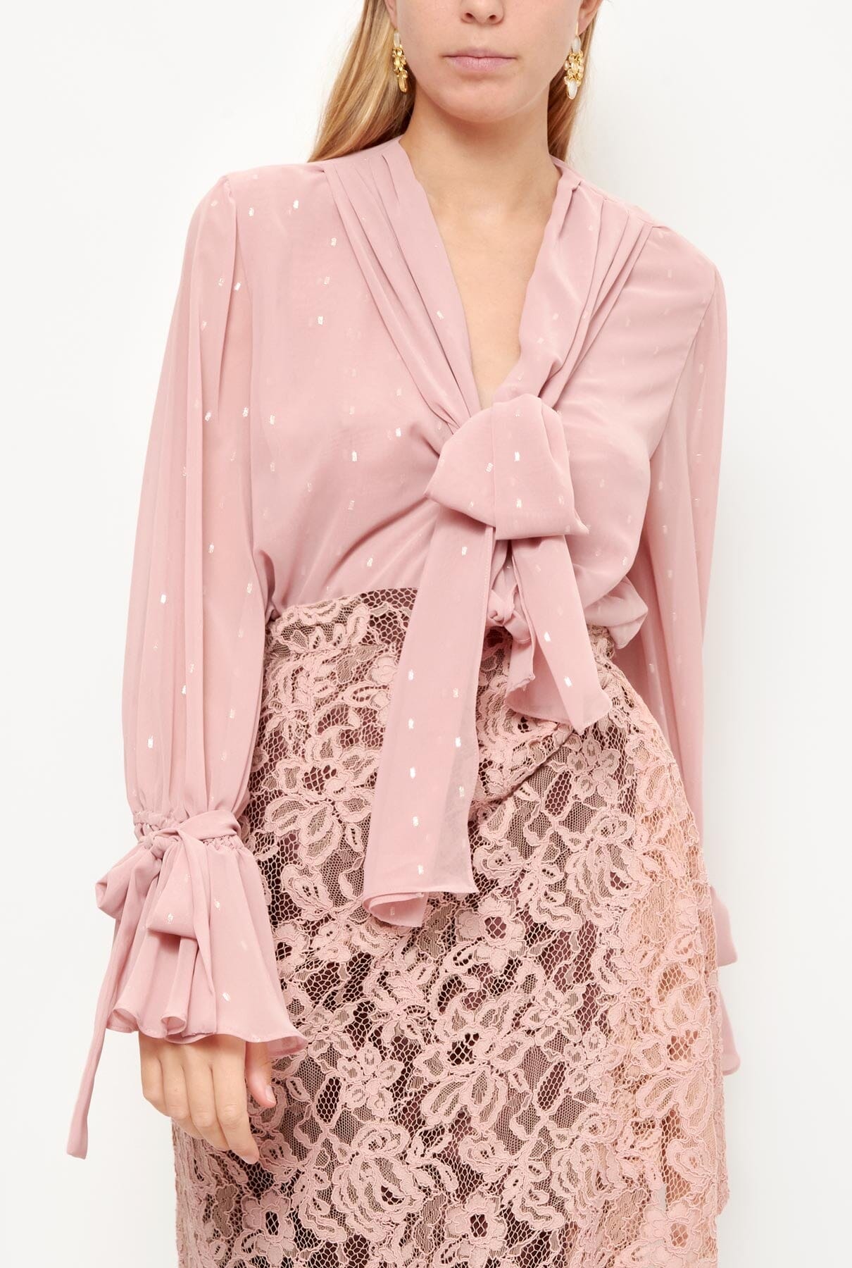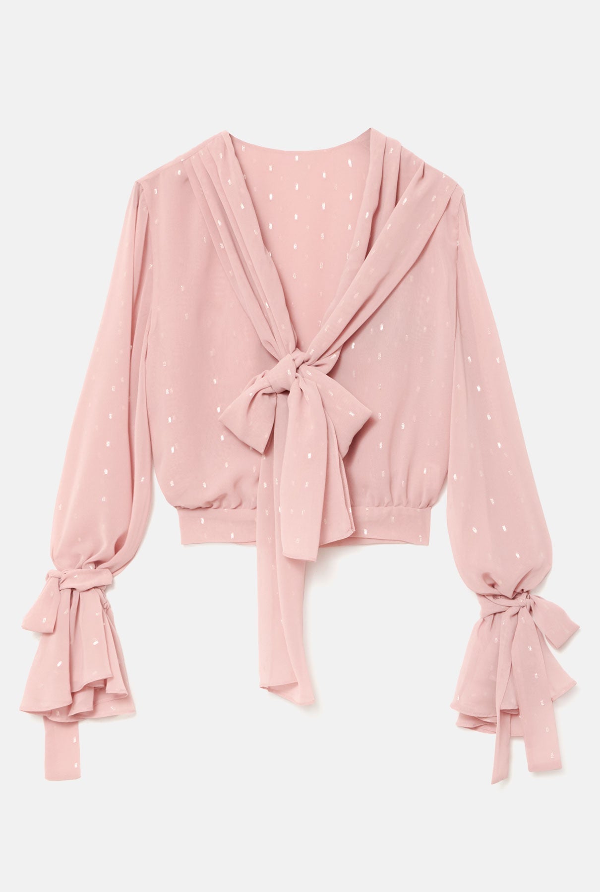 Blusa de volantes con lazada y manga. Lavar a mano o teñir. Cierre de botones. Bucle. Diseñado por Duyos.