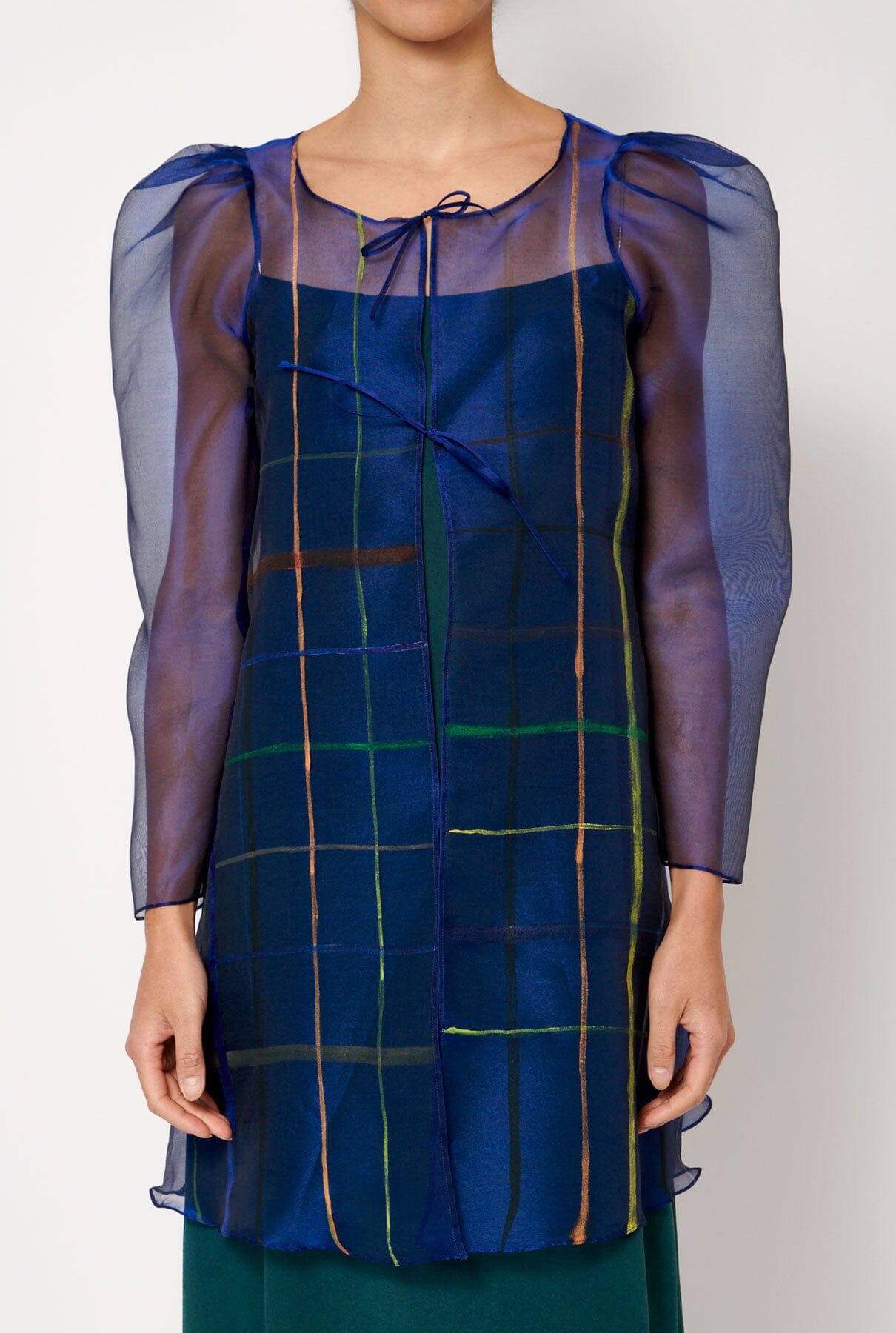 Blusa de organza de seda azul con líneas de colores pintada a mano con pintura textil. Mangas largas abullonadas. Cierre con tiras del mismo tejido.