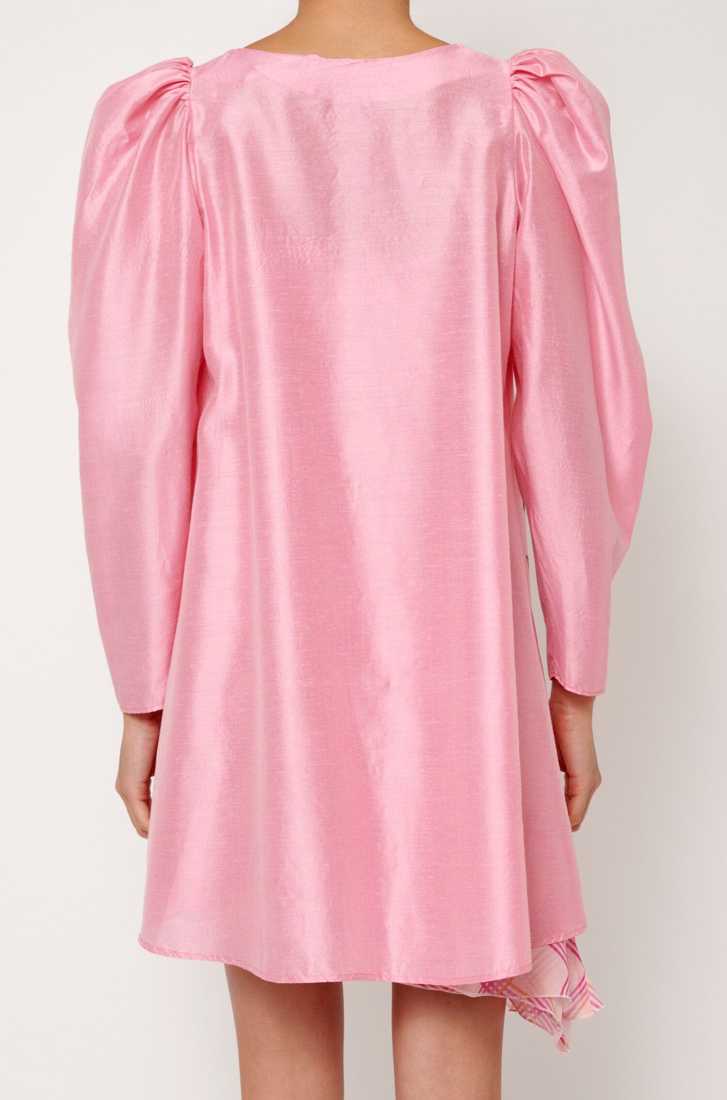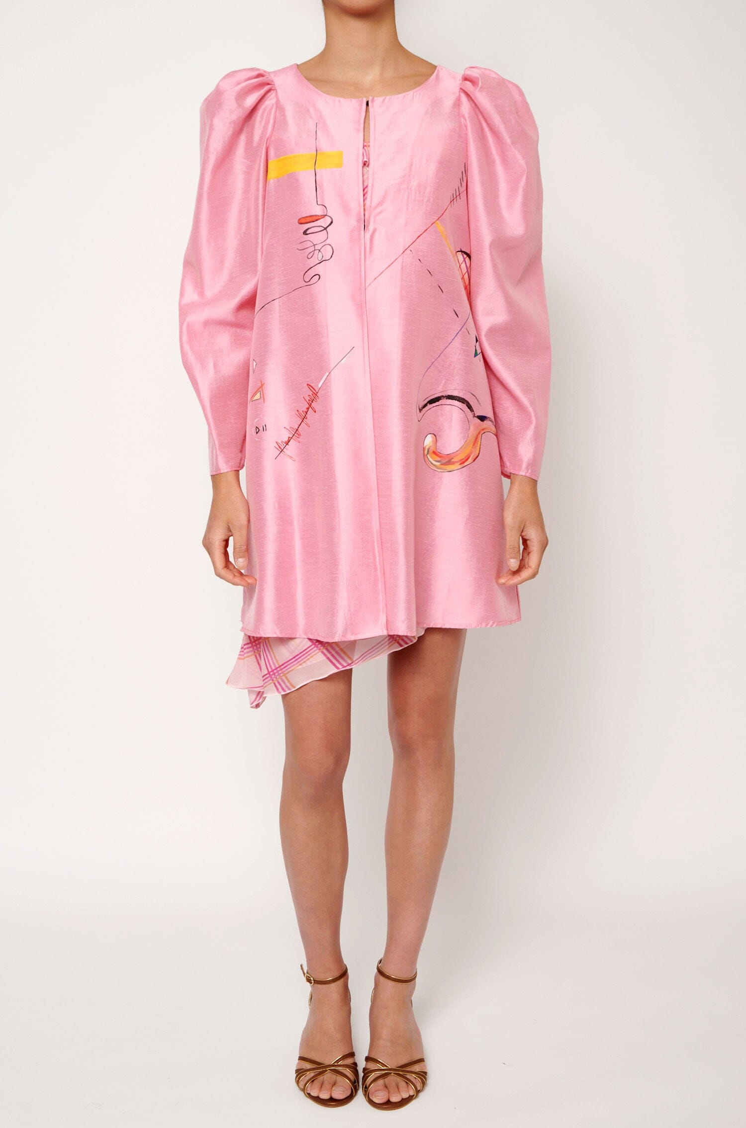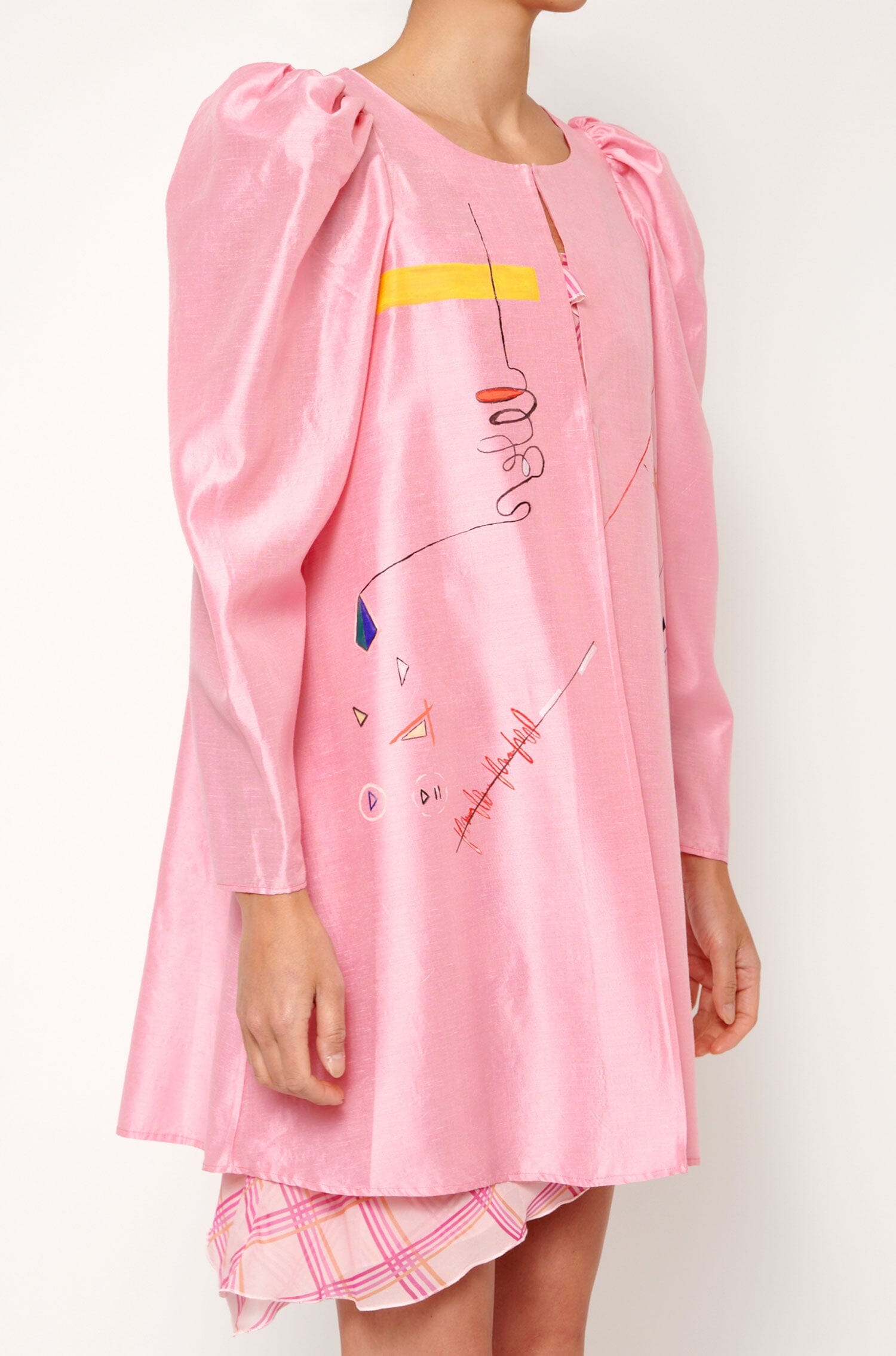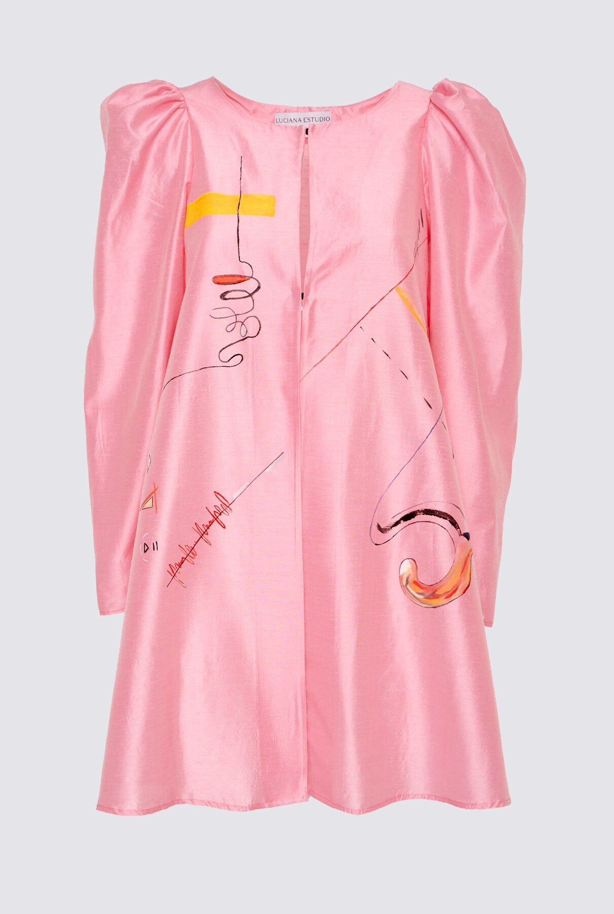 Blusa rosa, pintada a mano con pintura textil. Mangas largas abullonadas. Cierre de corchetes en la parte delantera.