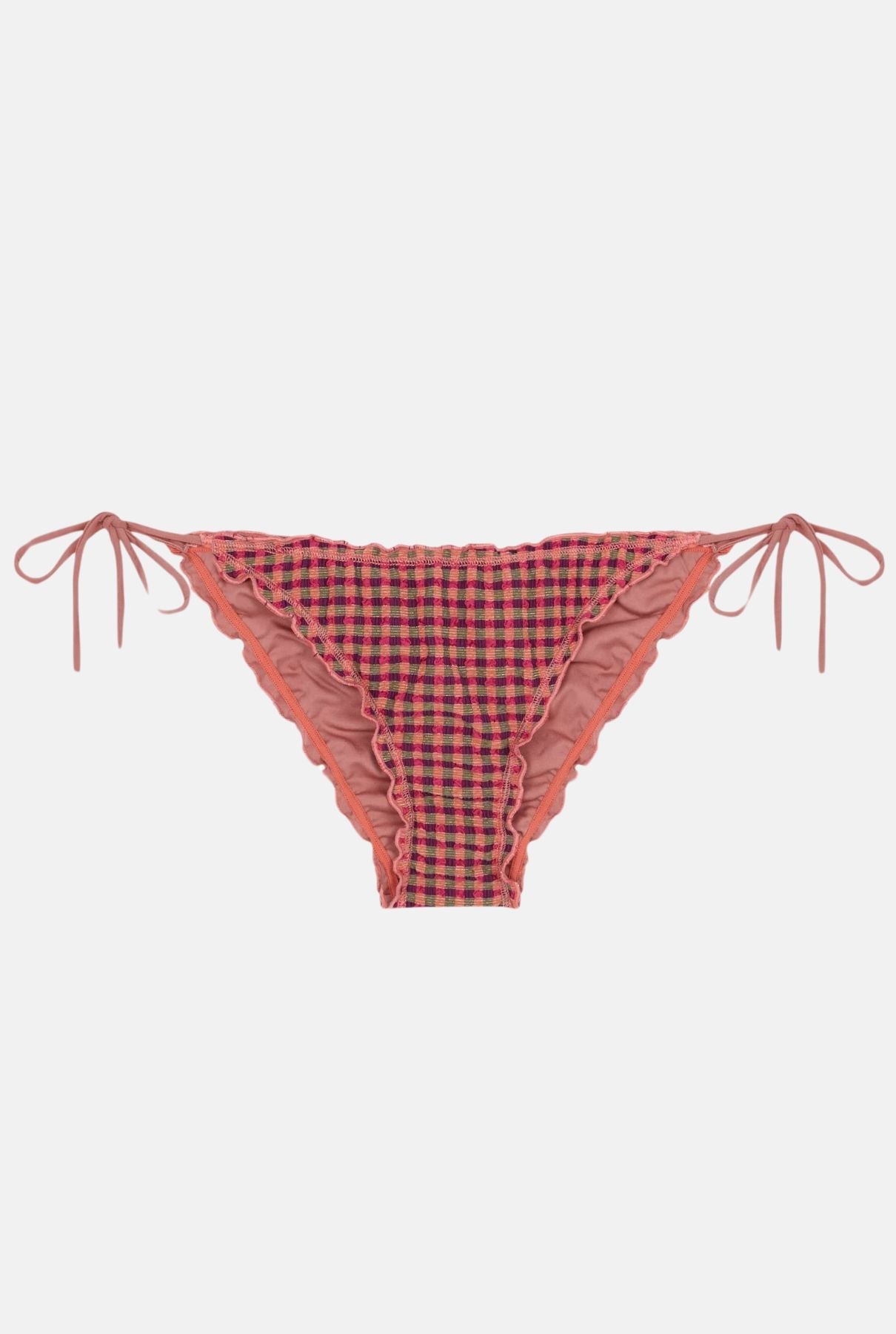Estampado de cuadros vichy con textura de seersucker en tonos rosa y morado. Los detalles de lúrex brillante le aportan un sutil toque de brillo. Forrado en licra rosa maquillaje.