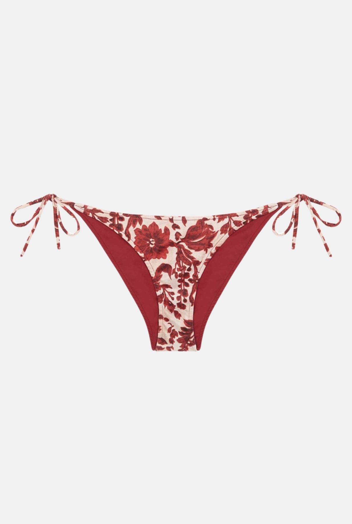 Estampado floral vintage en tonos granates sobre fondo crudo y tirantes finos del mismo estampado.