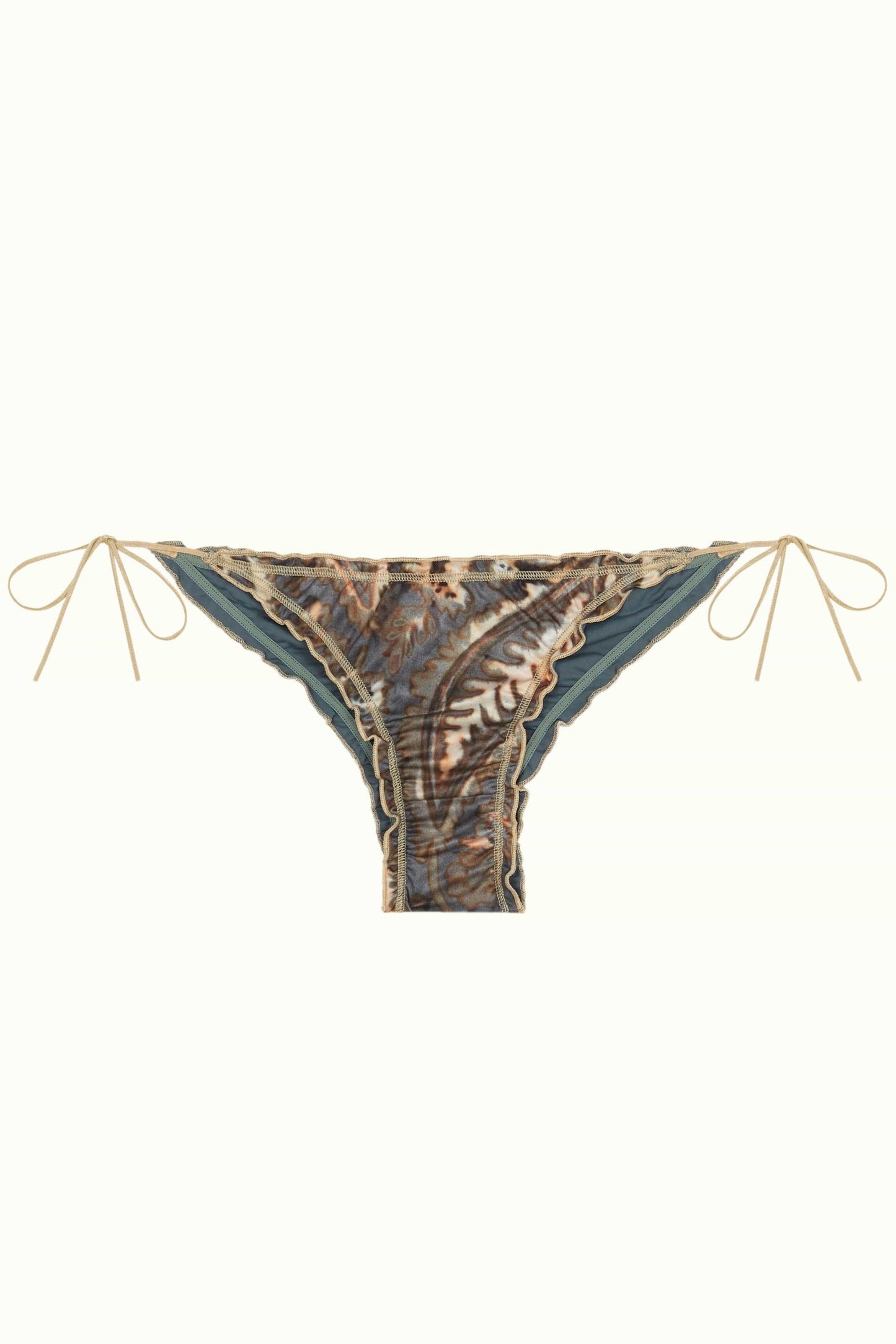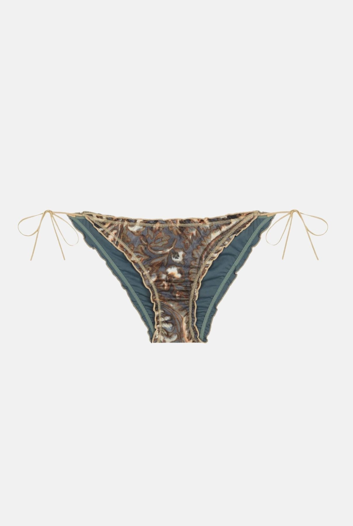 Con estampado paisley en tonos verdes y beige sobre fondo azul prusia, con efecto acuarela.