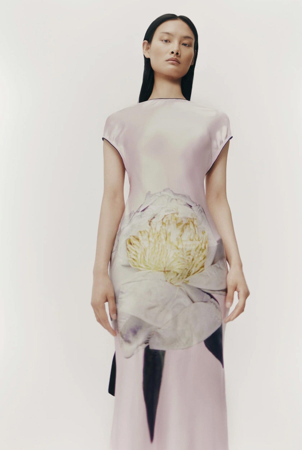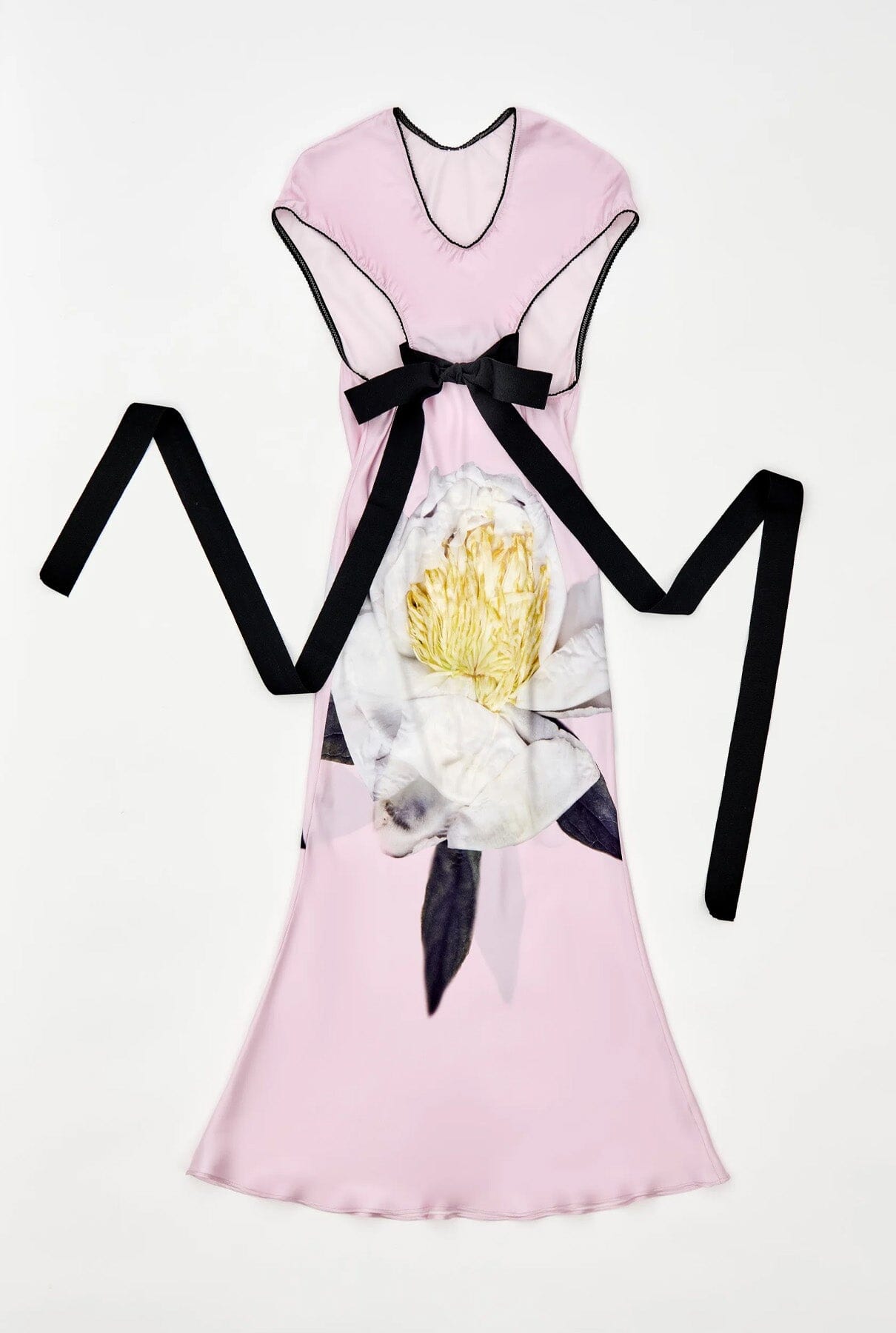 Vestido lencero de largo midi con grandes sisas escotadas en lateral y espalda, todos los bordes del escote están rematados con gomas elásticas lenceras frunciendo ligeramente el tejido. la espalda está decorada con un lazo de cinta de grosgrain en contraste extraíble.