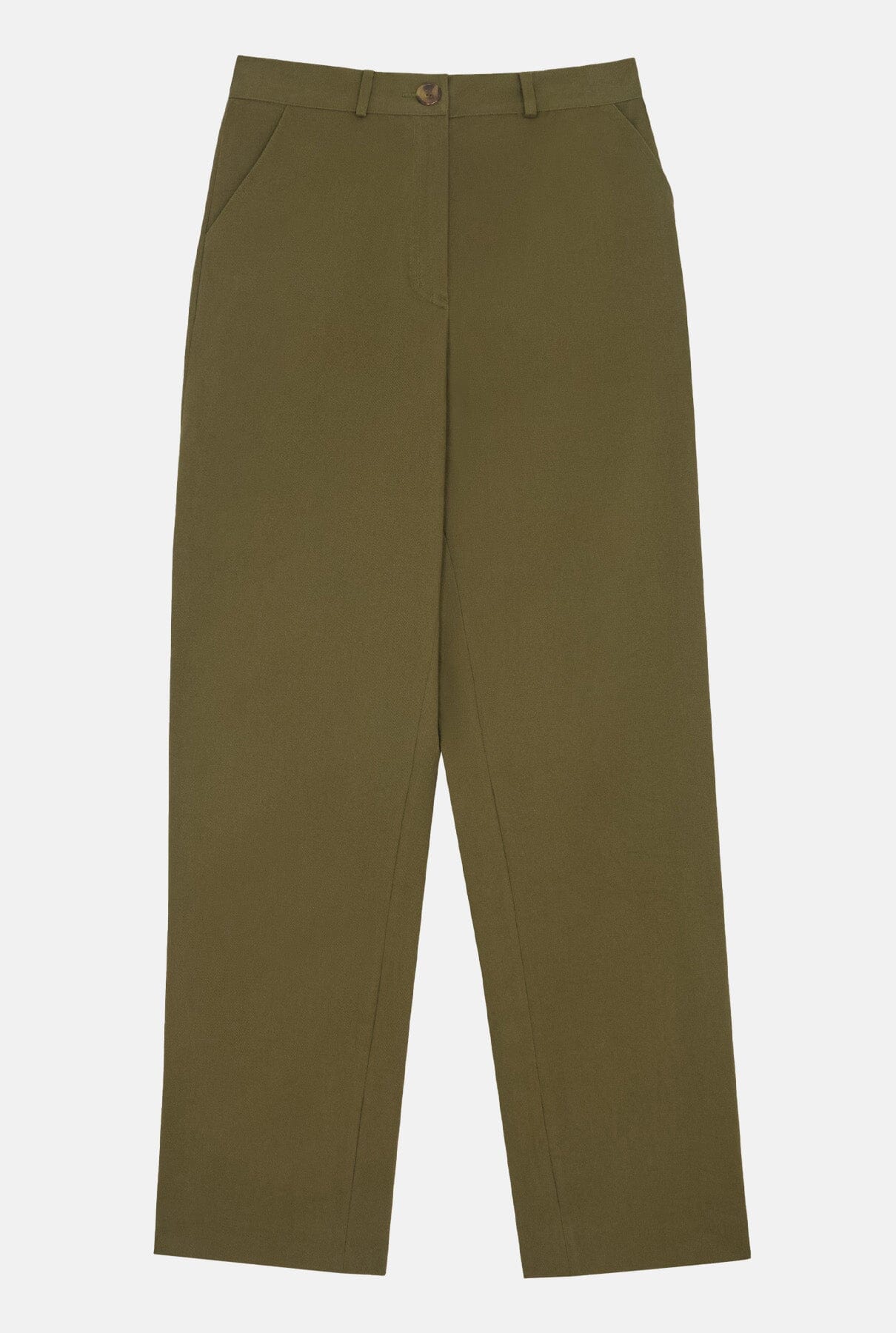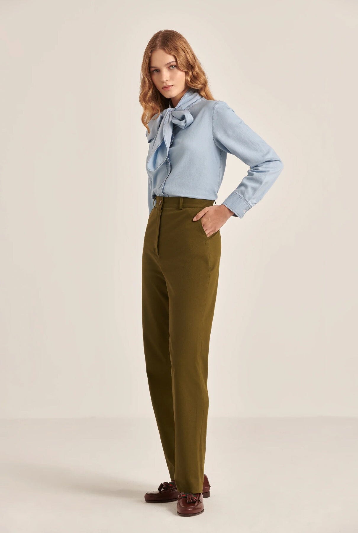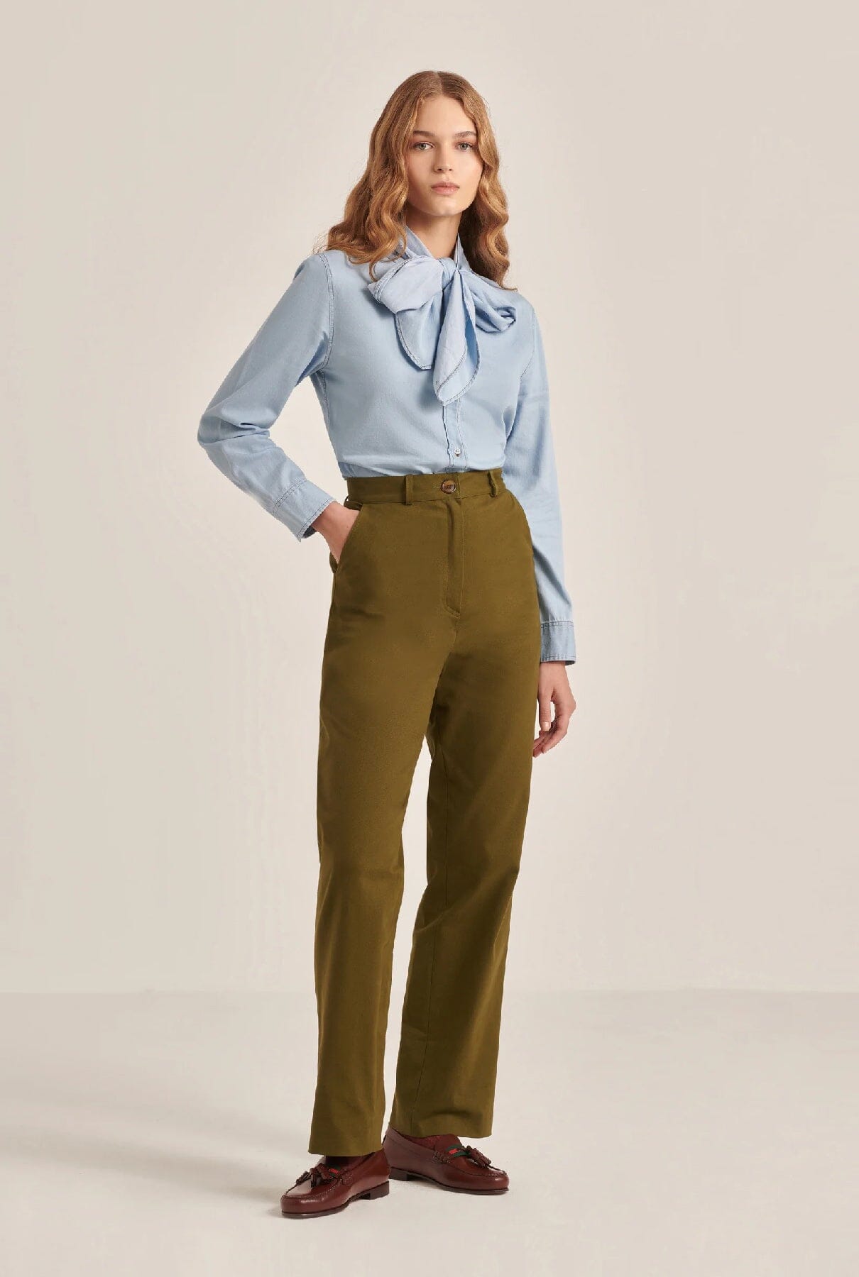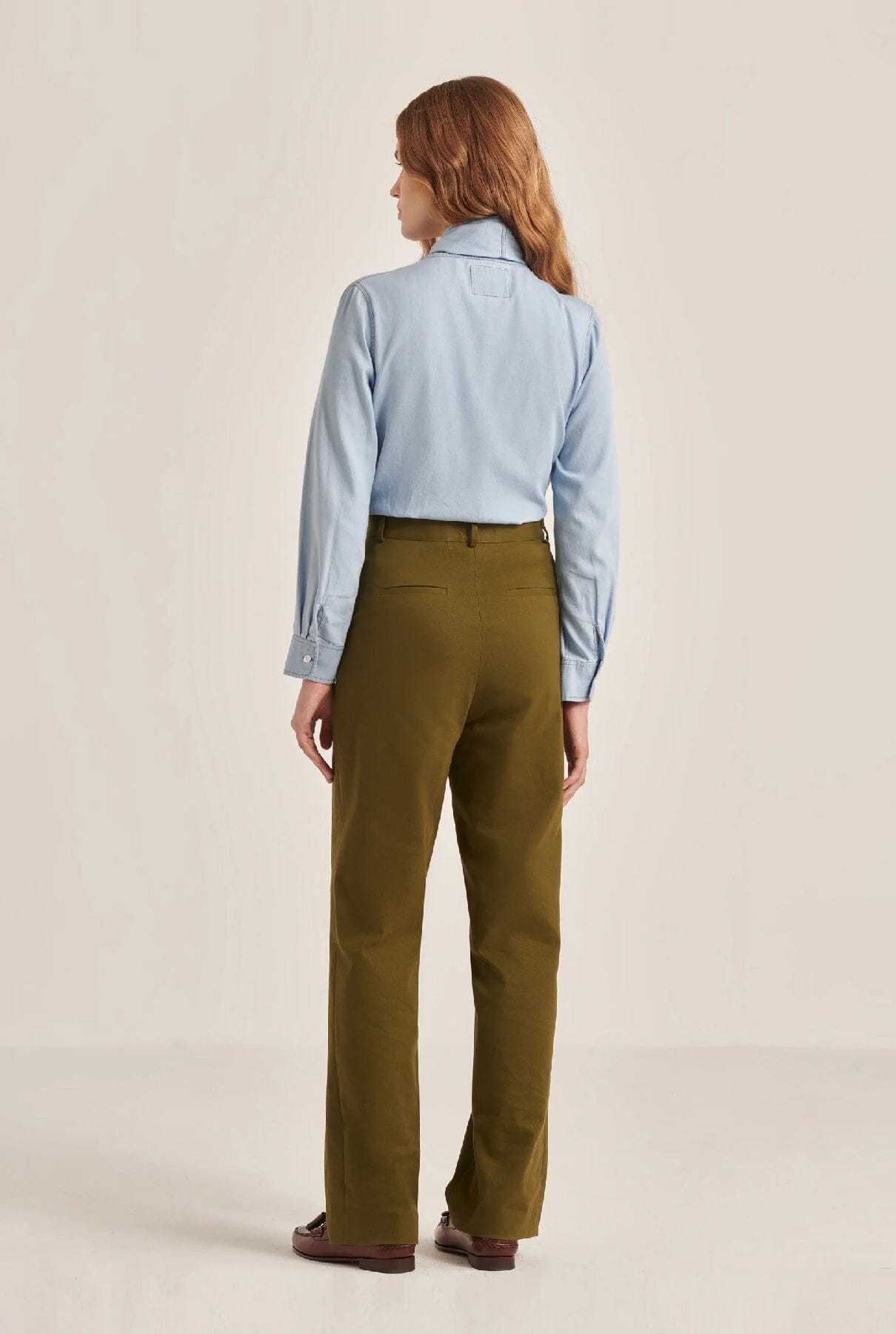 Pantalones chinos de color verde caqui.