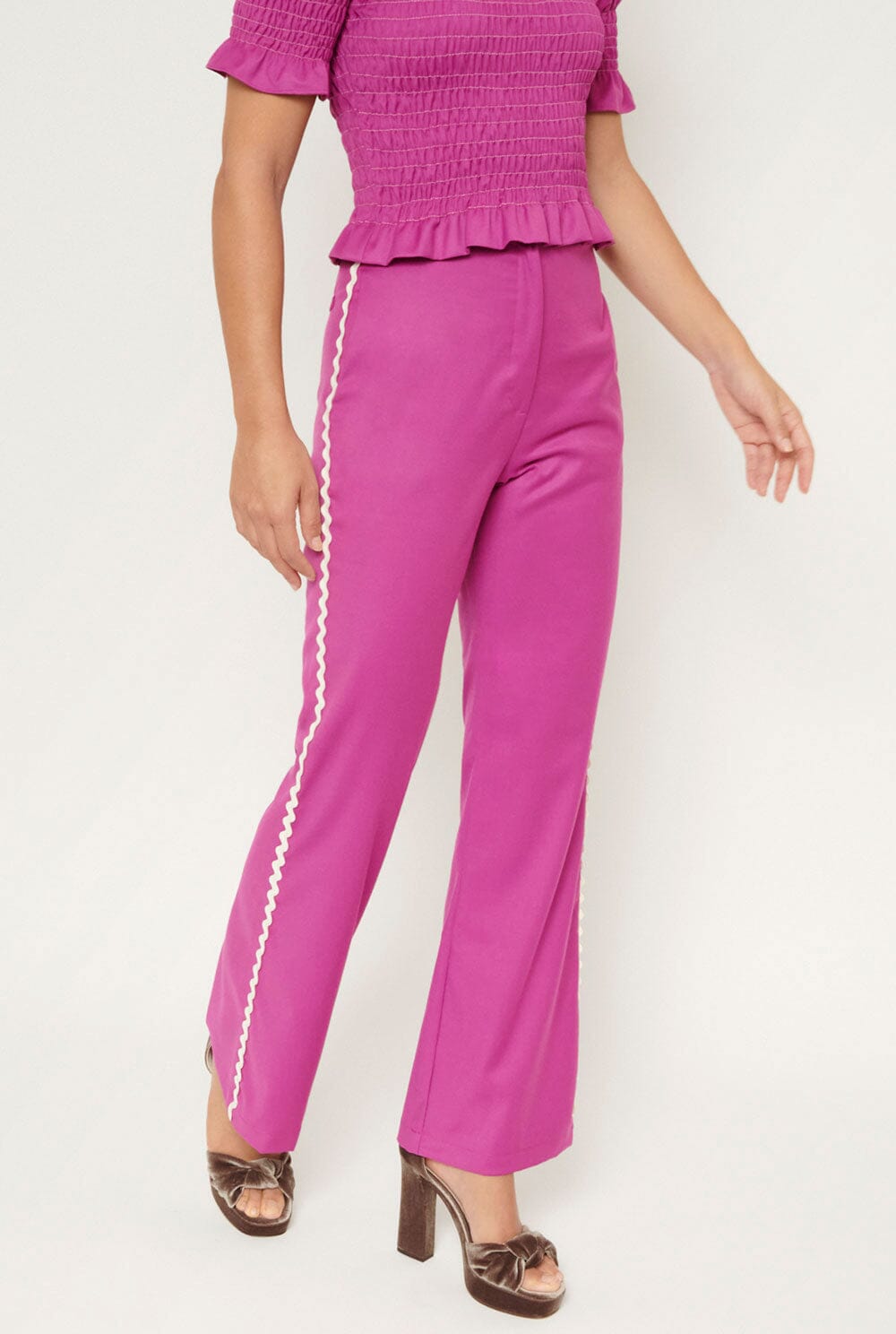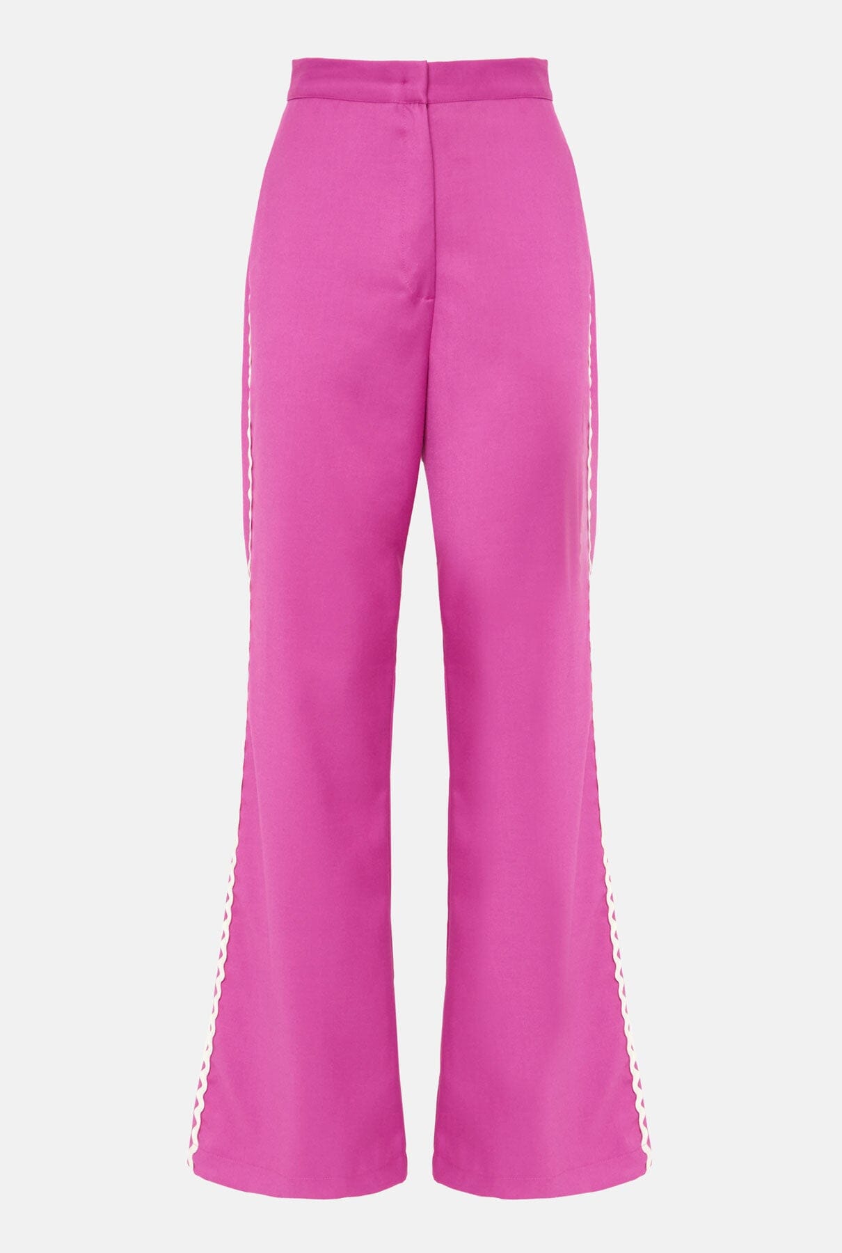 Pantalón estilo palazzo, cierre frontal con botón interior y cremallera en tejido buganvilla. Bolsillos laterales en costura y detalle de falso bolsillo en espalda, organza lateral. Lavar a 30 grados, planchar a baja temperatura o con un pañuelo encima, no secar en secadora, no limpiar en seco y no usar lejía.