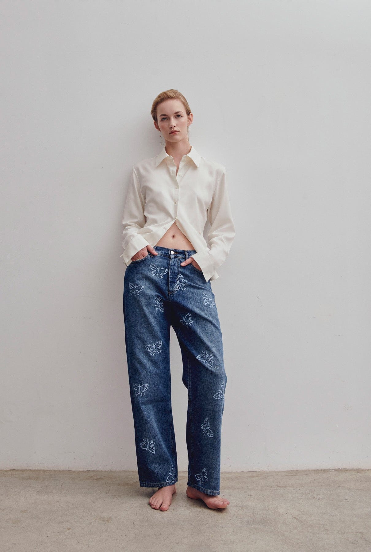 Talle medio y corte amplio de pierna recta. Lavado azul oscuro. Mariposas diseñadas por La Beltraneja, bordadas por todo el pantalón. Cierre de bragueta con botones.