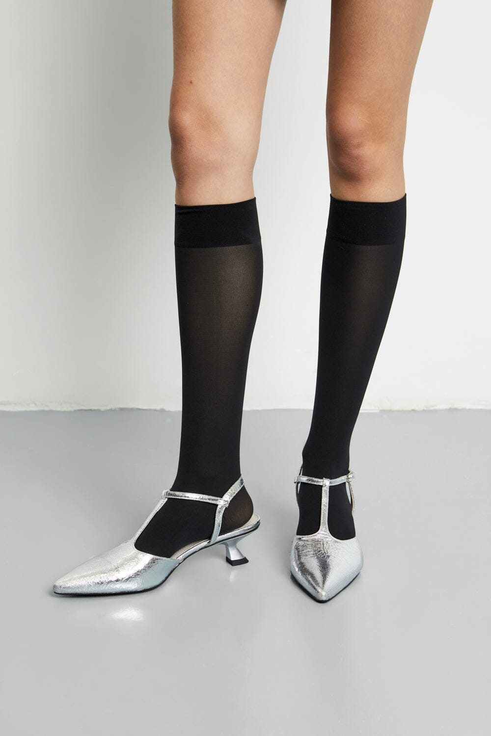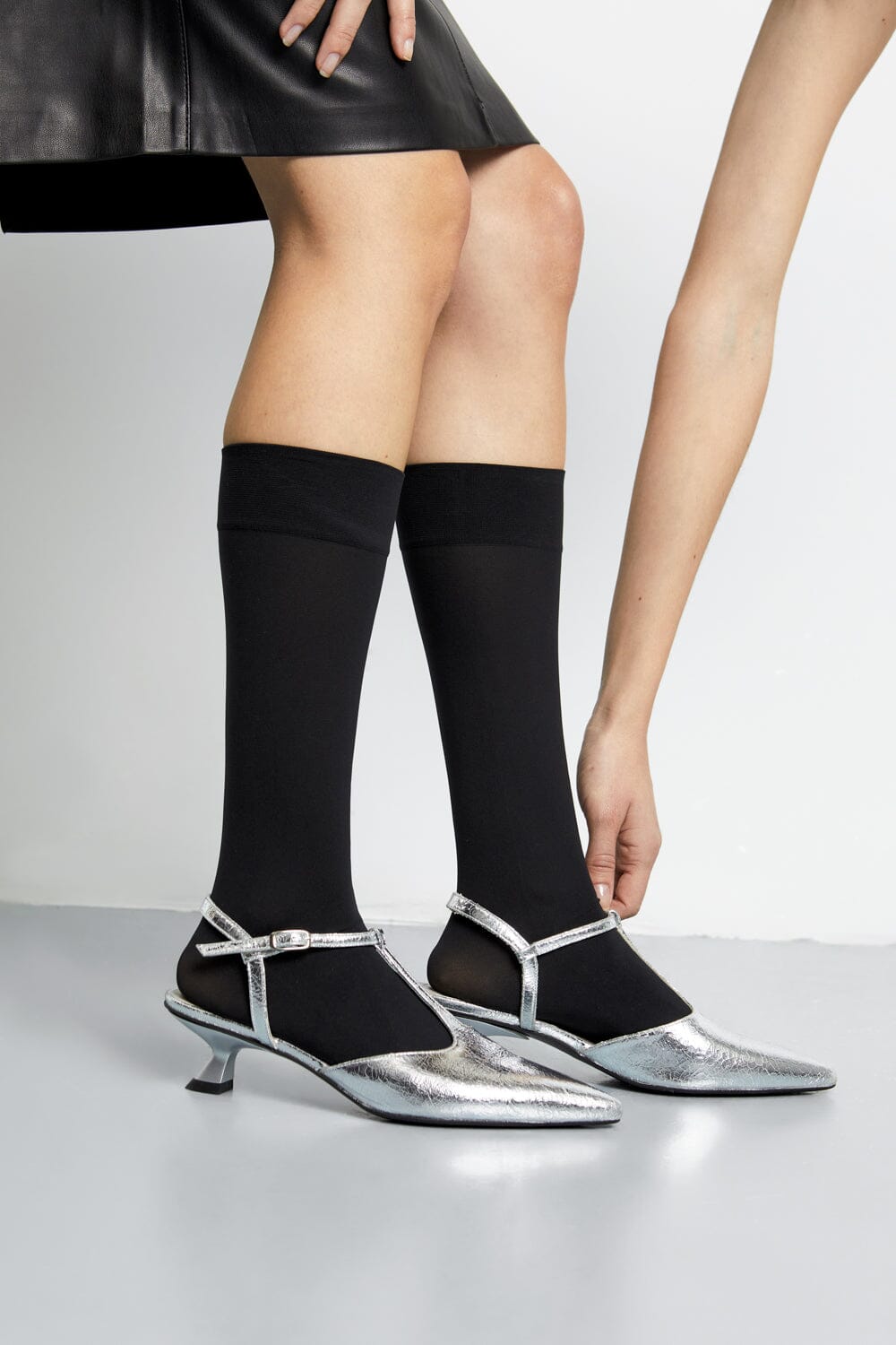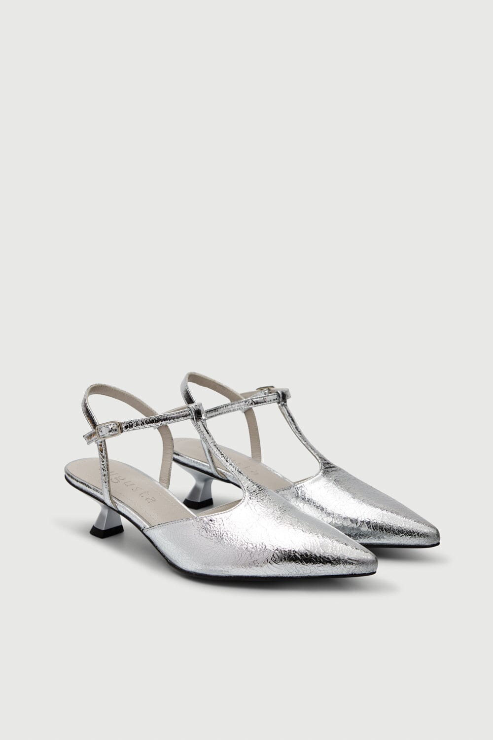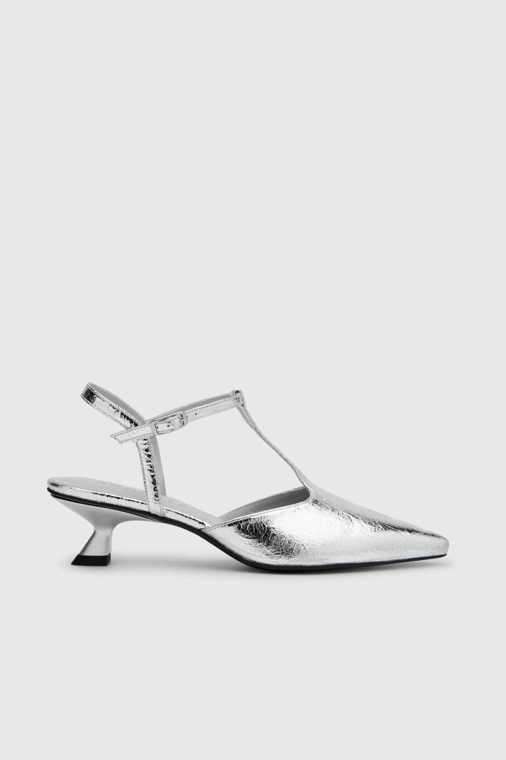 We join the return of pointy shoes with these new pumps. Camila is our first pointy silhouette. The design has a vintage air reminiscent of shoes from the 20s, but it's a geometric heel that gives it a trendy touch. This one is painted in silver to match upper leather tone and has a comfortable height of 5 cm.