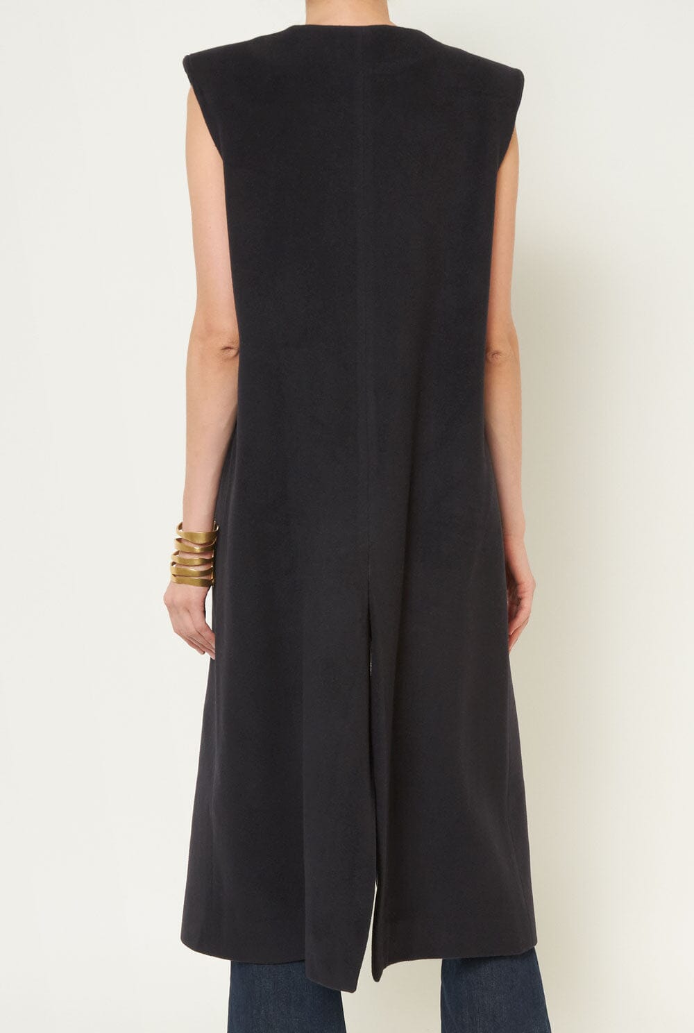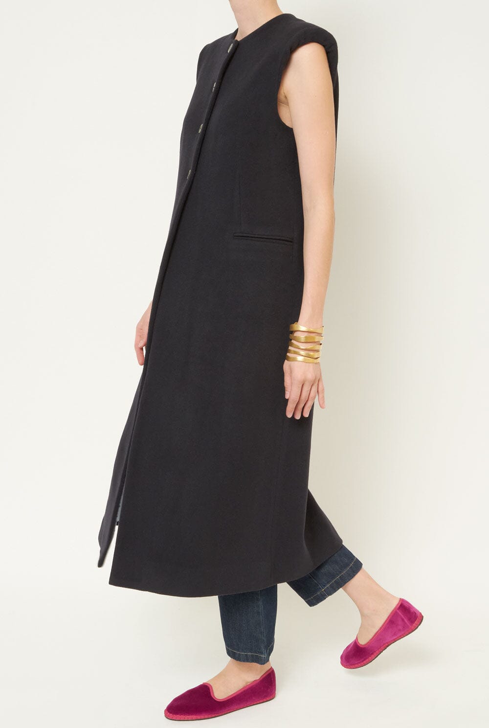 REINVENCIÓN de Benedetta Perazzo EDICIÓN EXCLUSIVA. Chaleco largo confeccionado en tejido mezcla de lana. Cuello tipo caja. Botones hasta la cintura. Hombreras altas y bolsillos laterales. Abertura trasera y forro tono sobre tono.