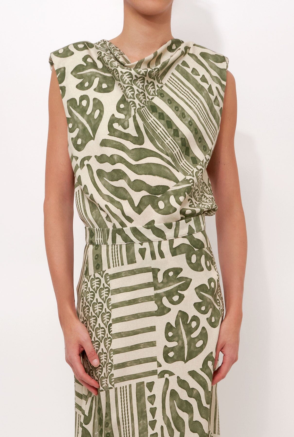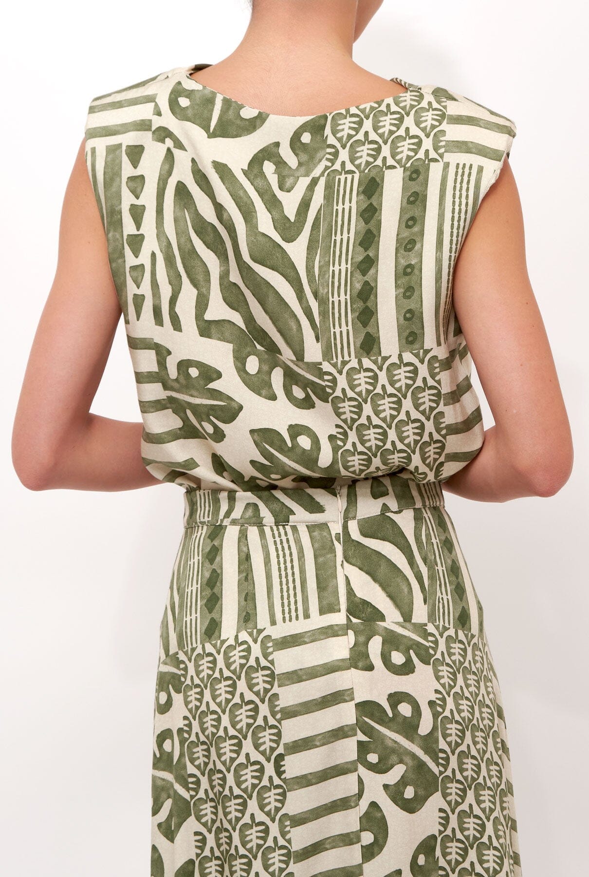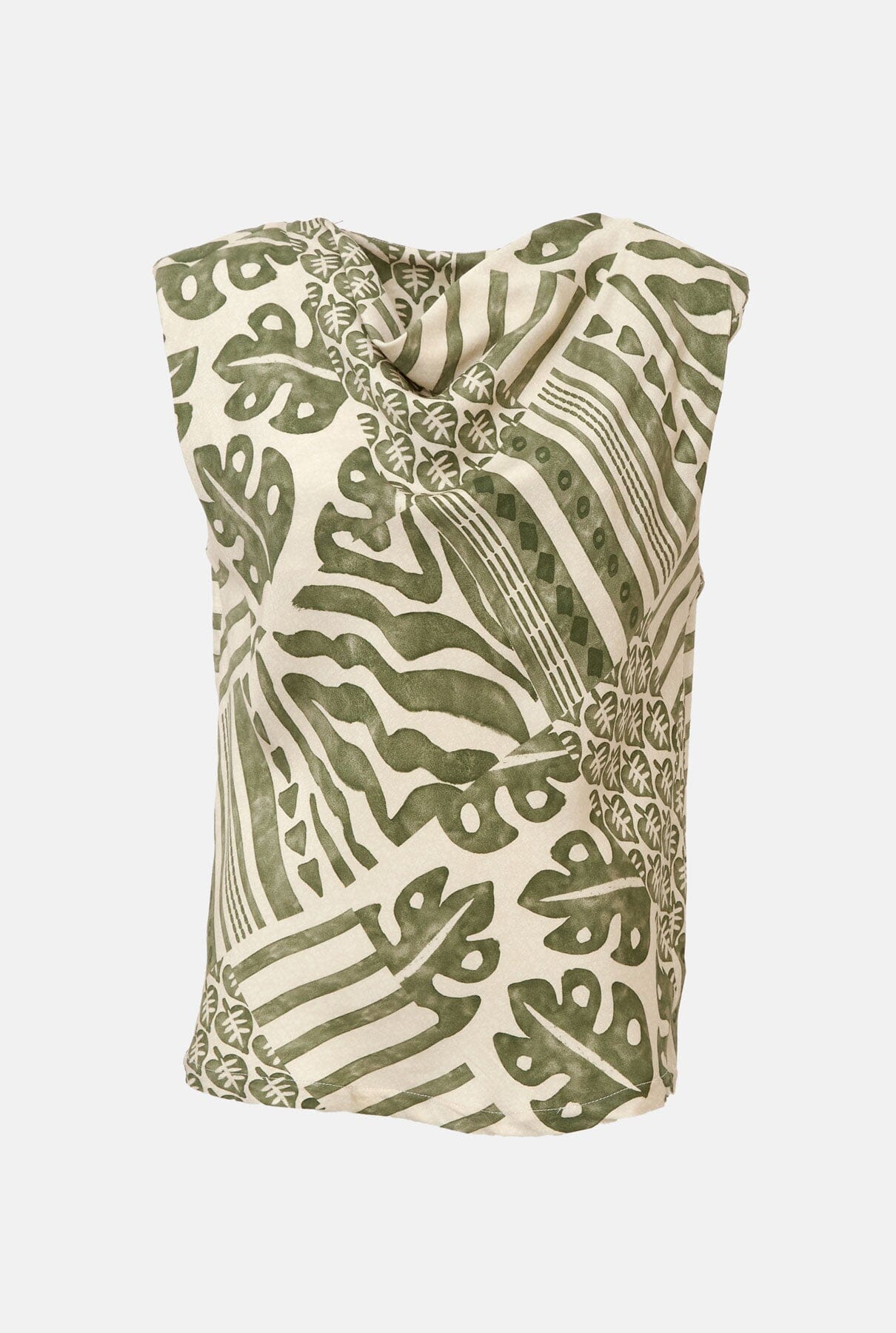 Top en tejido estampado verde y beige con cuello redondo y manga sisa con hombreras.