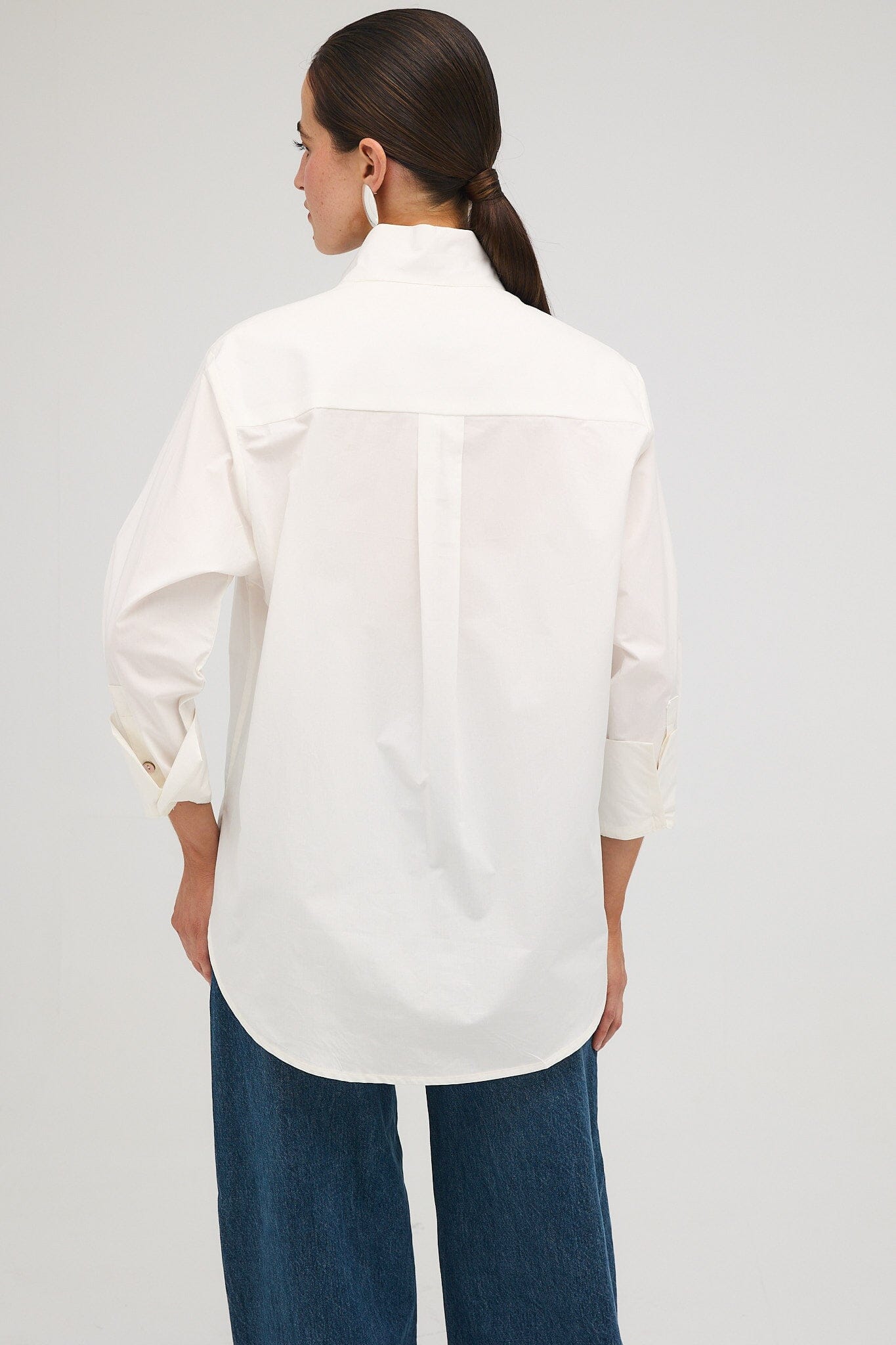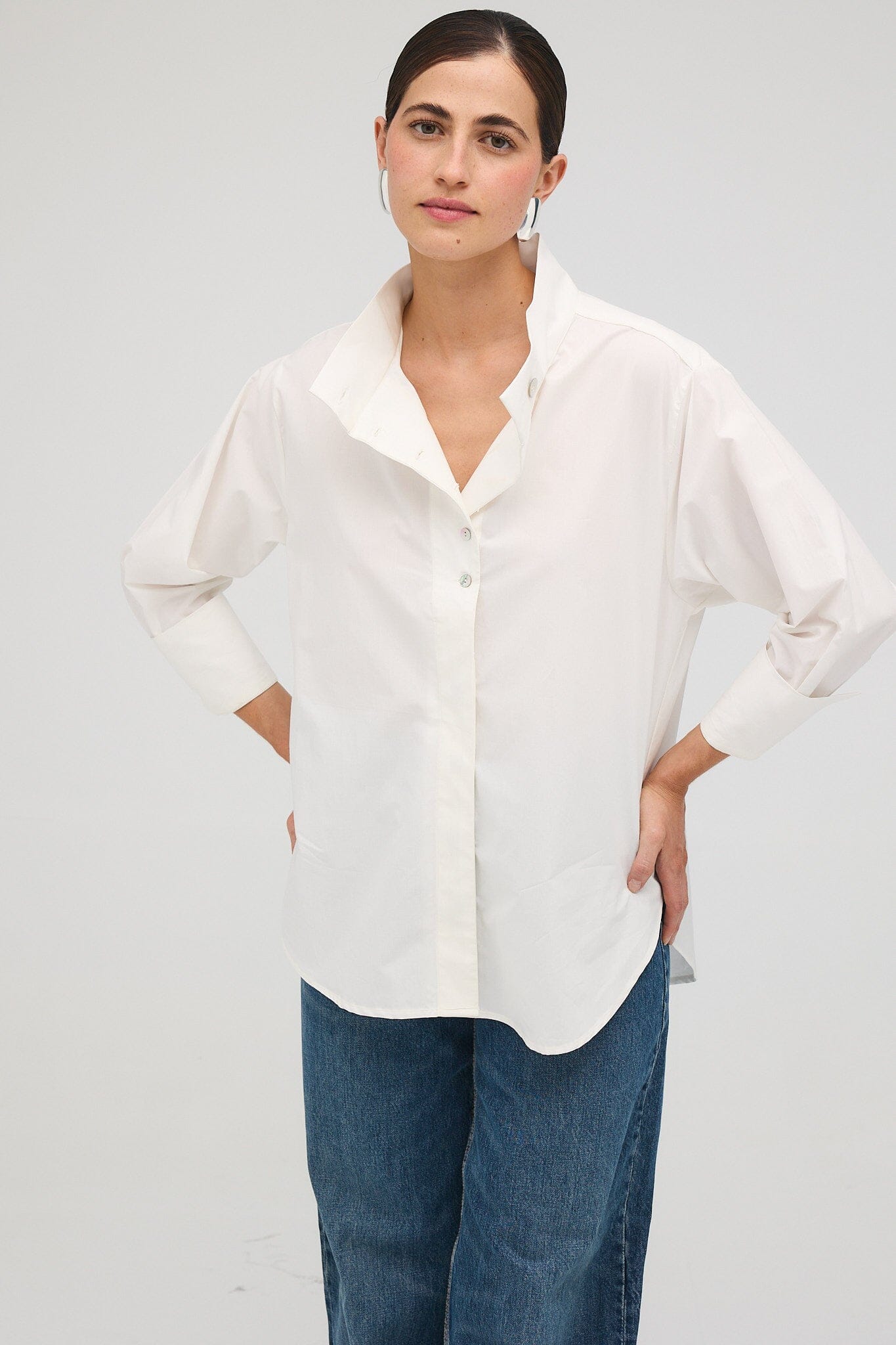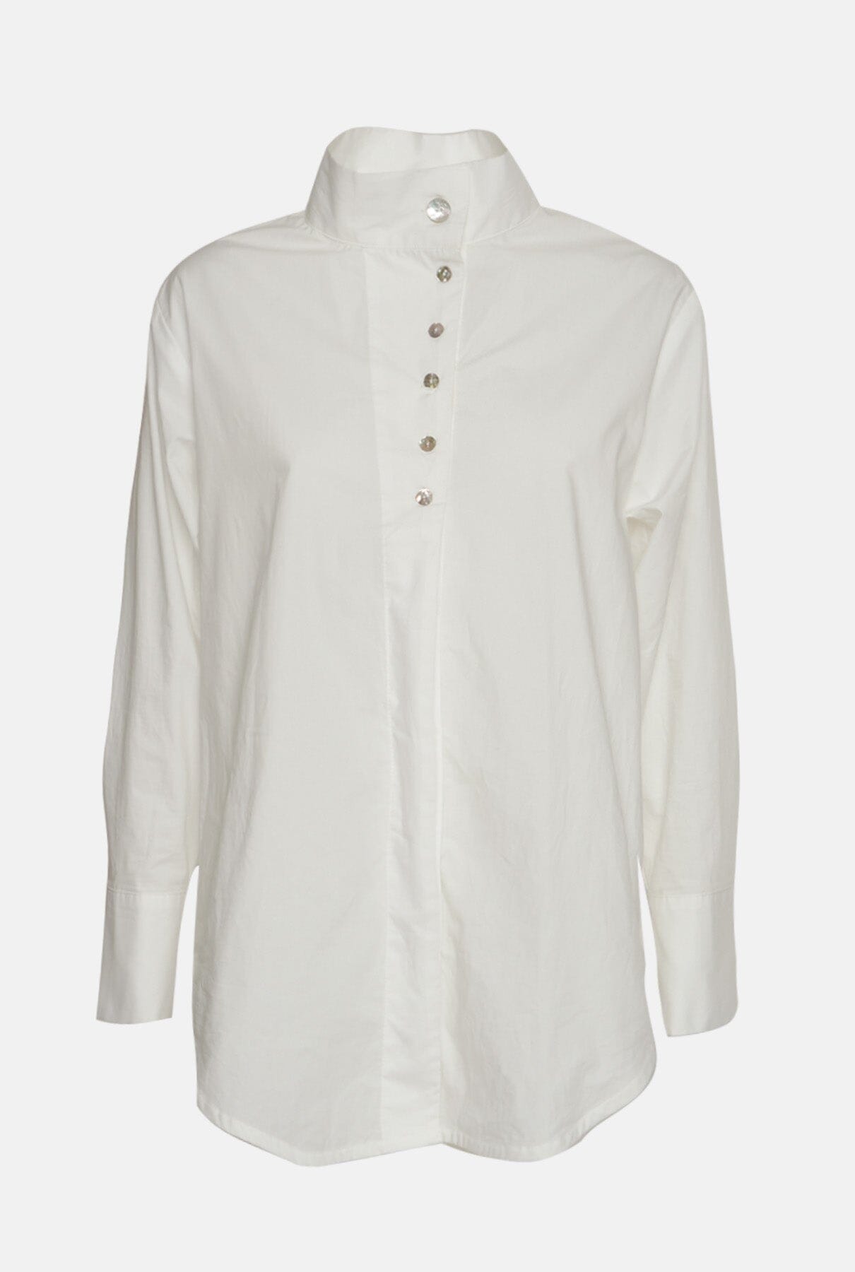 Camisa oversize en popelina de algodón de color blanco. Tiene una tapeta asimétrica y un cuello alto muy favorecedor tanto abierto como cerrado. Tiene un cierre de botones muy especial con botones de nácar.