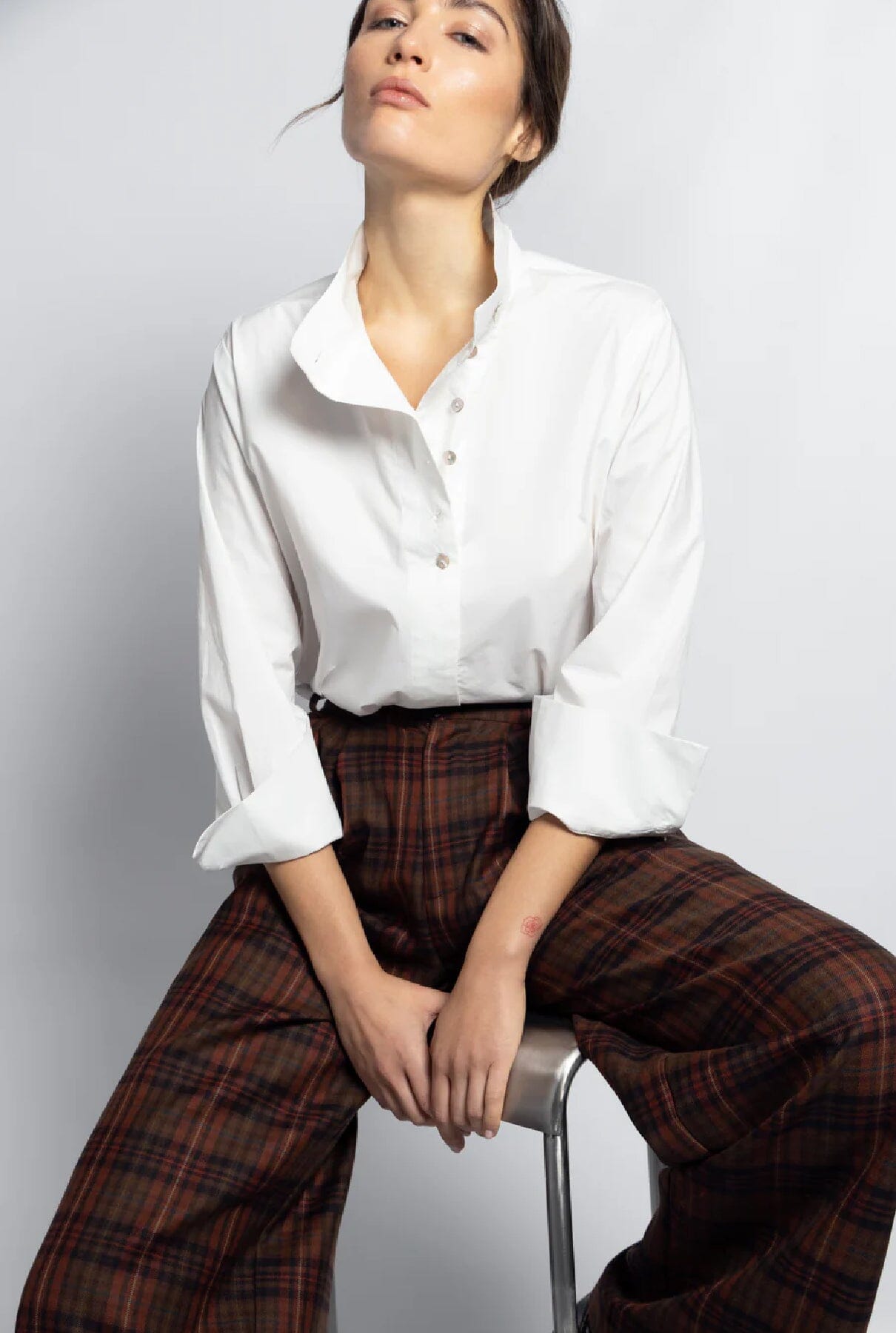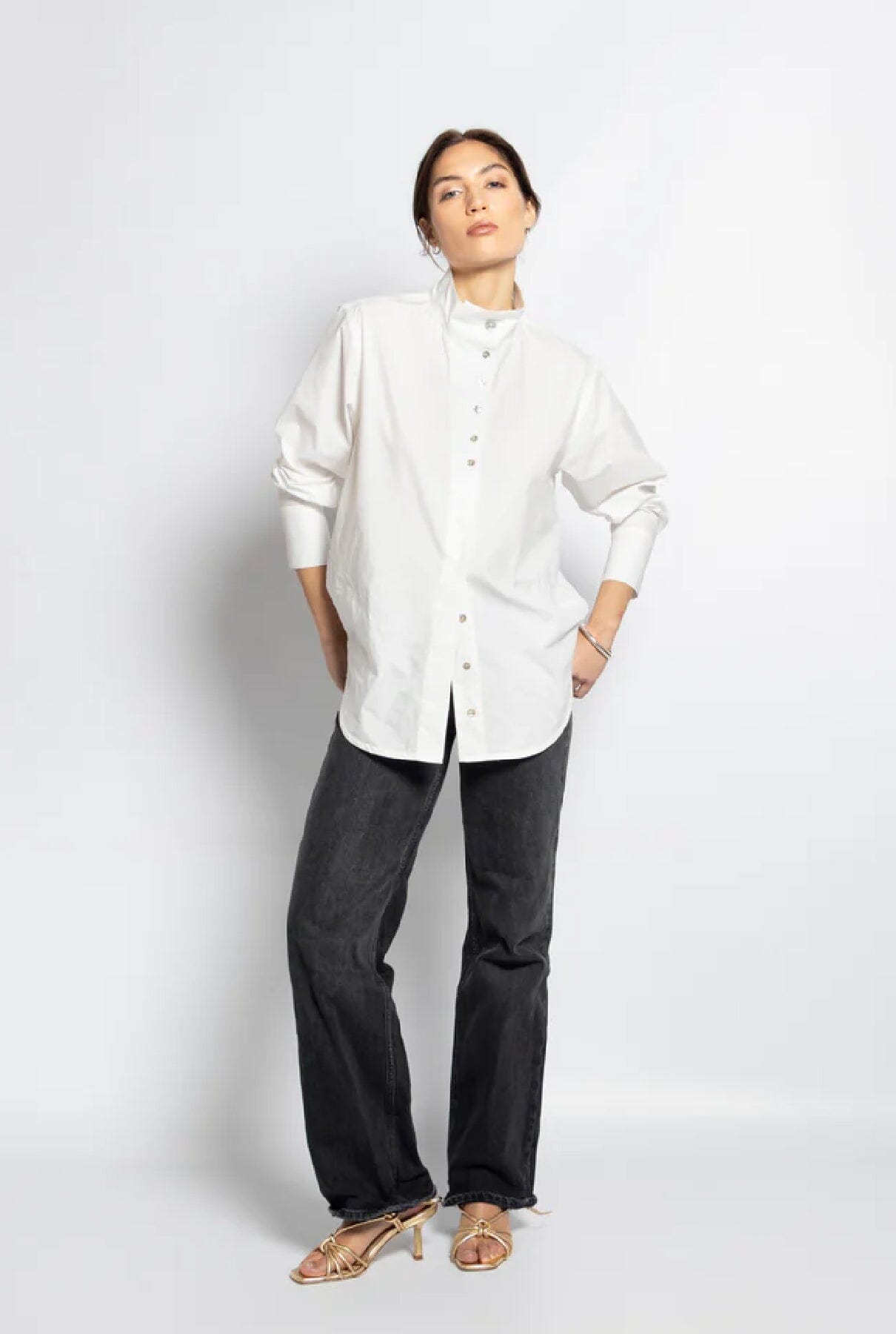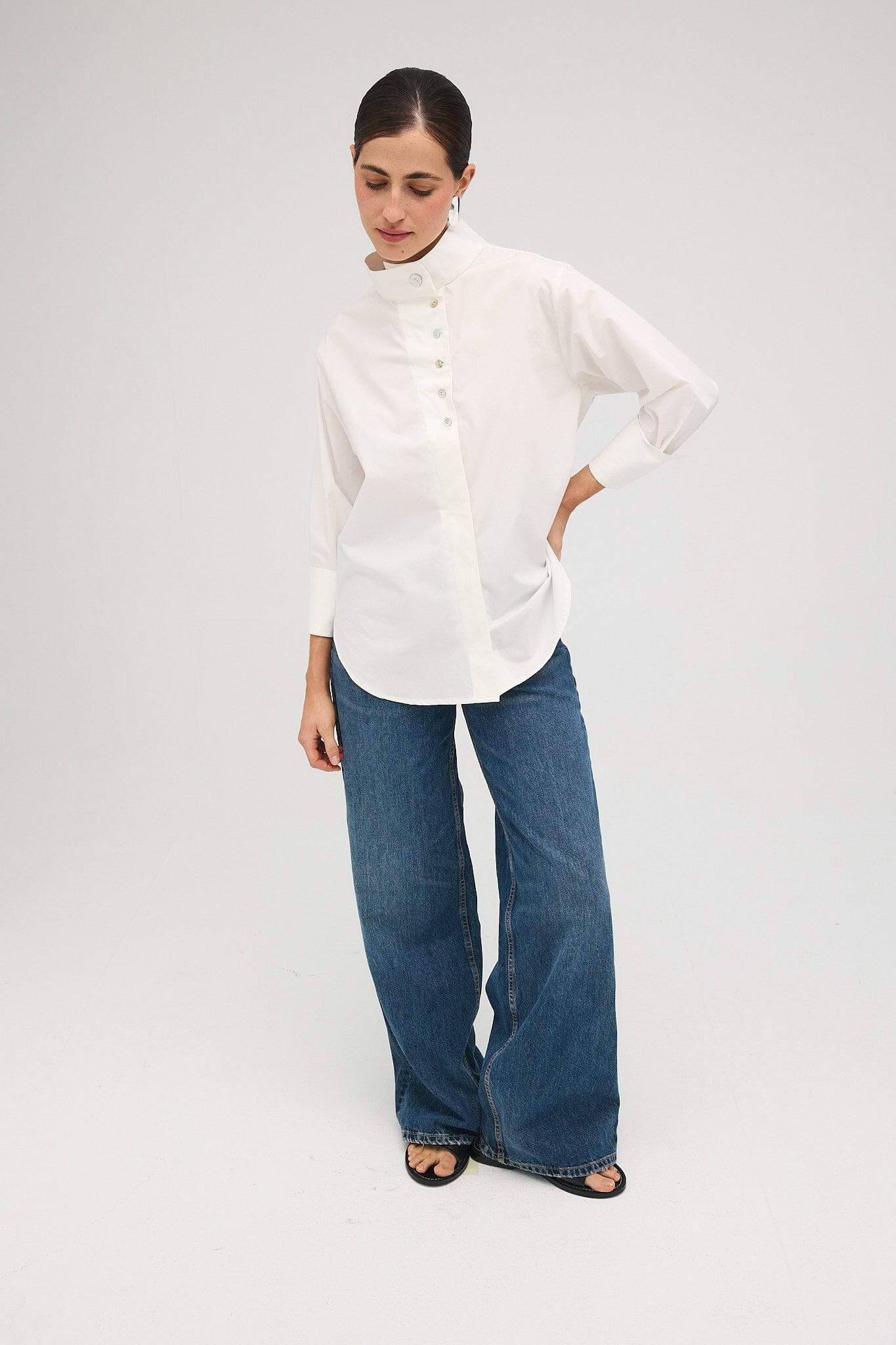 Camisa oversize en popelina de algodón de color blanco. Tiene una tapeta asimétrica y un cuello alto muy favorecedor tanto abierto como cerrado. Tiene un cierre de botones muy especial con botones de nácar.