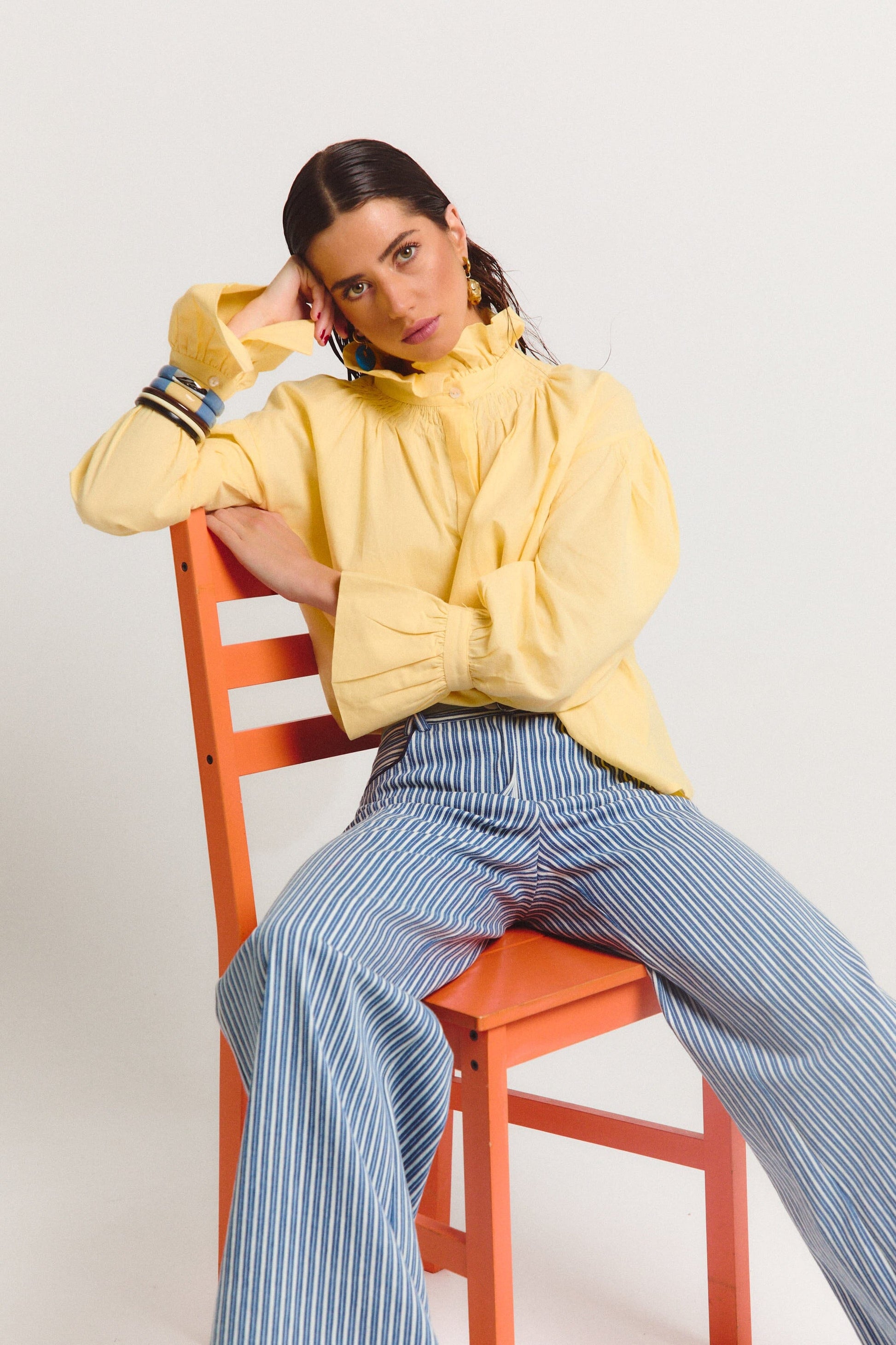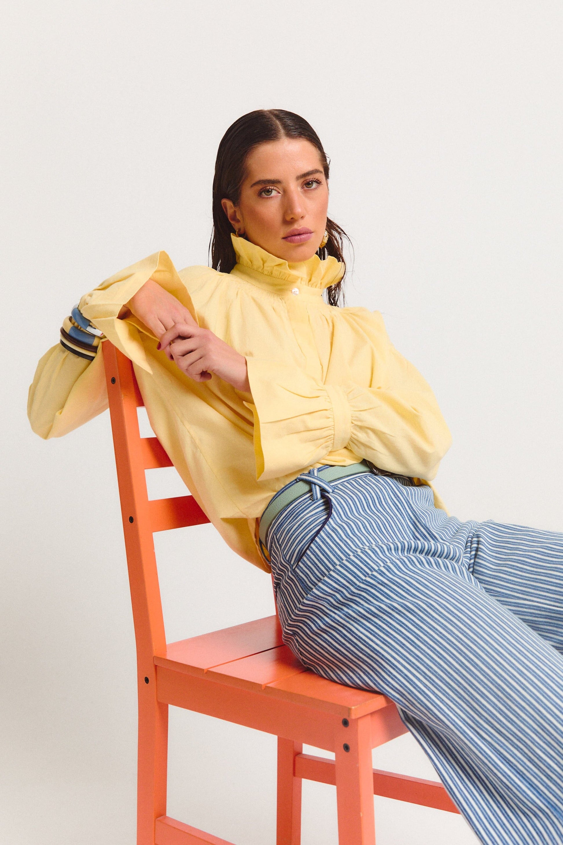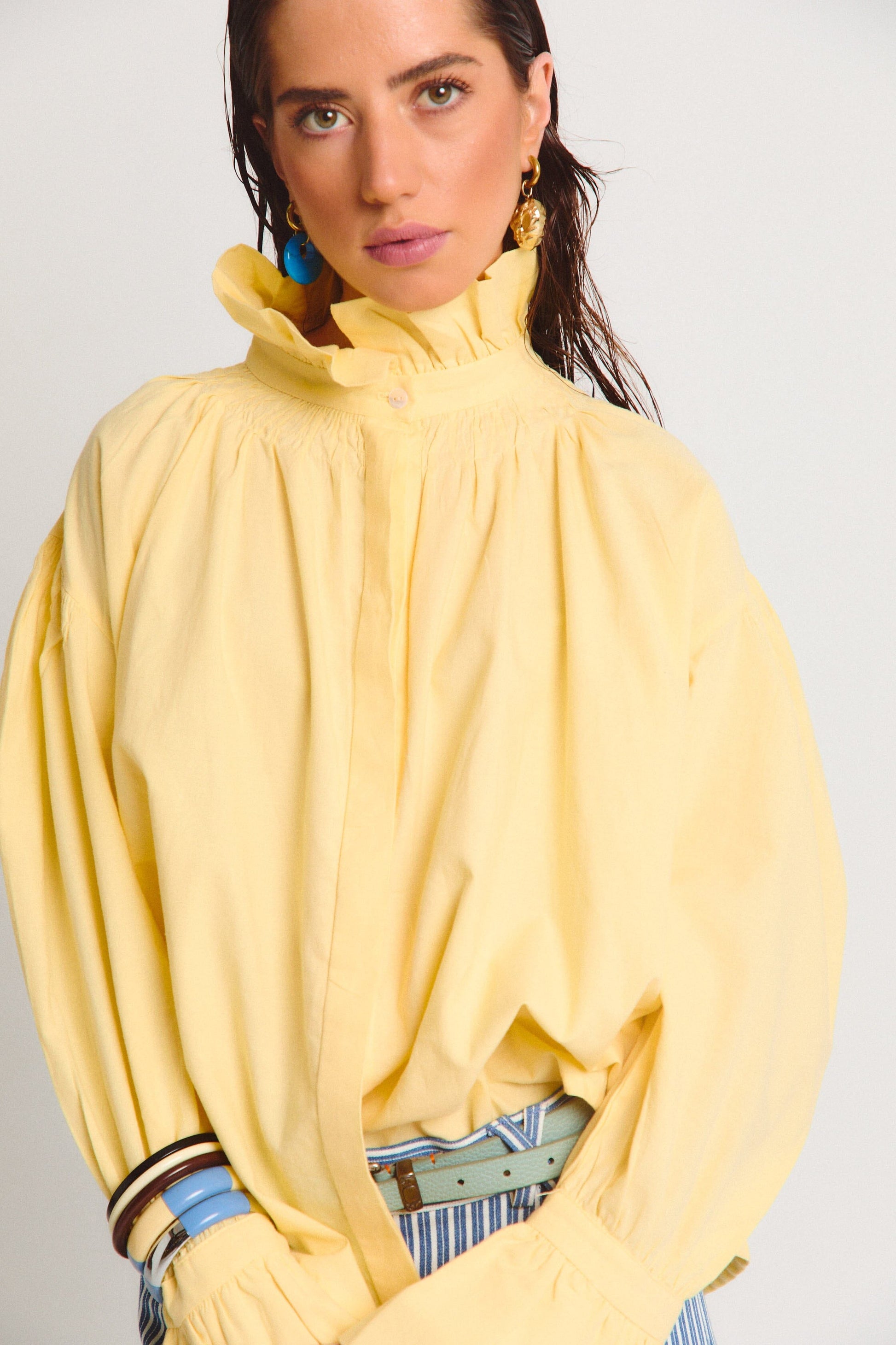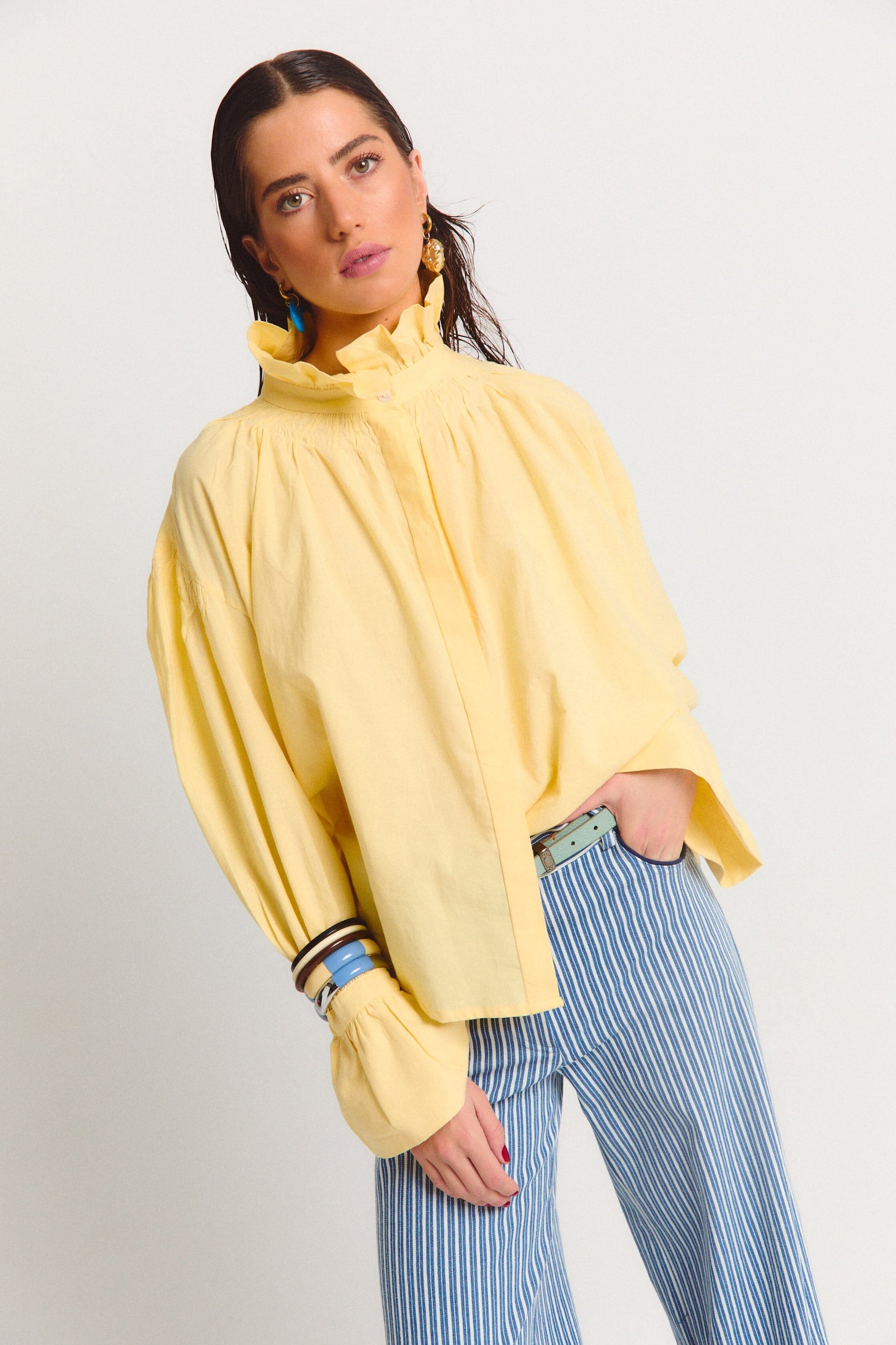 Camisa holgada en tejido de algodón con cuello alto fruncido.