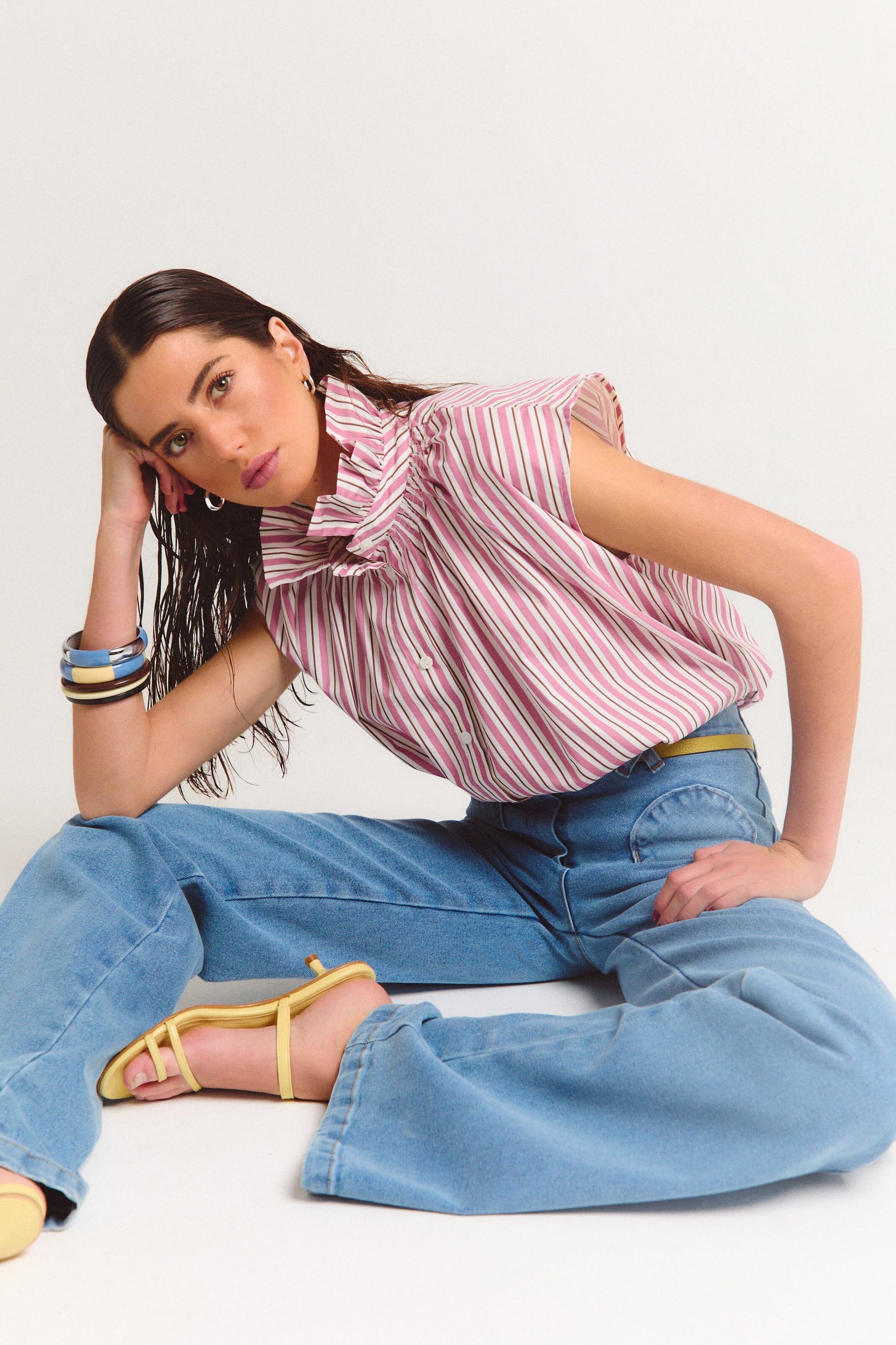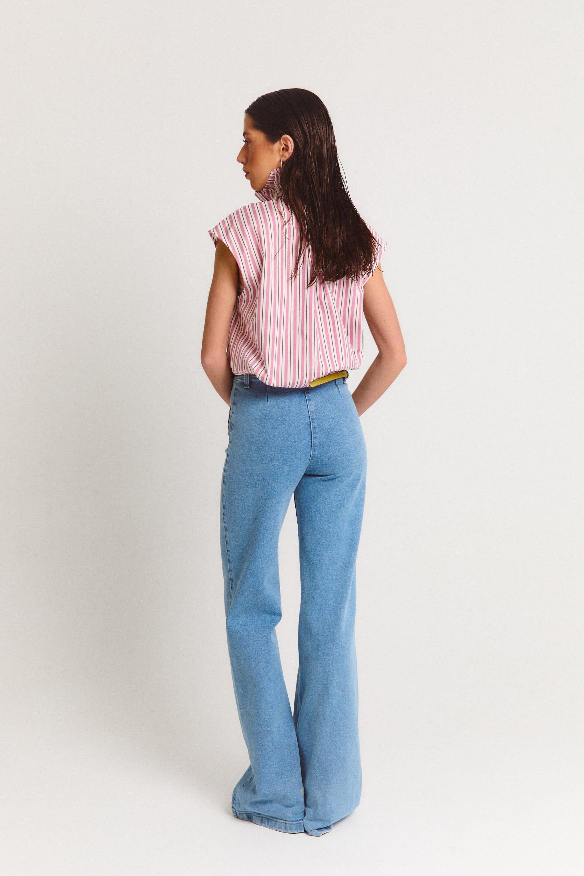 Camisa holgada de popelina a rayas. Cuello alto fruncido.