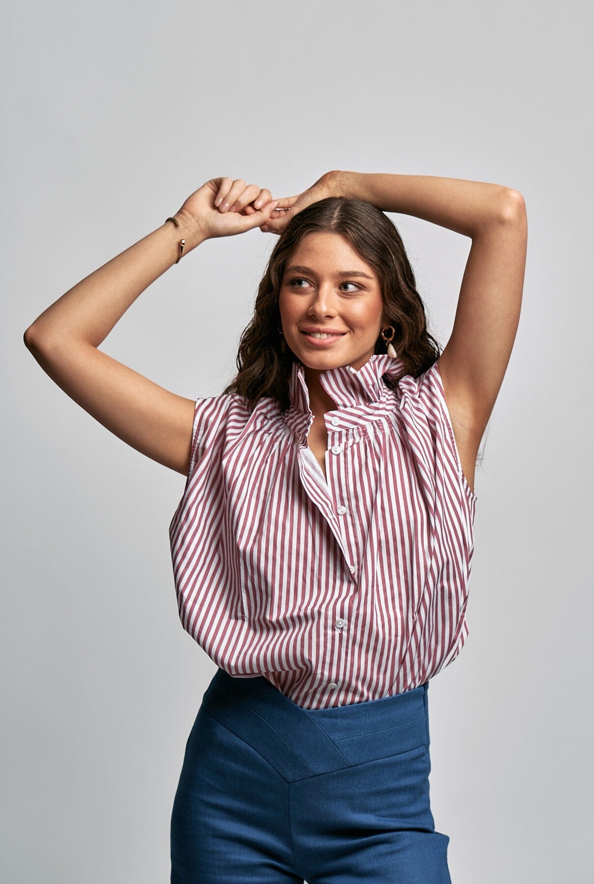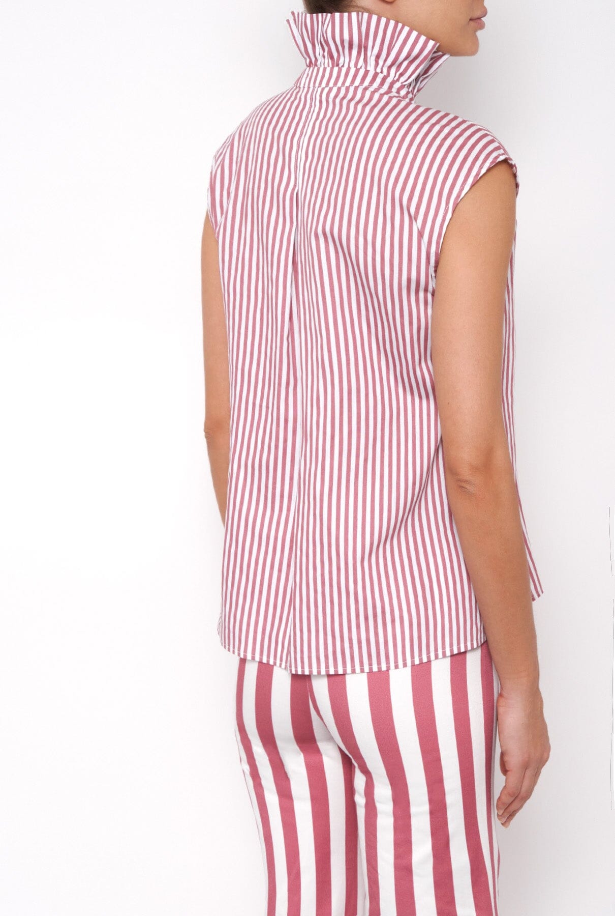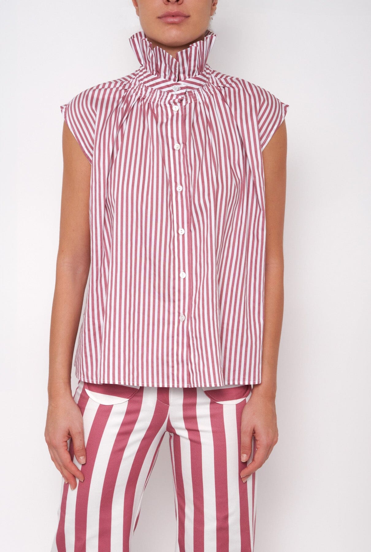 Camisa holgada en tejido de algodón a rayas. Cuello alto fruncido que favorece mucho.