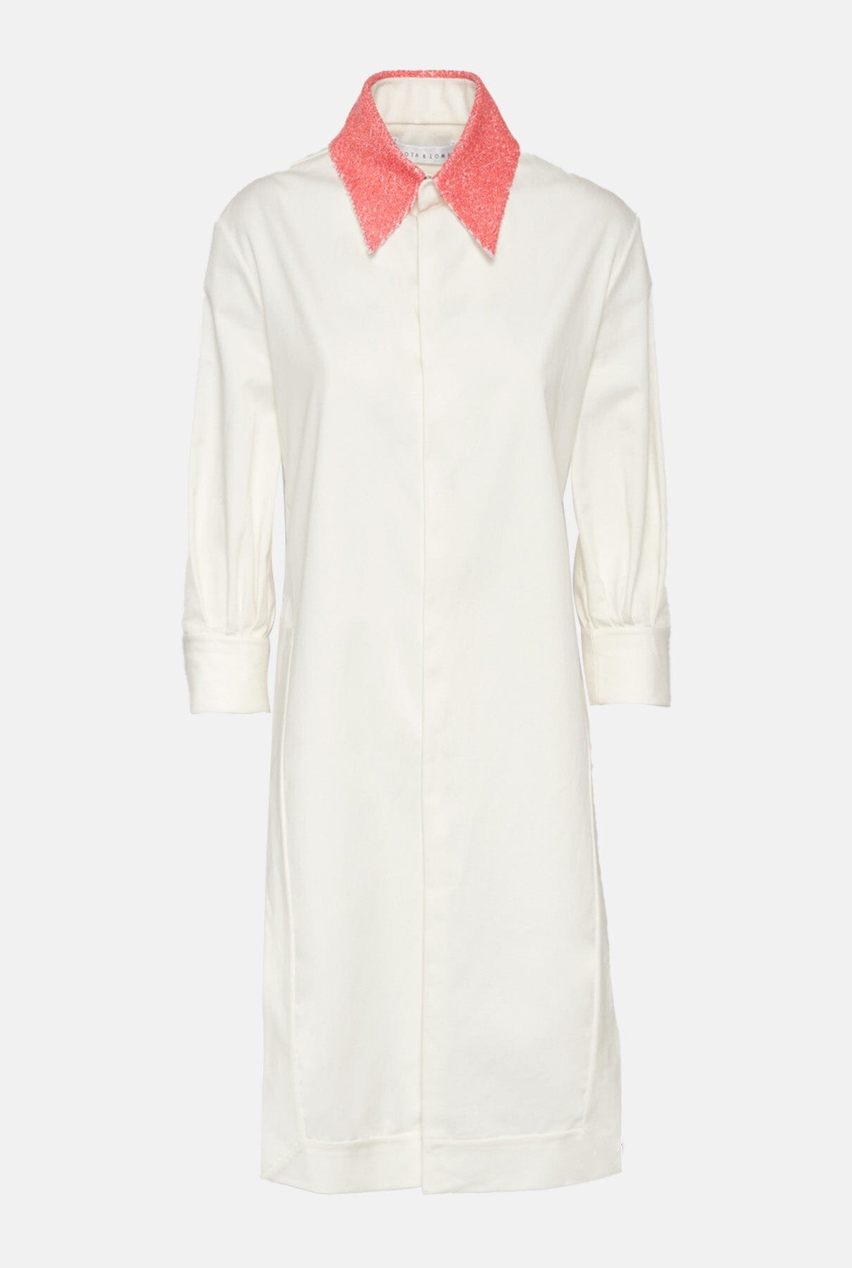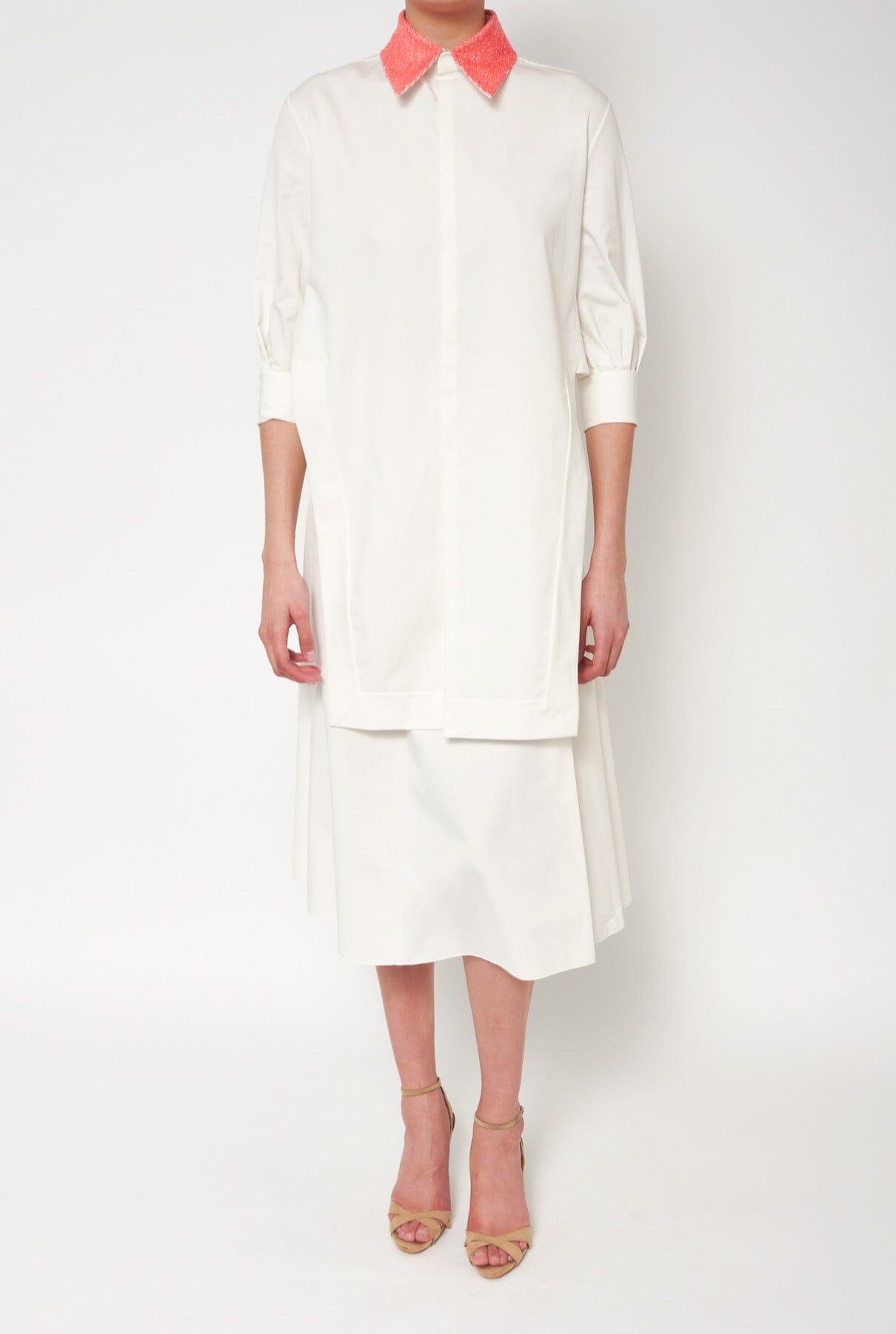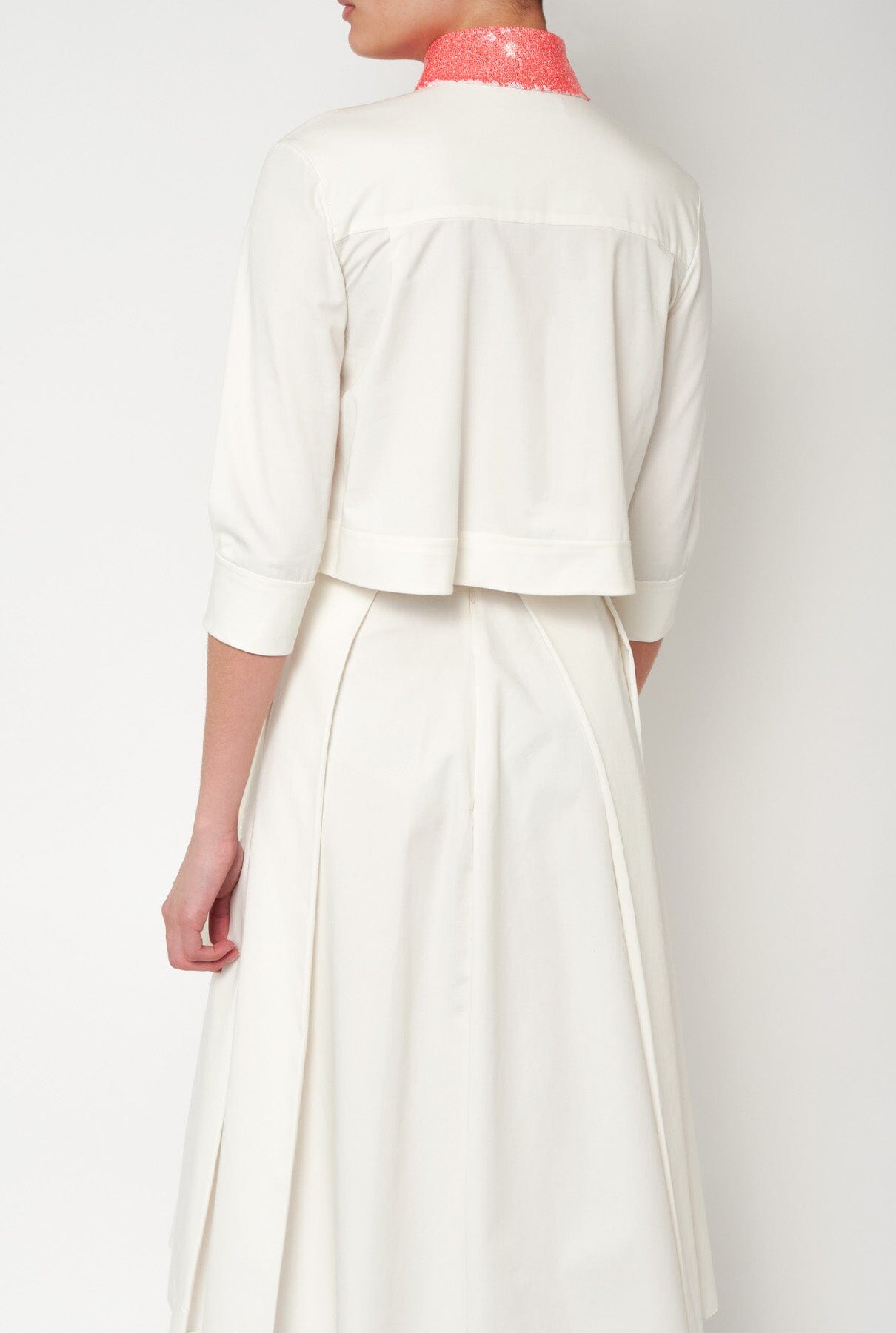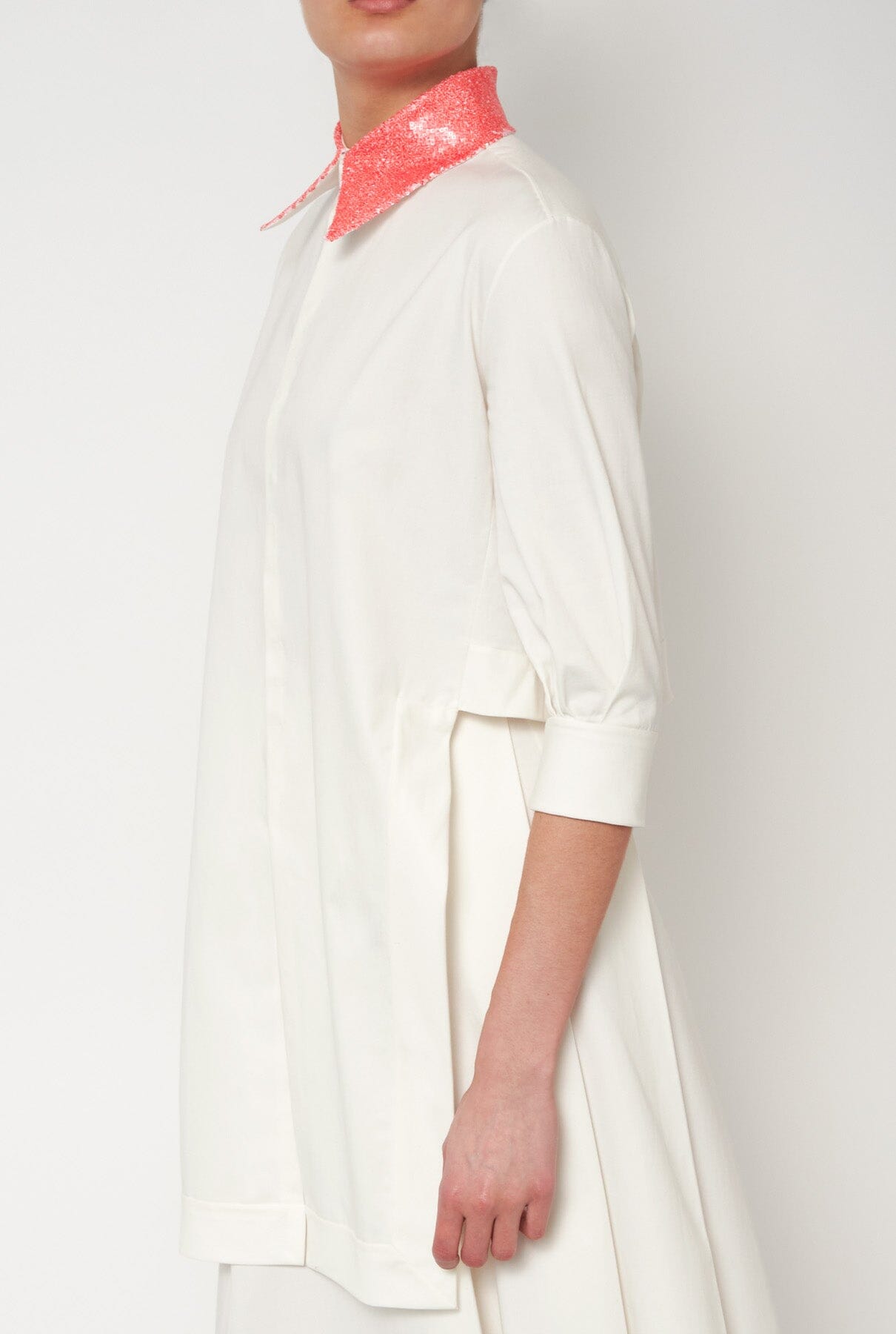 Camisa blanca con cuello de lentejuelas naranja en la parte delantera.