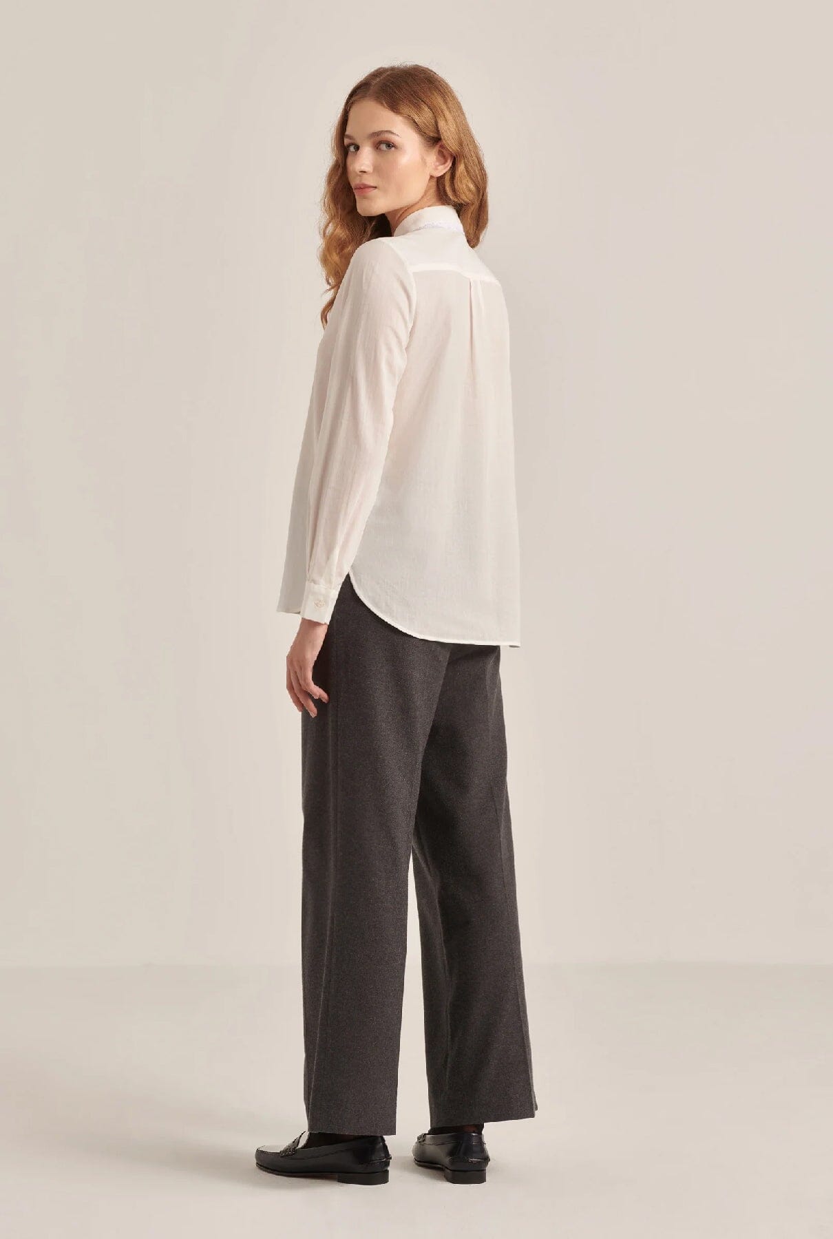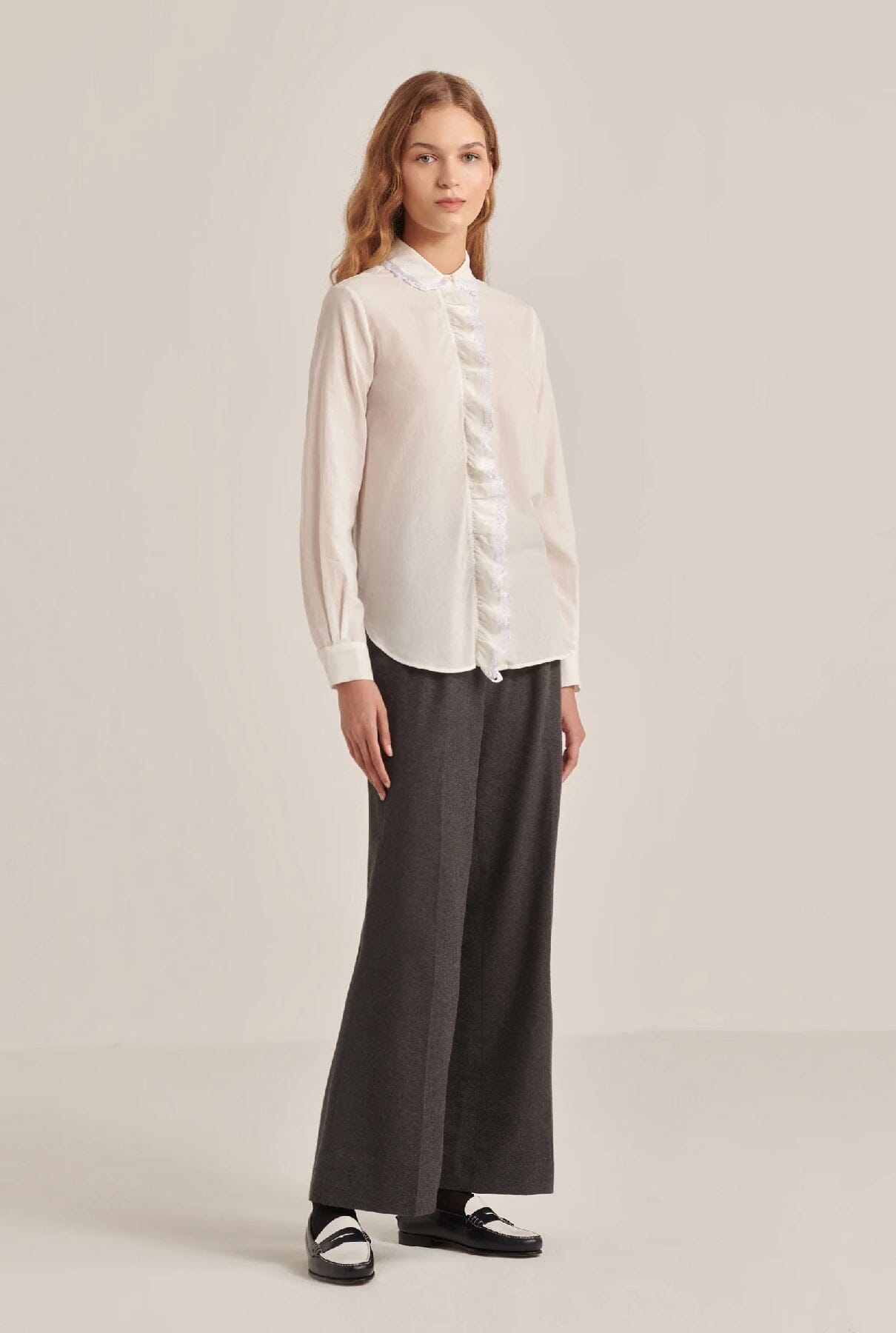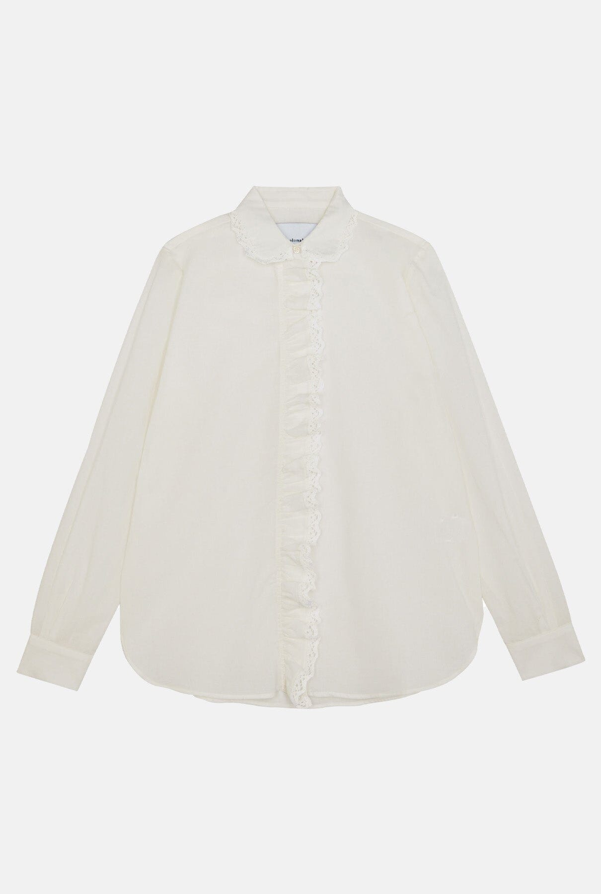 Camisa blanca de cuello alto con volante bordado.