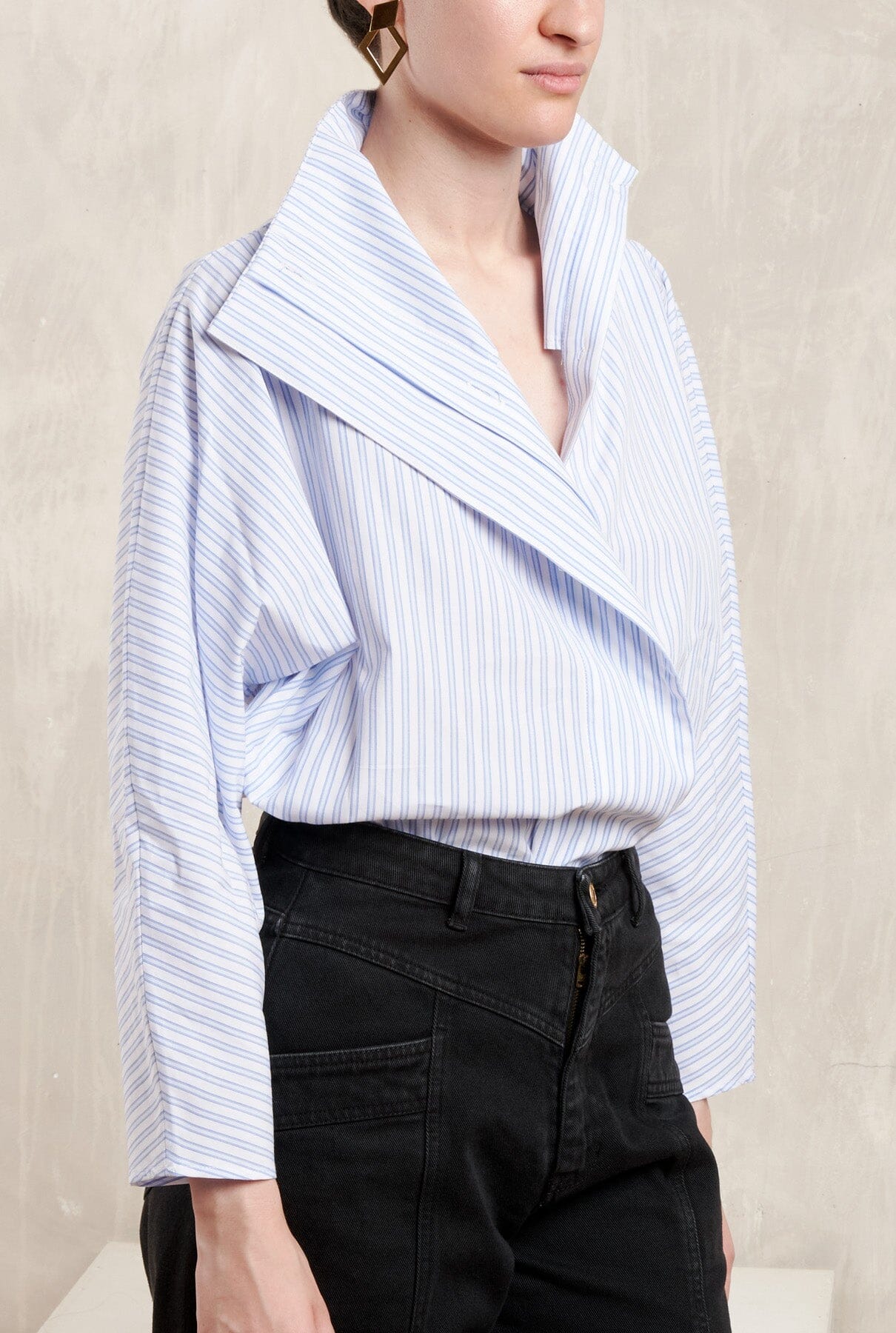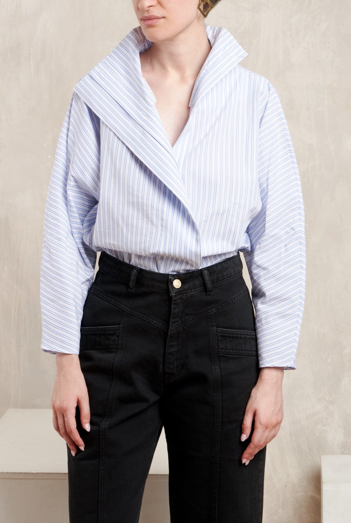 PRE ORDER. Camisa de popelín de algodón con manga japonesa, cuello alto y apertura lateral.