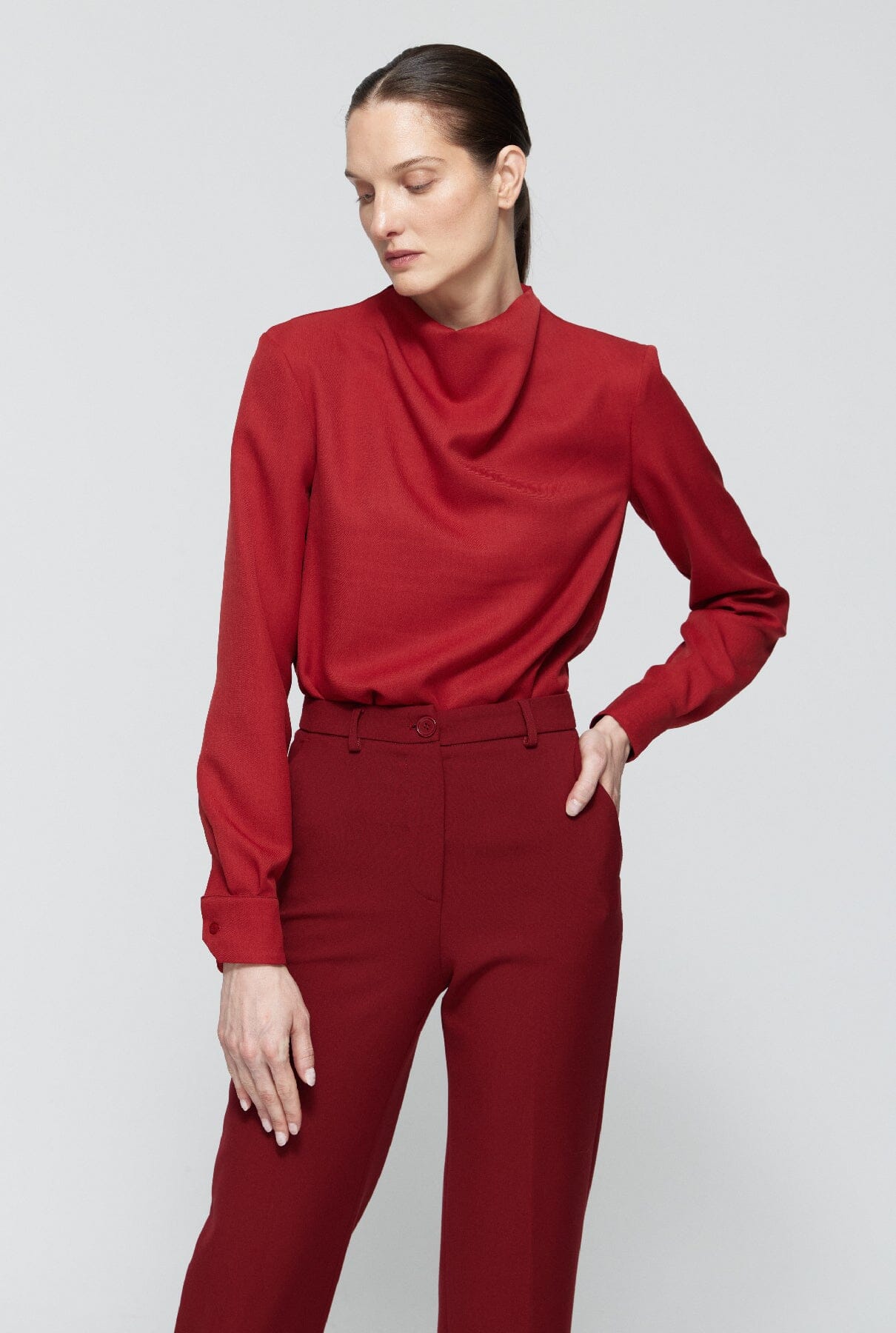En esta colección la firma apuesta por una camisa drapeada de cuello perkins confeccionada en un tejido de gran caída y suavidad. Una pieza que derrocha feminidad y elegancia.