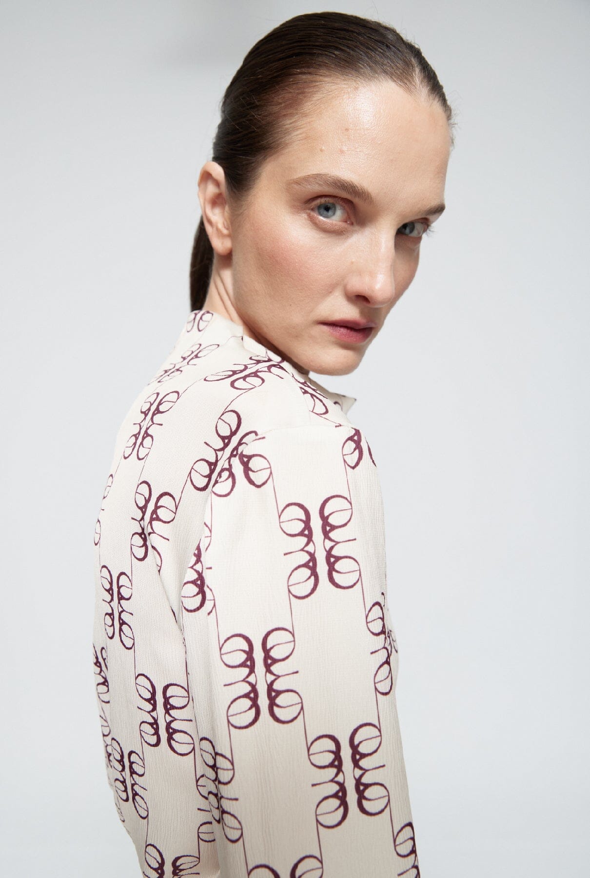 Esta nueva identidad se incorpora a la colección dando vida a un sofisticado estampado en tonos crudo y burdeos, presente en una camisa drapeada con cuello perkins. Una pieza única con la que marcar tendencia y estilo.