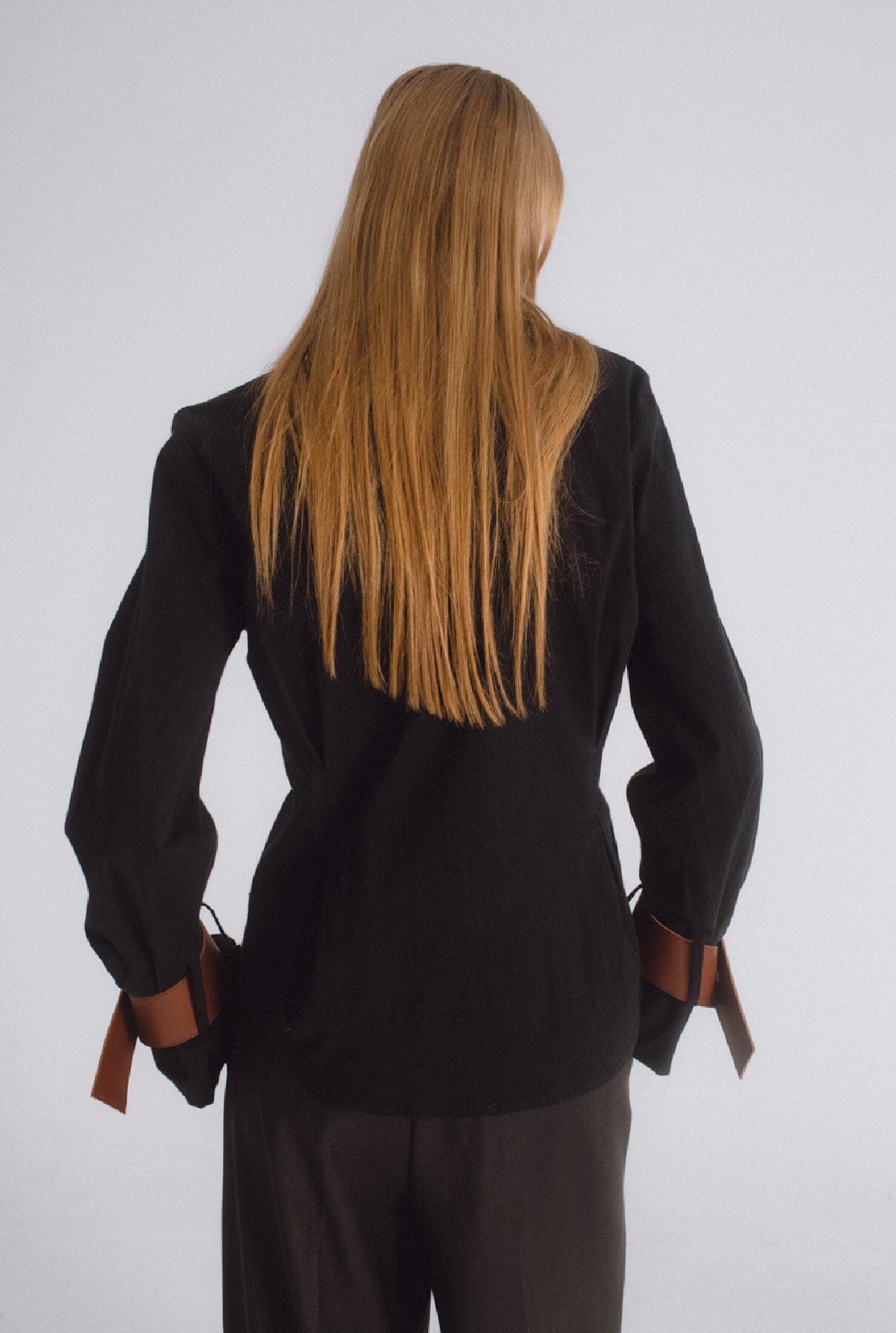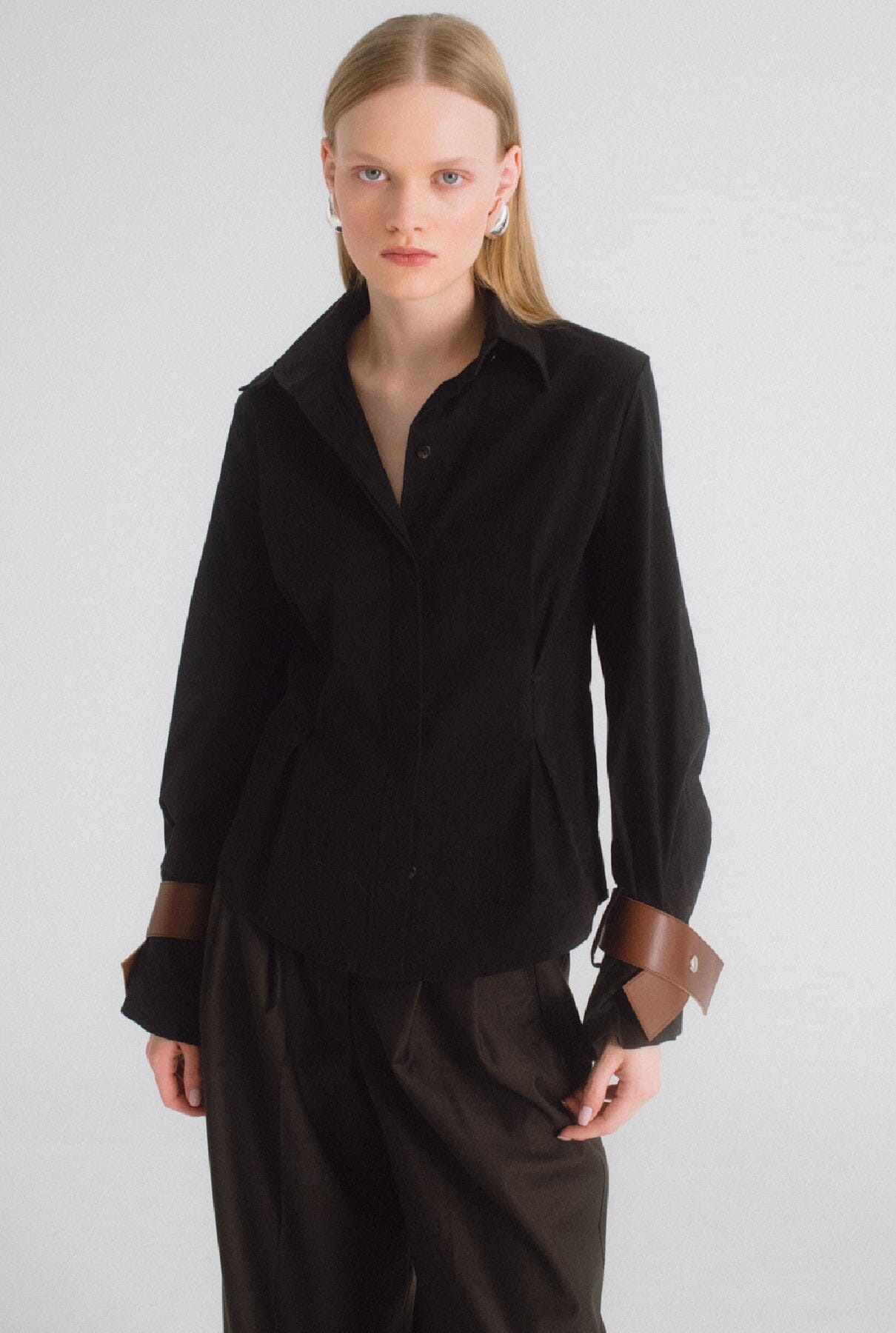 Camisa entallada negra con detalle marrón