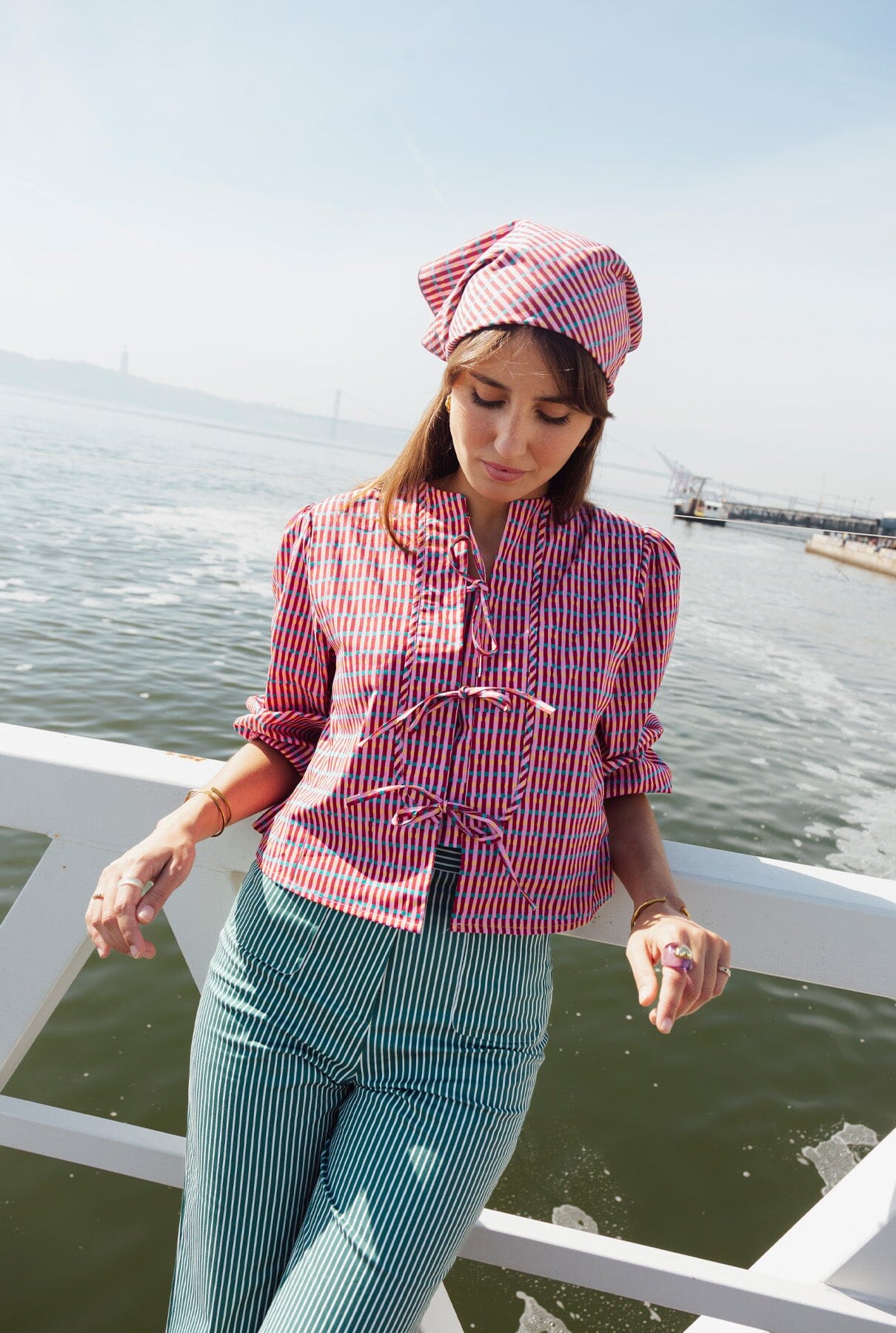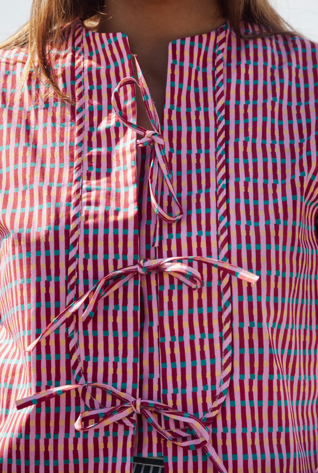 Camisa estampada en tonos rosas con cuello redondo y mangas con volumen. Cierre frontal con tres trabillas. Muy femenina, versátil y favorecedora.