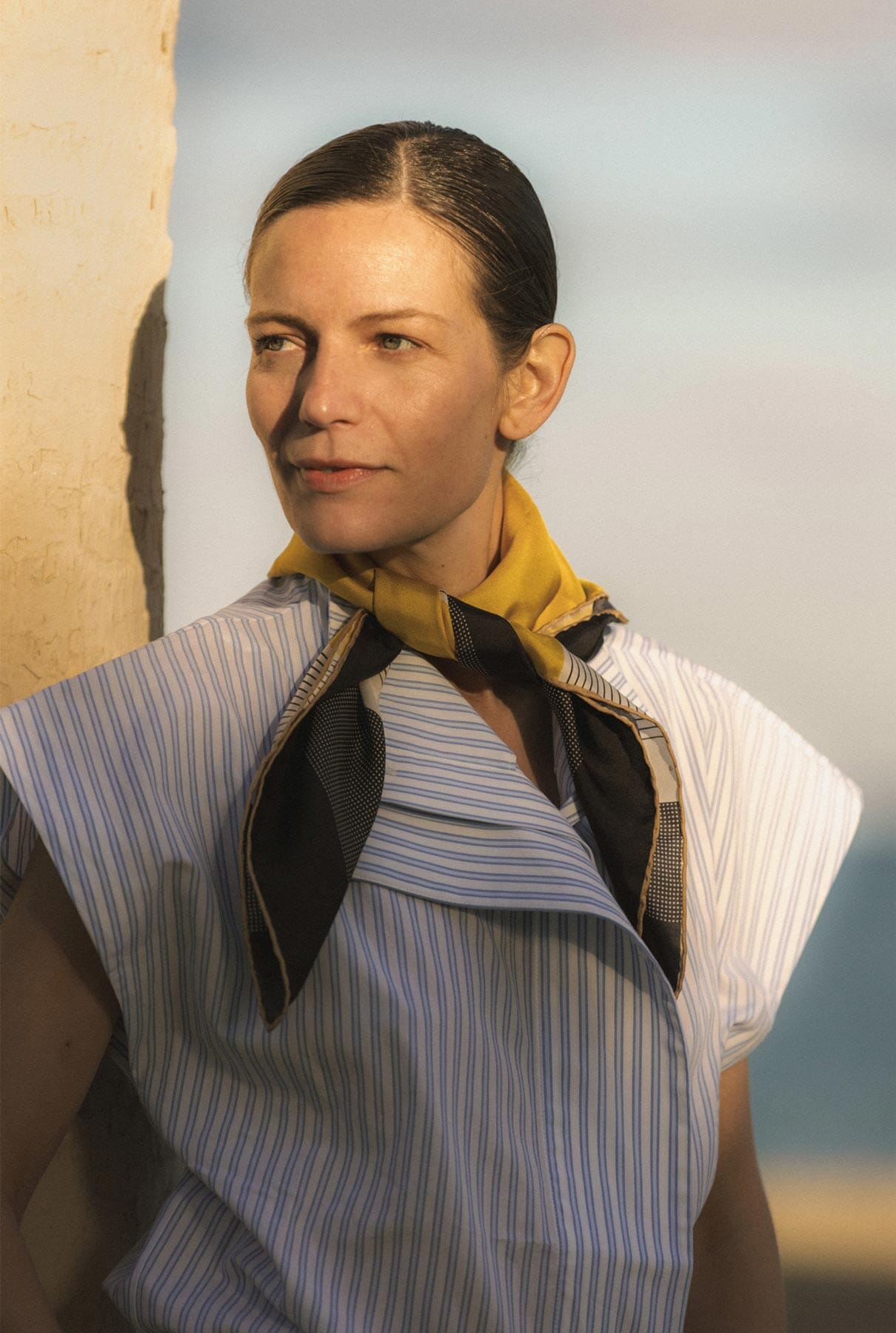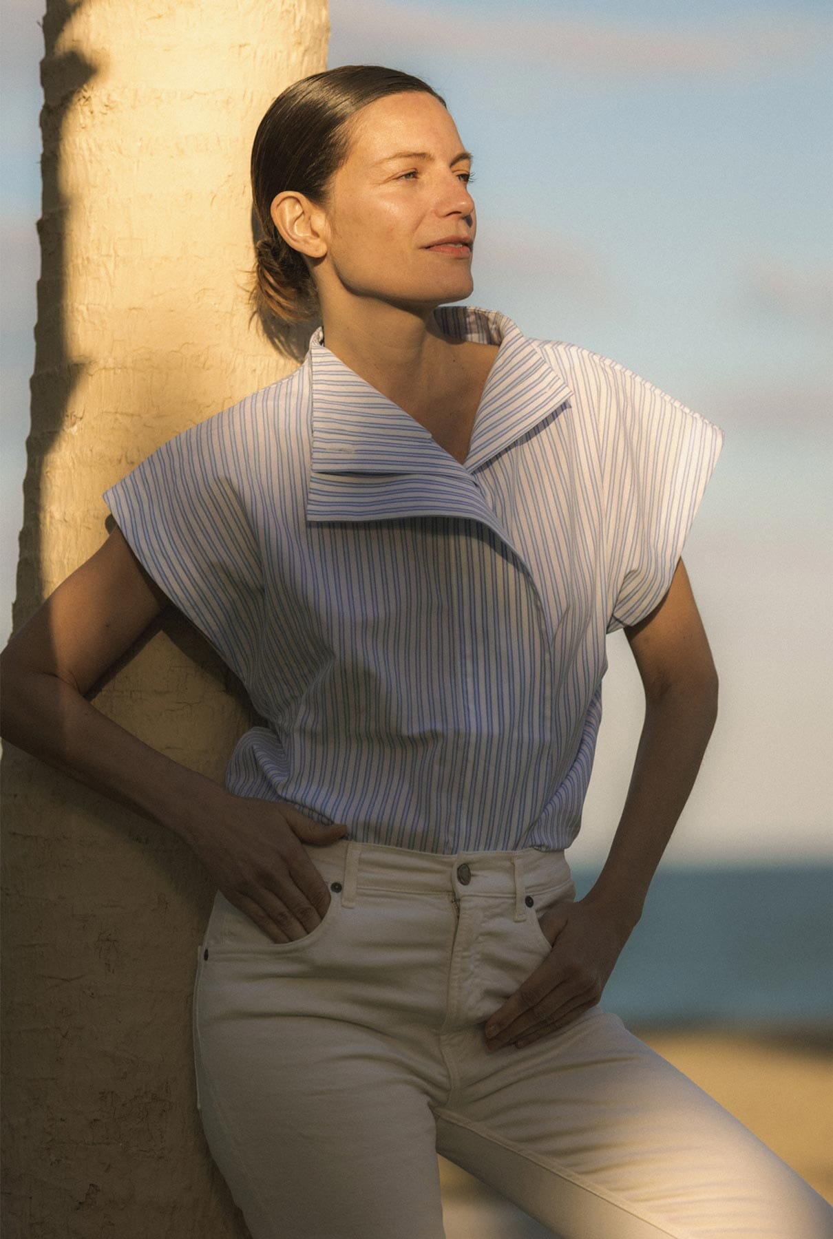 CAMISA DE POPELINA DE ALGODÓN, MANGA CORTA, CUELLO ALTO Y ABERTURA LATERAL.