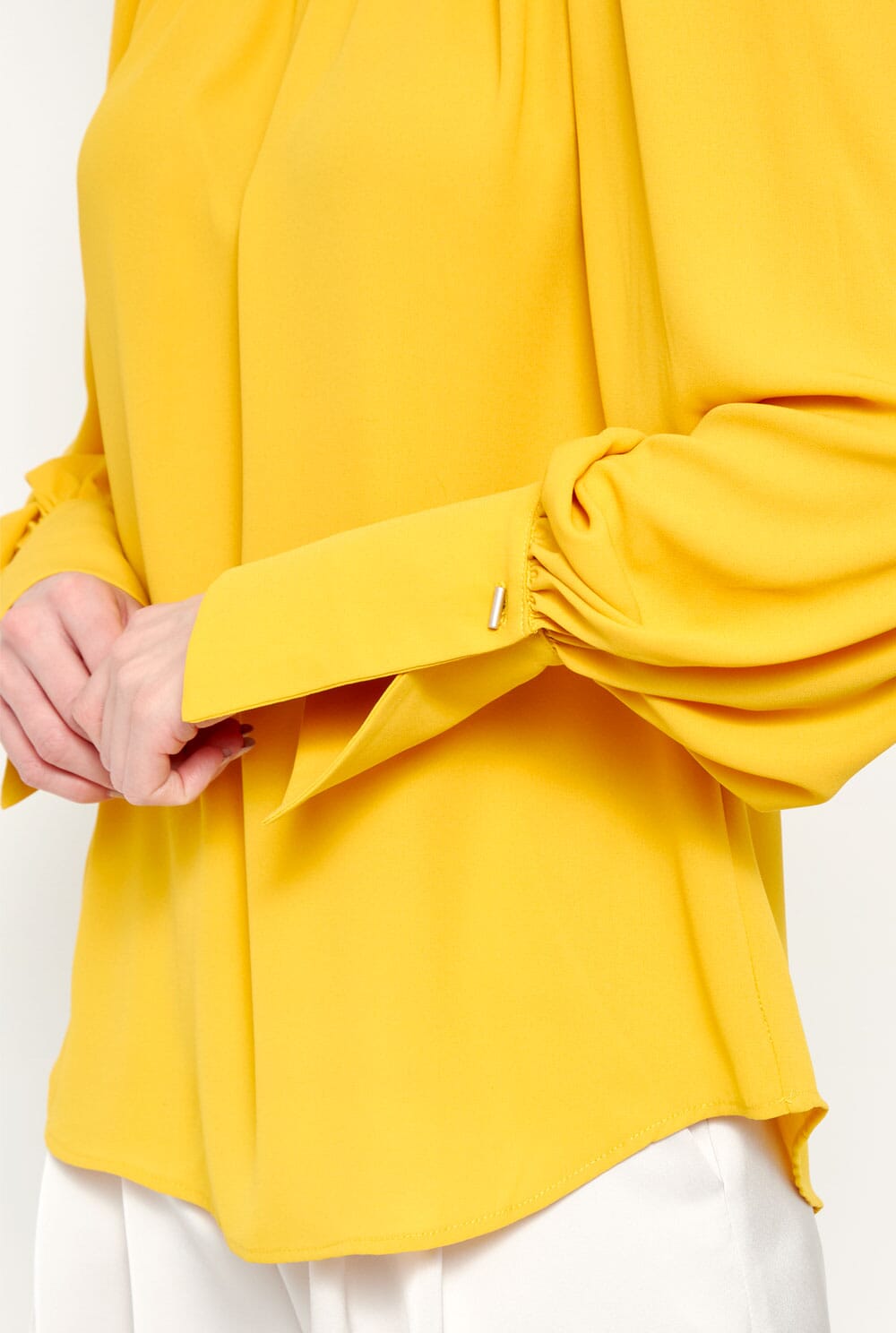 Camisa firma Miguel Marinero en georgette amarillo. Completa tu armario con esta camisa básica de armario, una opción versátil para reuniones elegantes o un look más informal. Con lazo en el cuello y puños extra largos con gemelos.