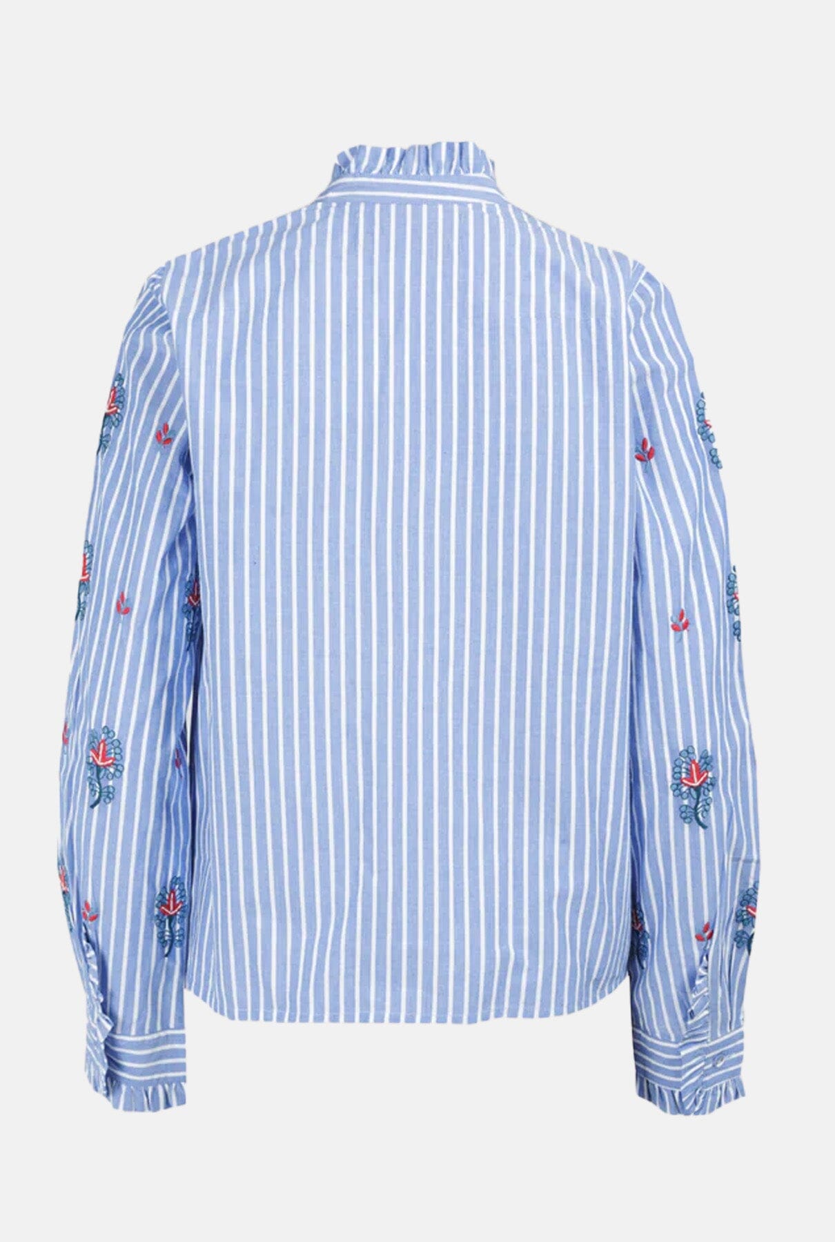 Esta elegante camisa de rayas azules y blancas está adornada con un encantador volante en el cuello, la parte delantera y los puños. Las flores bordadas en tonos rojos y azules aportan un toque único y sofisticado. Ideal para un estilo fresco y femenino para cualquier ocasión.