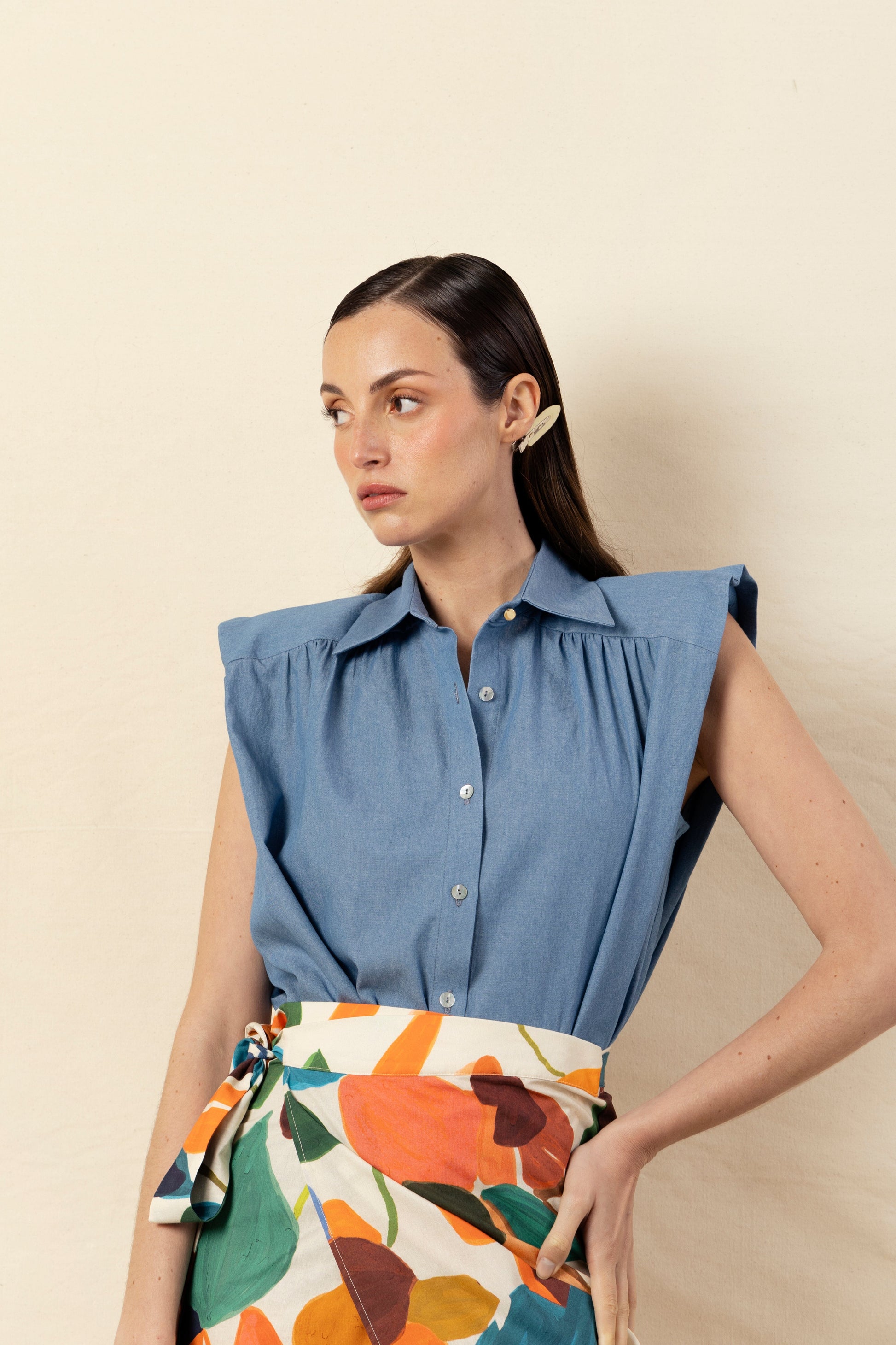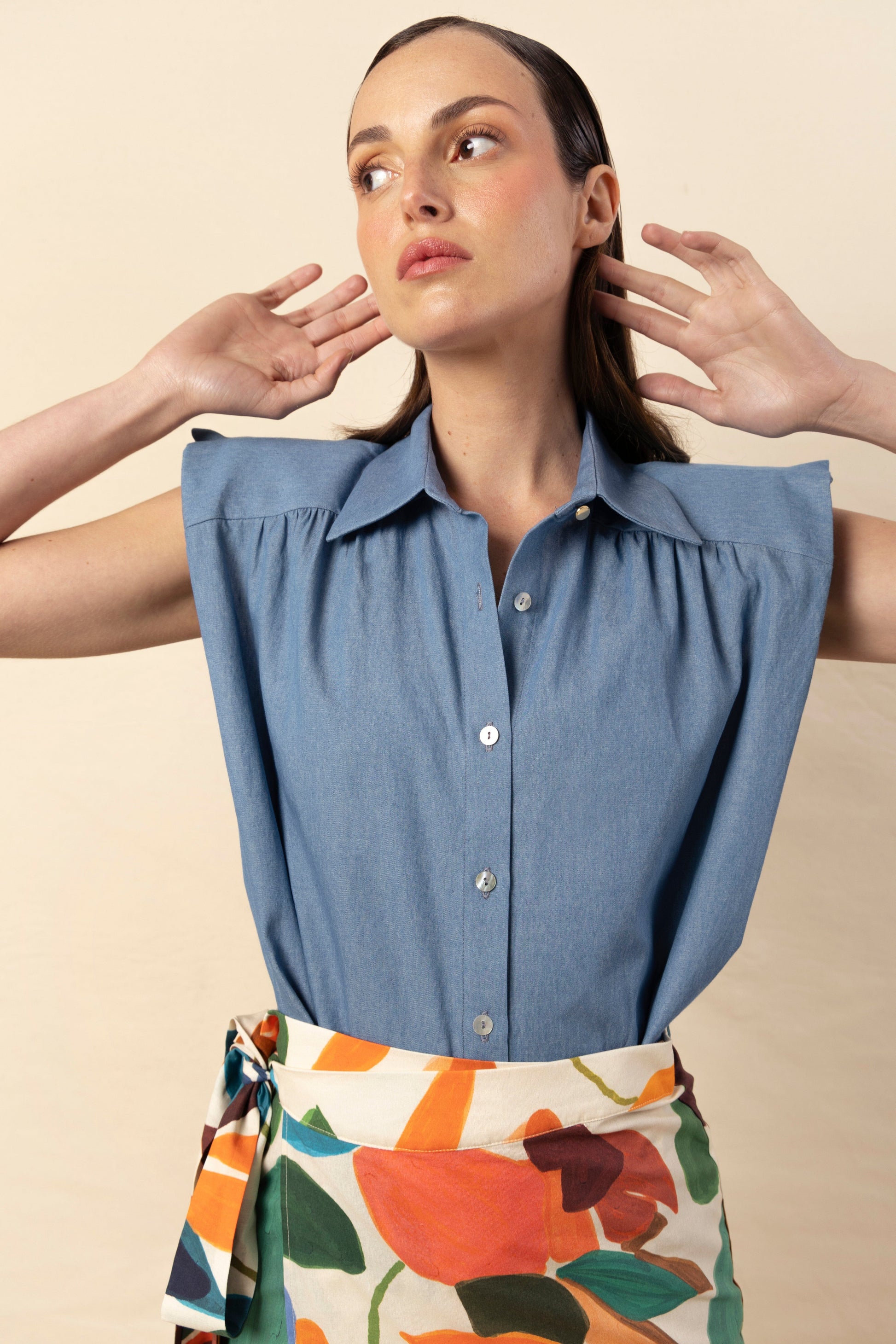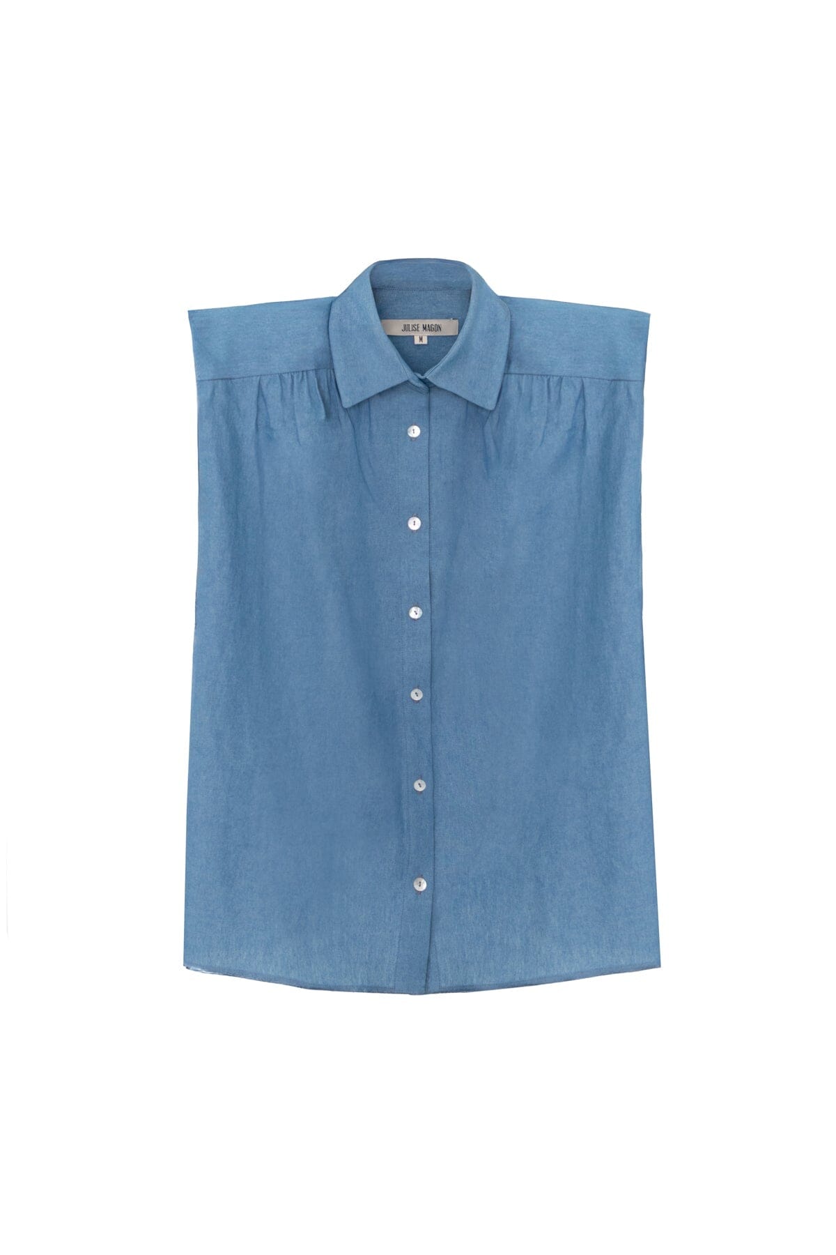 Nuestra icónica camisa Marieta, sin mangas y en tejido vaquero azul muy claro. Con botones de nácar en la parte delantera y botones dorados en el cuello. Detalle de volante en el hombro y hombreras forradas. Para un look completo, combina con infinidad de prendas inferiores; es una camisa muy versátil.