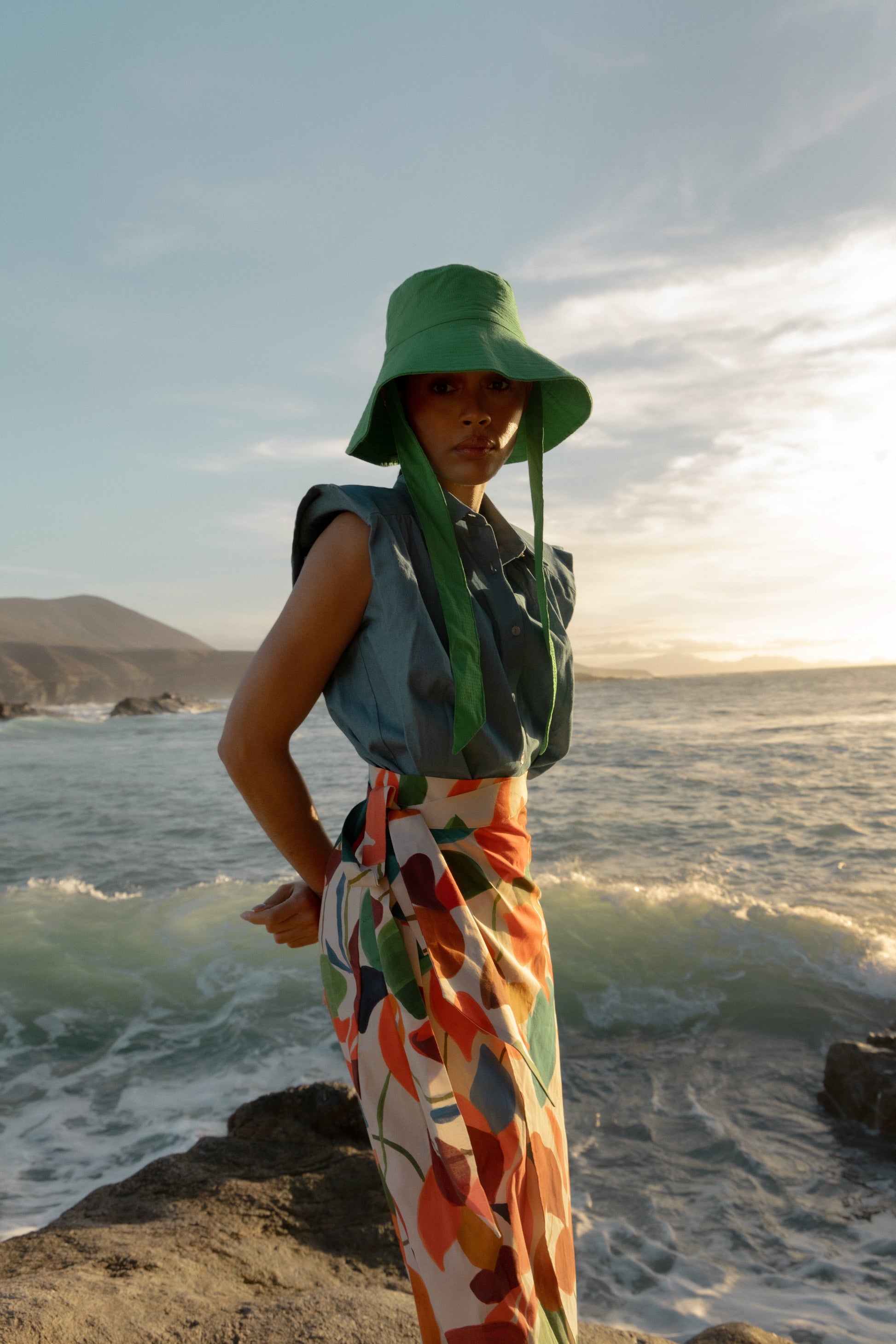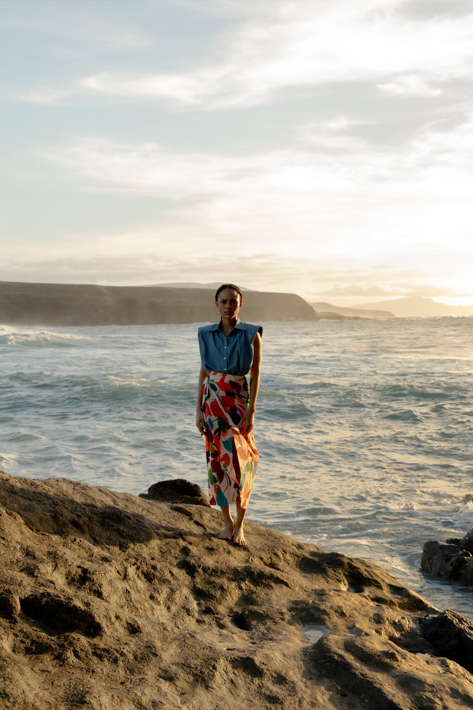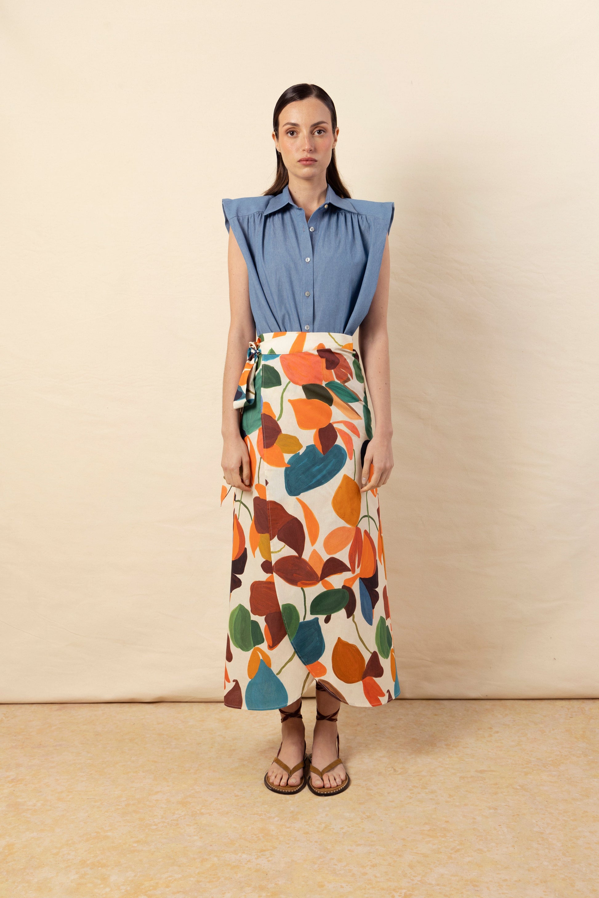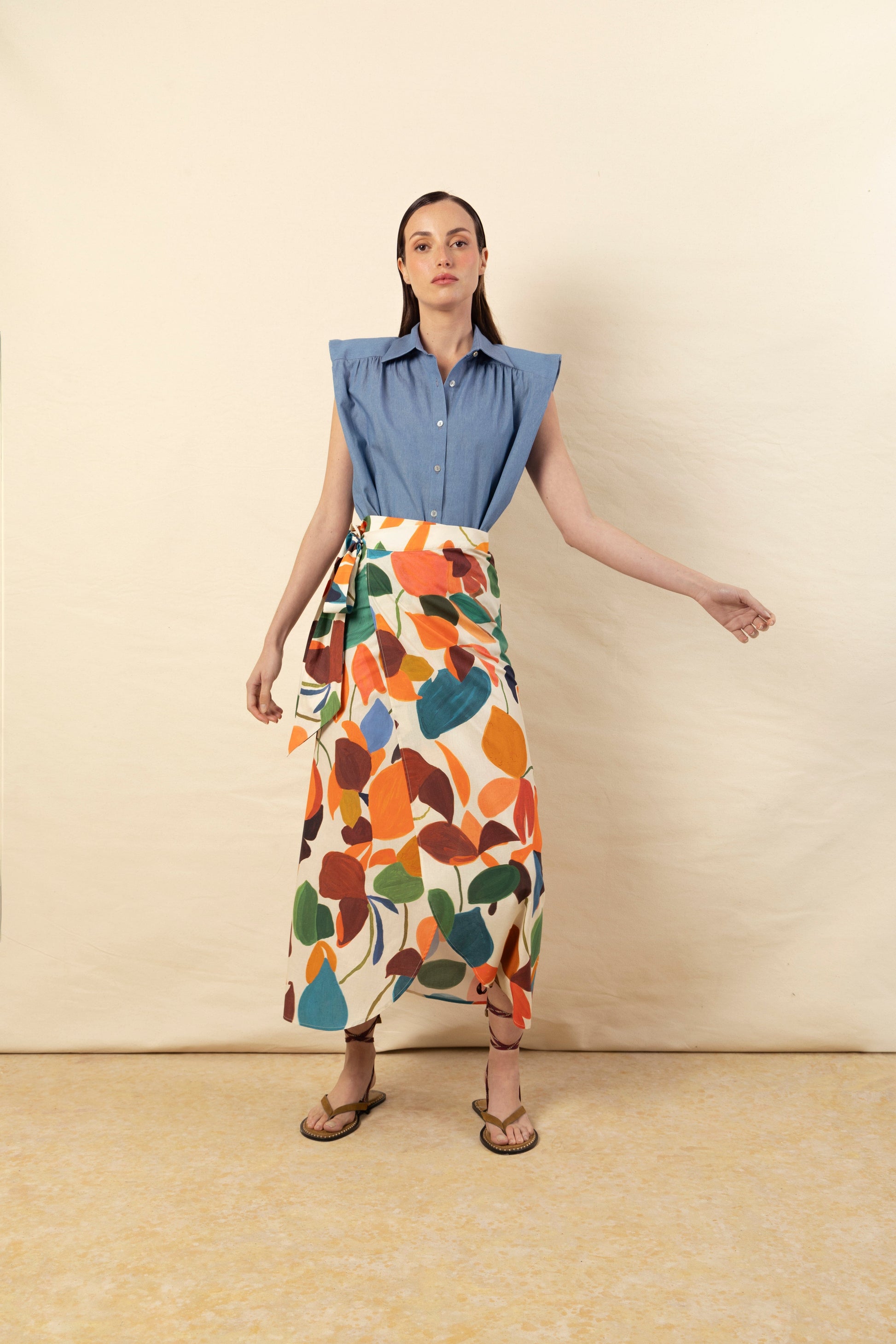 Nuestra icónica camisa Marieta, sin mangas y en tejido vaquero azul muy claro. Con botones de nácar en la parte delantera y botones dorados en el cuello. Detalle de volante en el hombro y hombreras forradas. Para un look completo, combina con infinidad de prendas inferiores; es una camisa muy versátil.