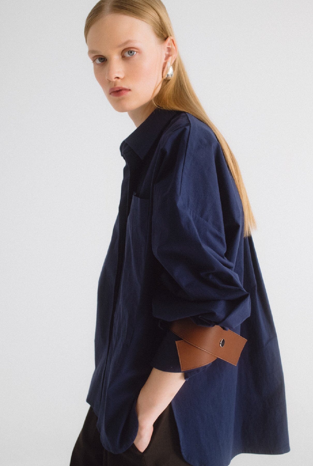 Camisa oversize azul con cuero marrón