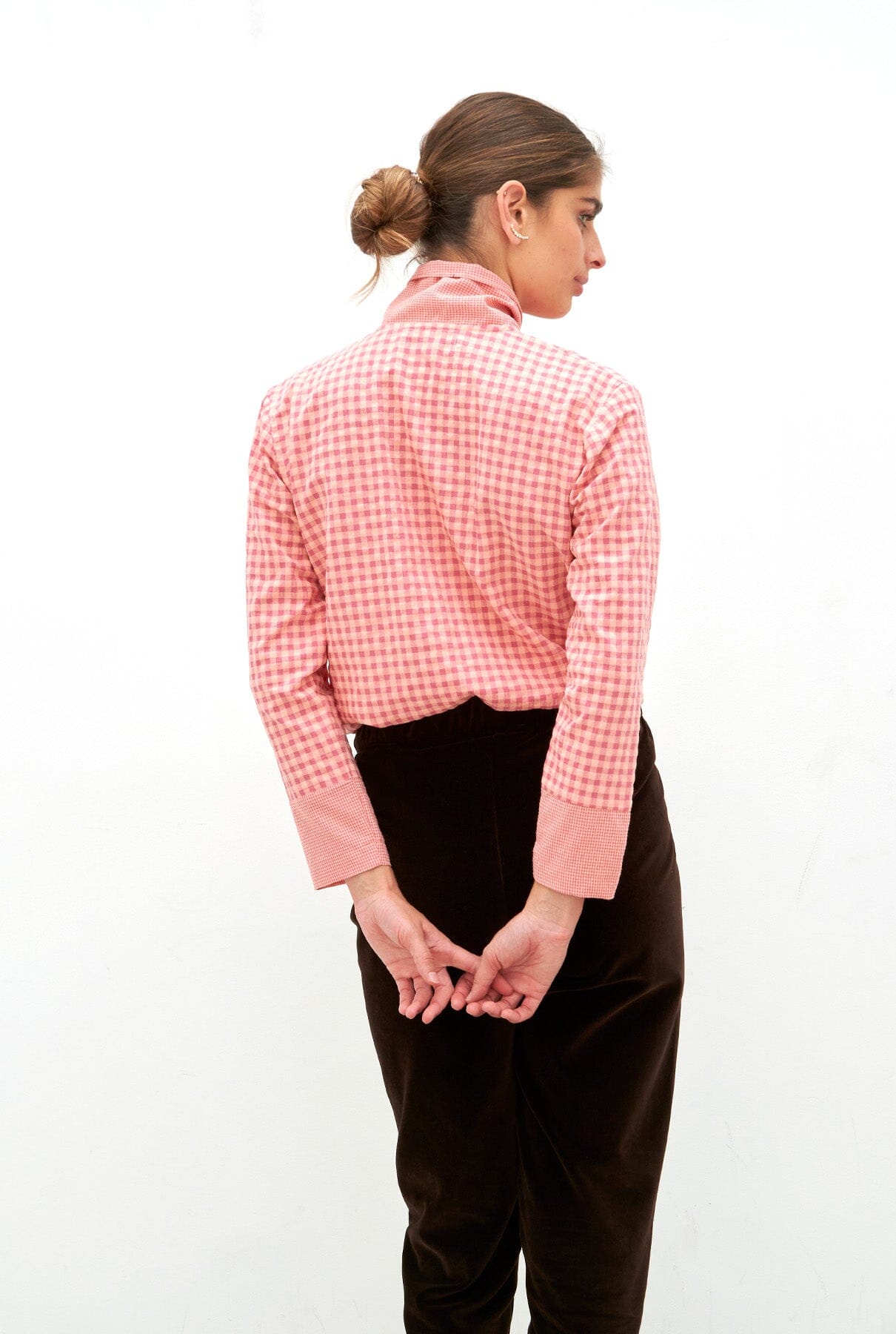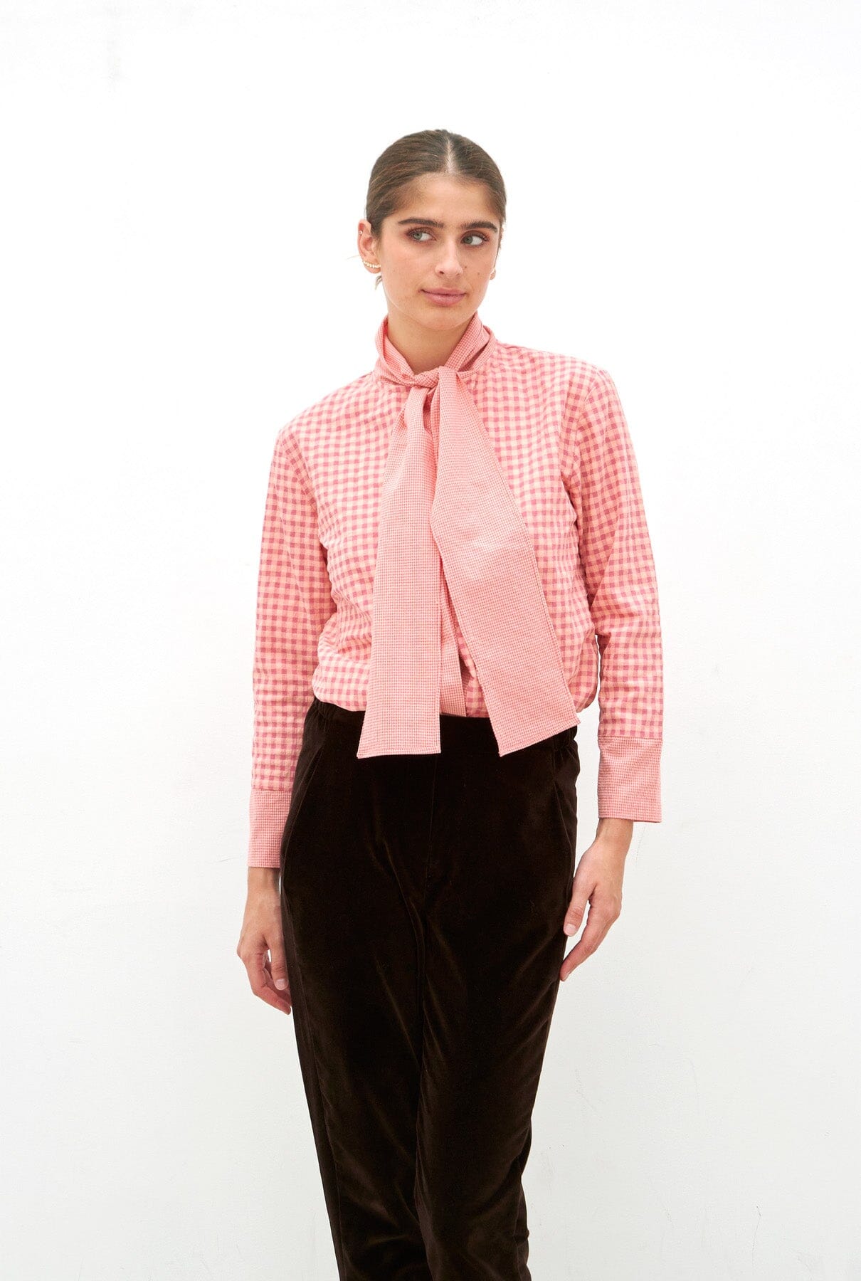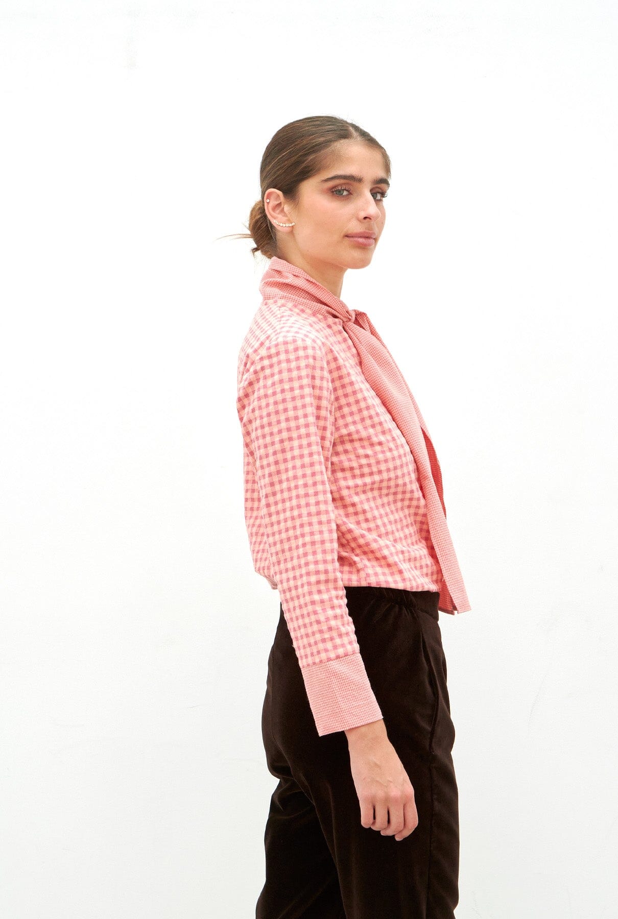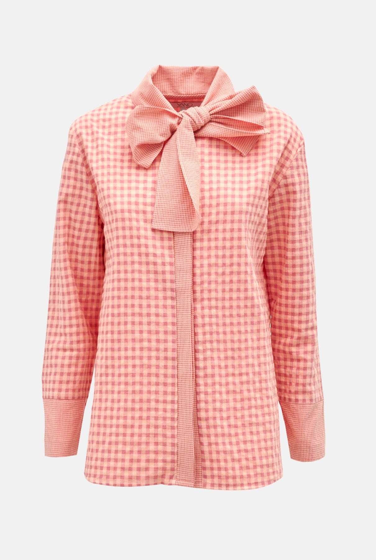 Camisa confeccionada en tejido de cuadros en tonos naranjas y rosas. Cuello con tira multiusos para atar, anudar, etc. y cierre con botones interiores. Mangas largas rectas con puños en contraste.