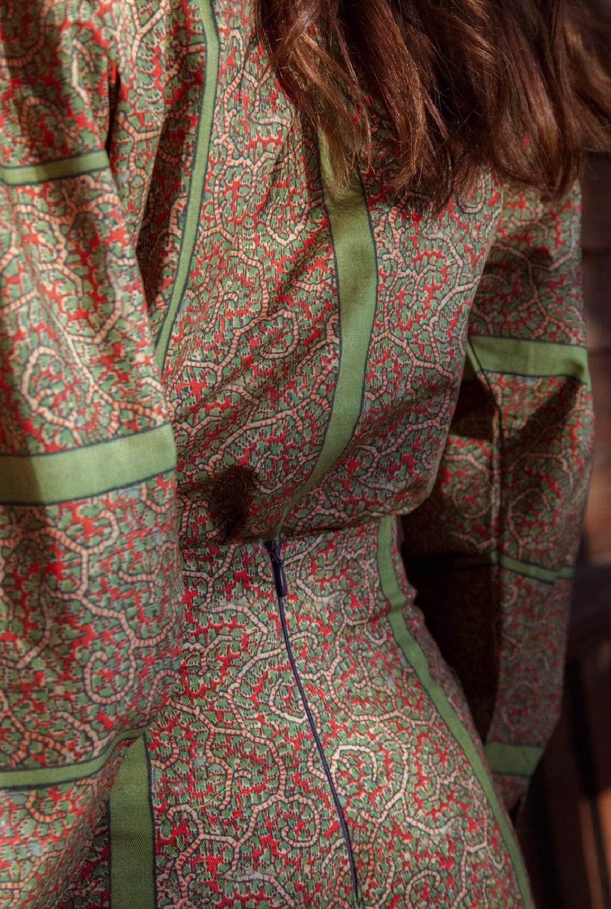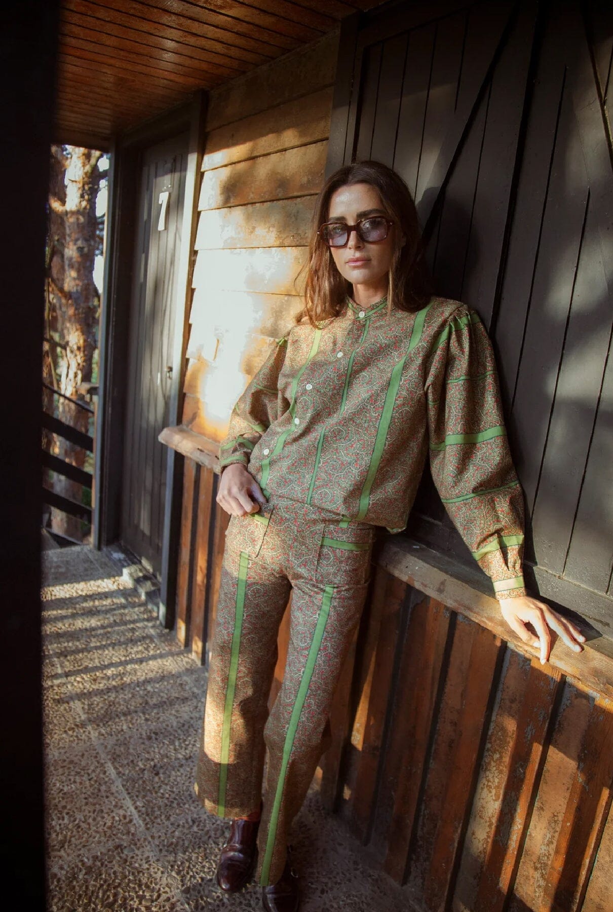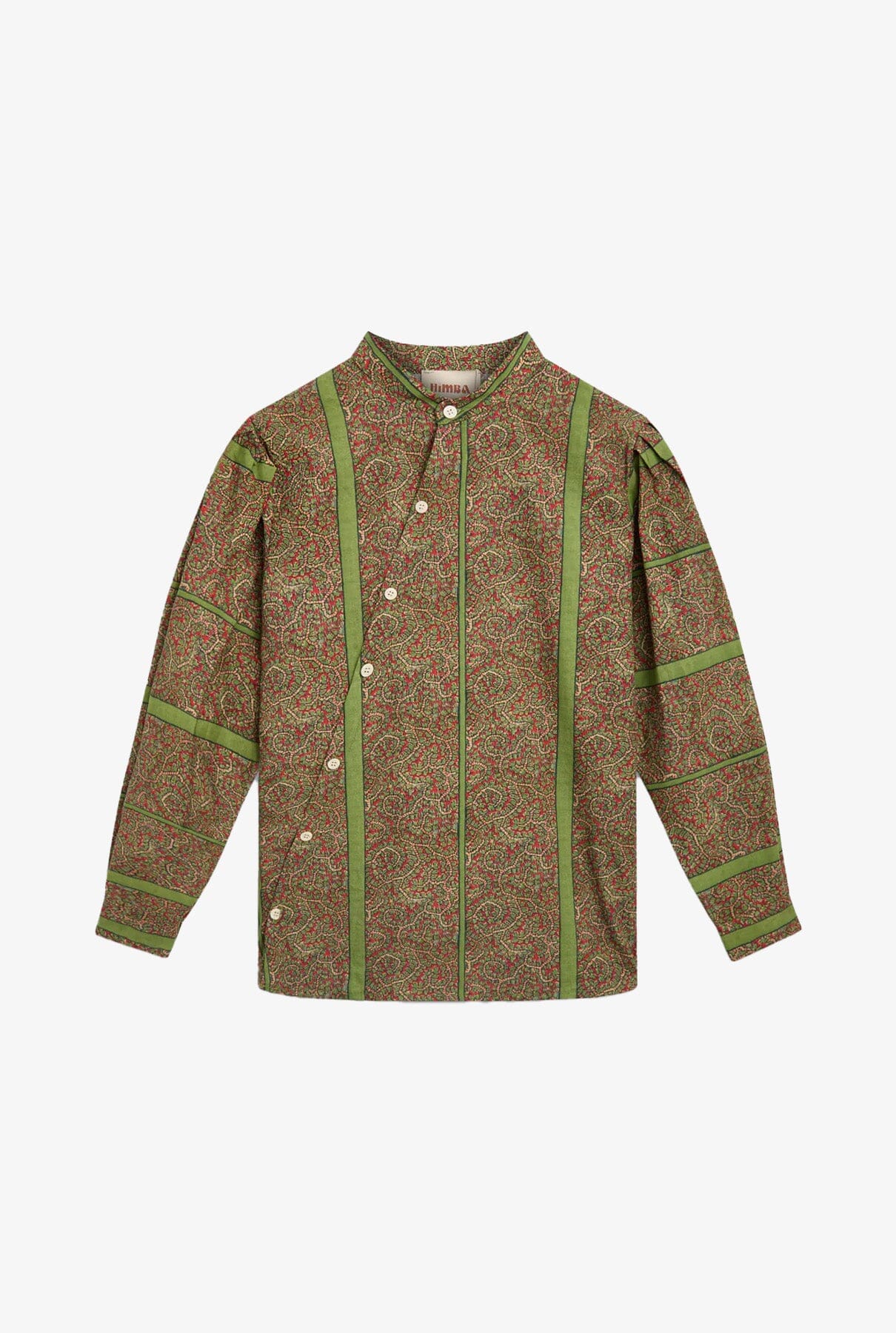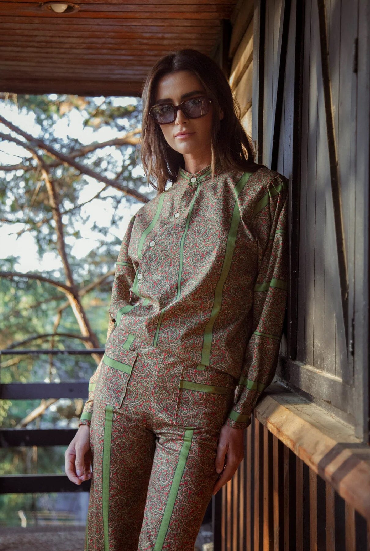 La camisa Tayari tiene cuello mao, sin solapas, para darle un toque moderno y refinado. Las mangas son ligeramente abullonadas, con puños cerrados con pequeños botones, reforzando el carácter clásico y cuidado de los detalles de la prenda. La tapeta cruzada con botones añade un elemento distintivo que realza aún más su elegancia.