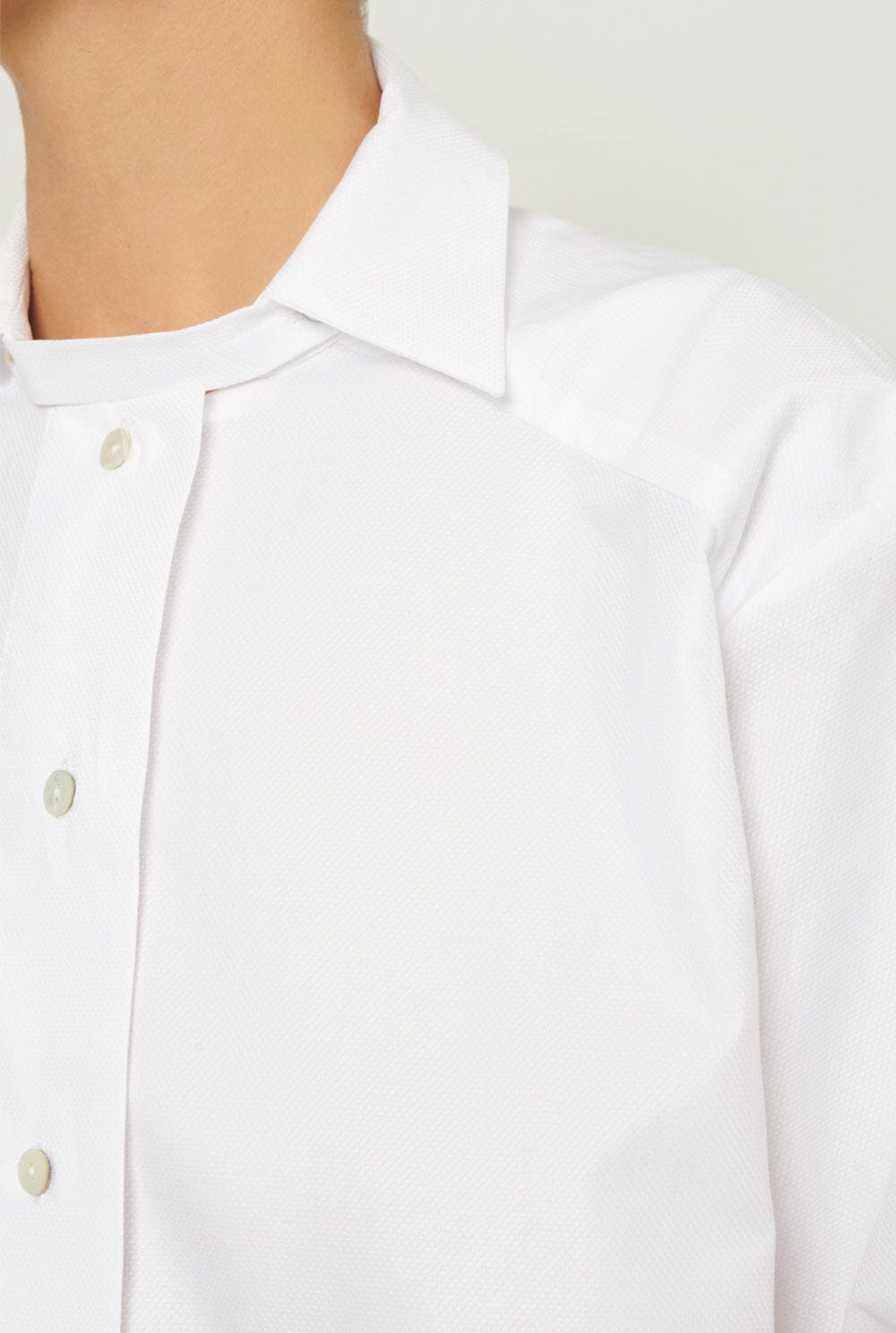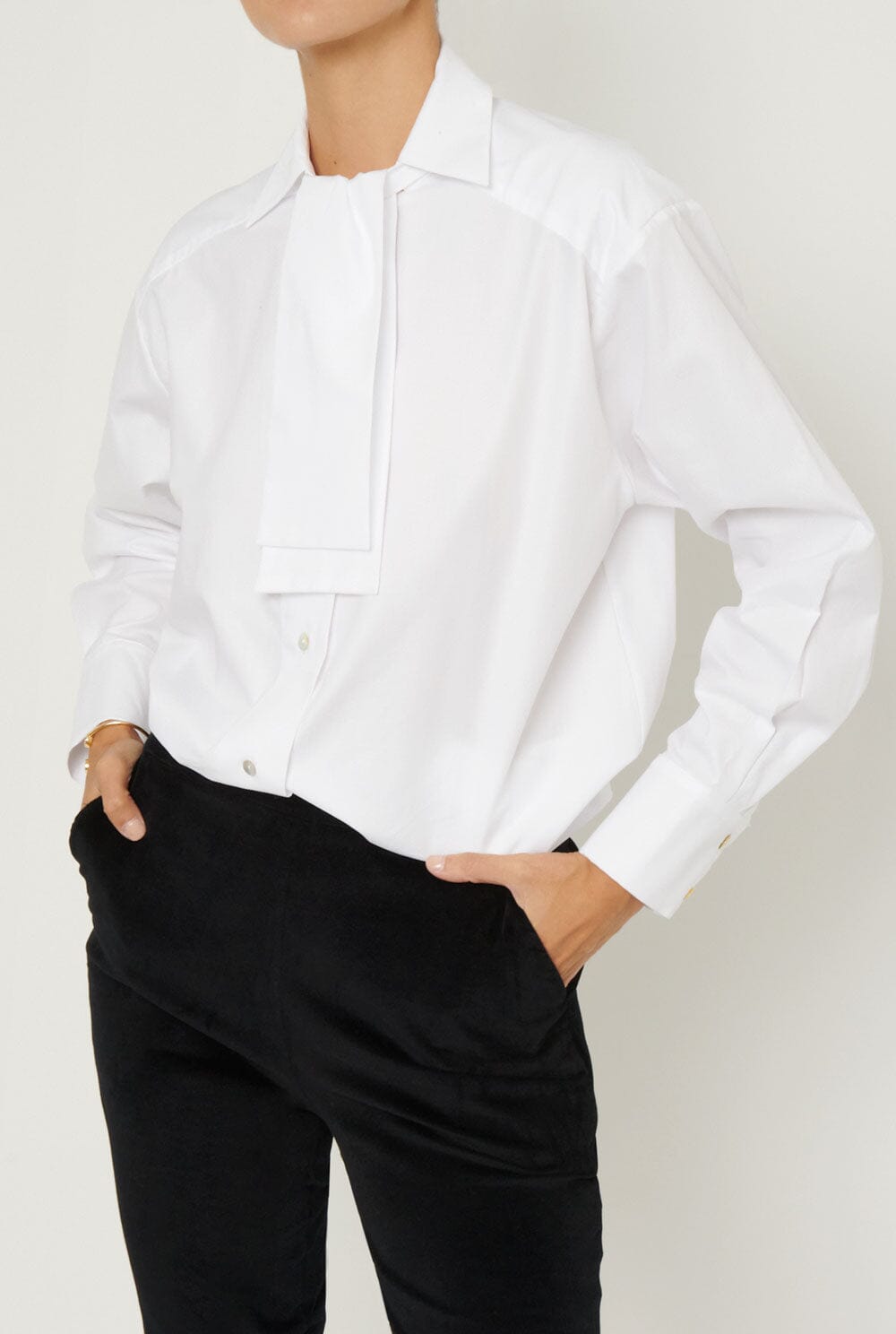 Camisa con cuello camisero y corbata. La corbata se puede quitar y poner con un cierre de tirador, lo que permite tener una camisa básica con cuello vuelto abierta o cerrada con la corbata. La tela de la camisa tiene un poco de textura.