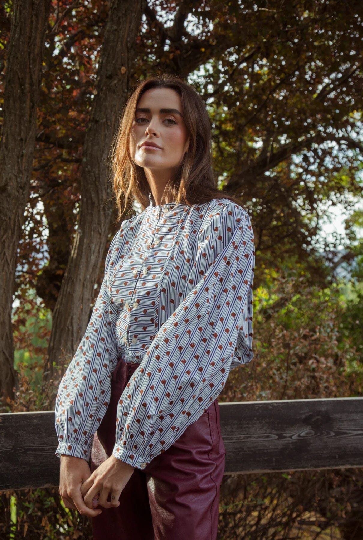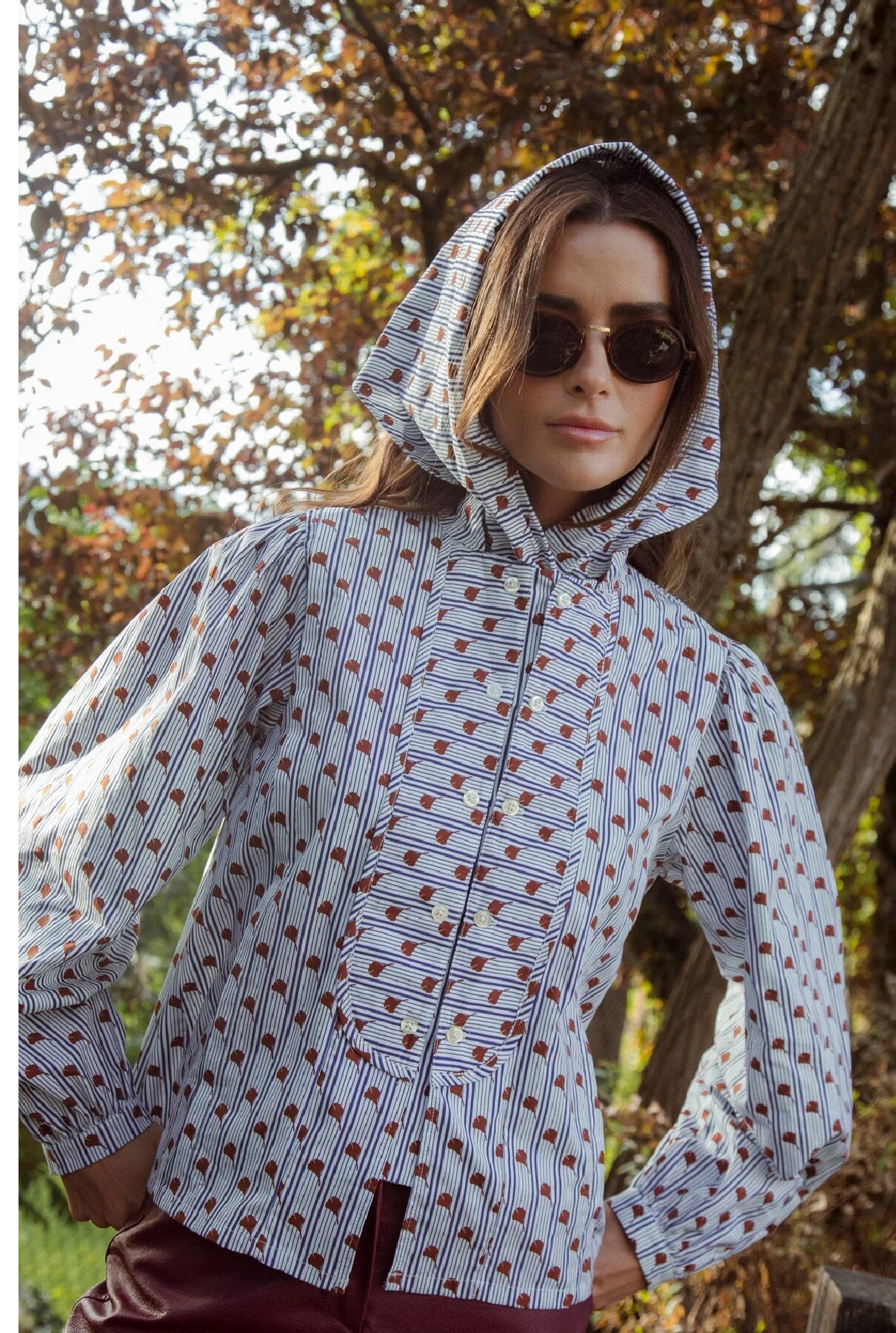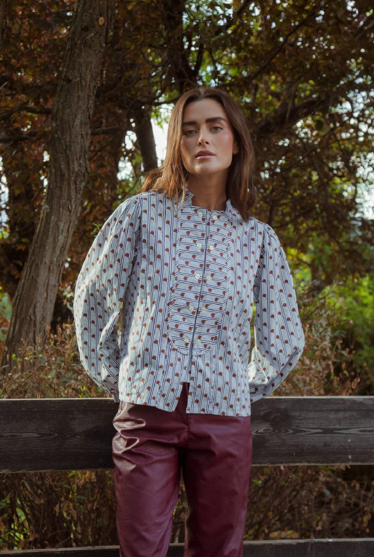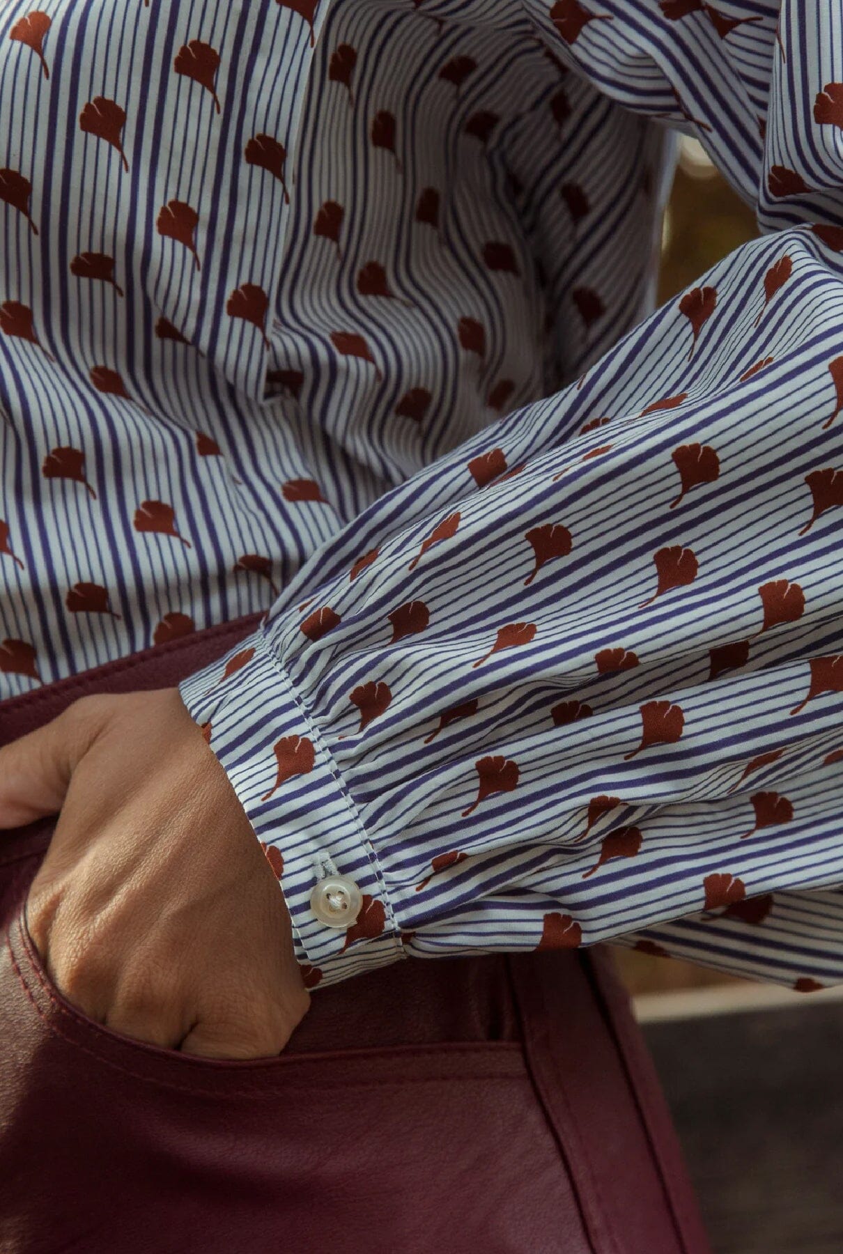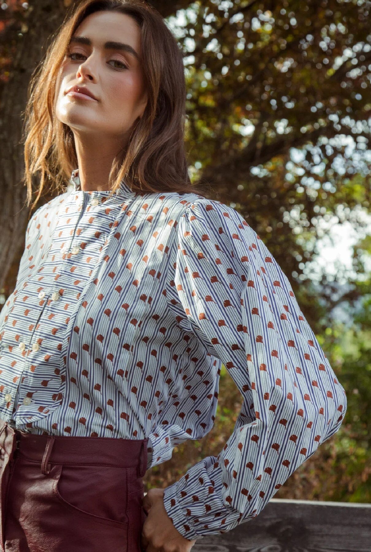 La camisa Upendo presenta una solapa decorativa adornada con 10 botones, que le aporta un toque distintivo al diseño. El cuello mao, sin solapa, le aporta un aire formal y refinado. Las mangas largas están rematadas con puños que se abrochan con un botón, lo que le da a la camisa una estructura elegante y definida.