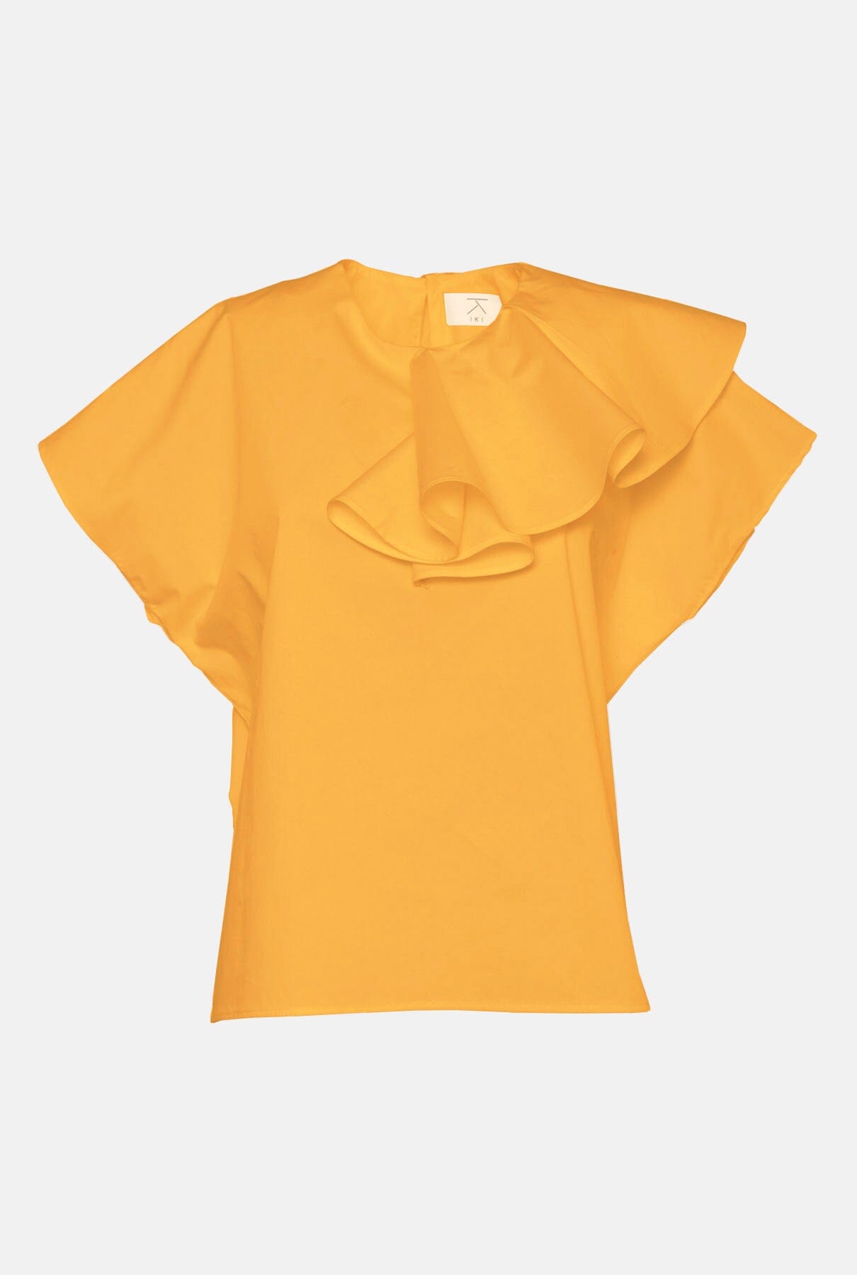 Camisa de popelina de algodón de manga corta con volante en el cuello.