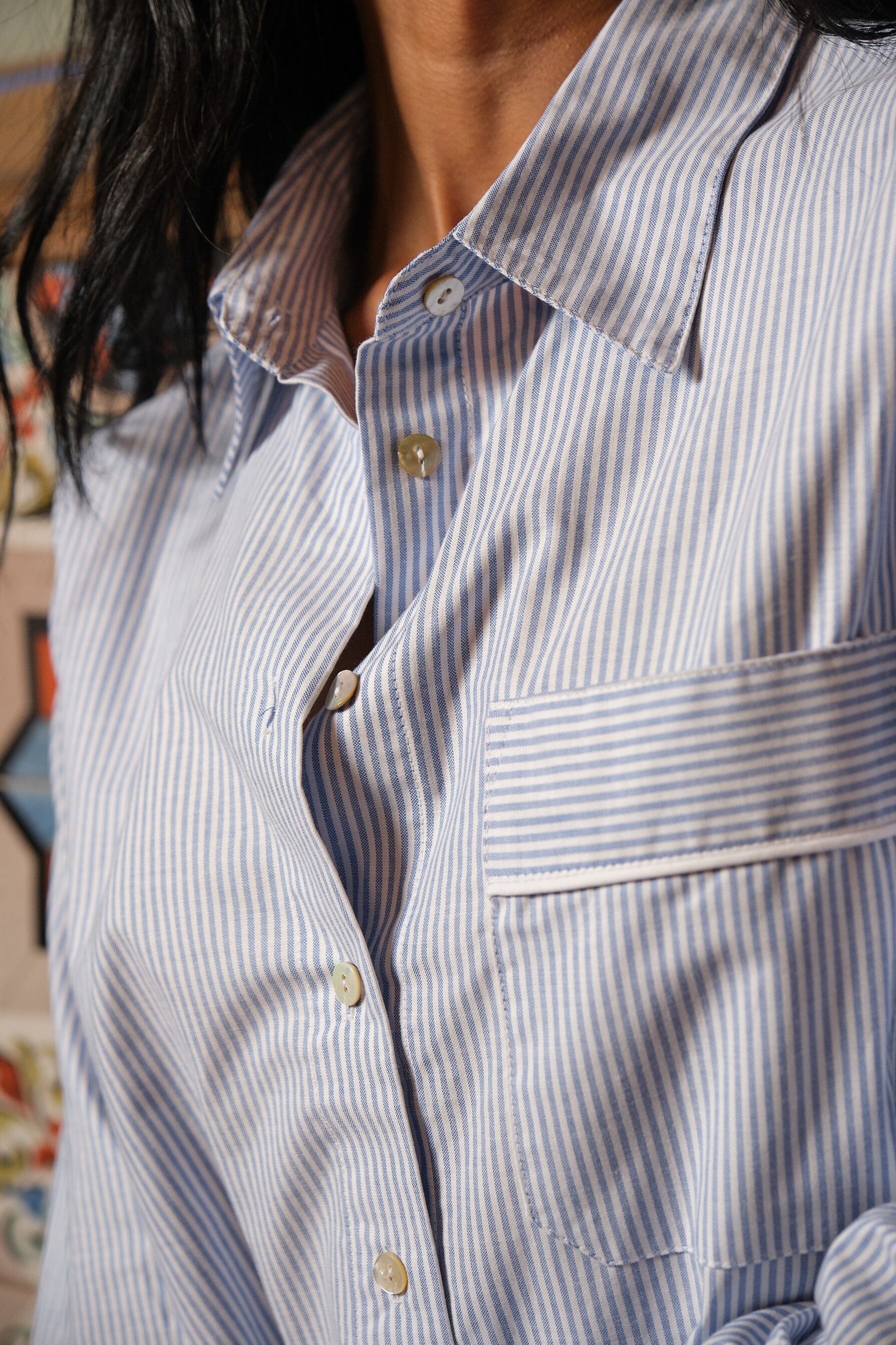 Camisa de corte clásico con 10 botones pequeños abiertos hasta el bajo, con bolsillo y vivo blanco. Rayas azules y blancas.