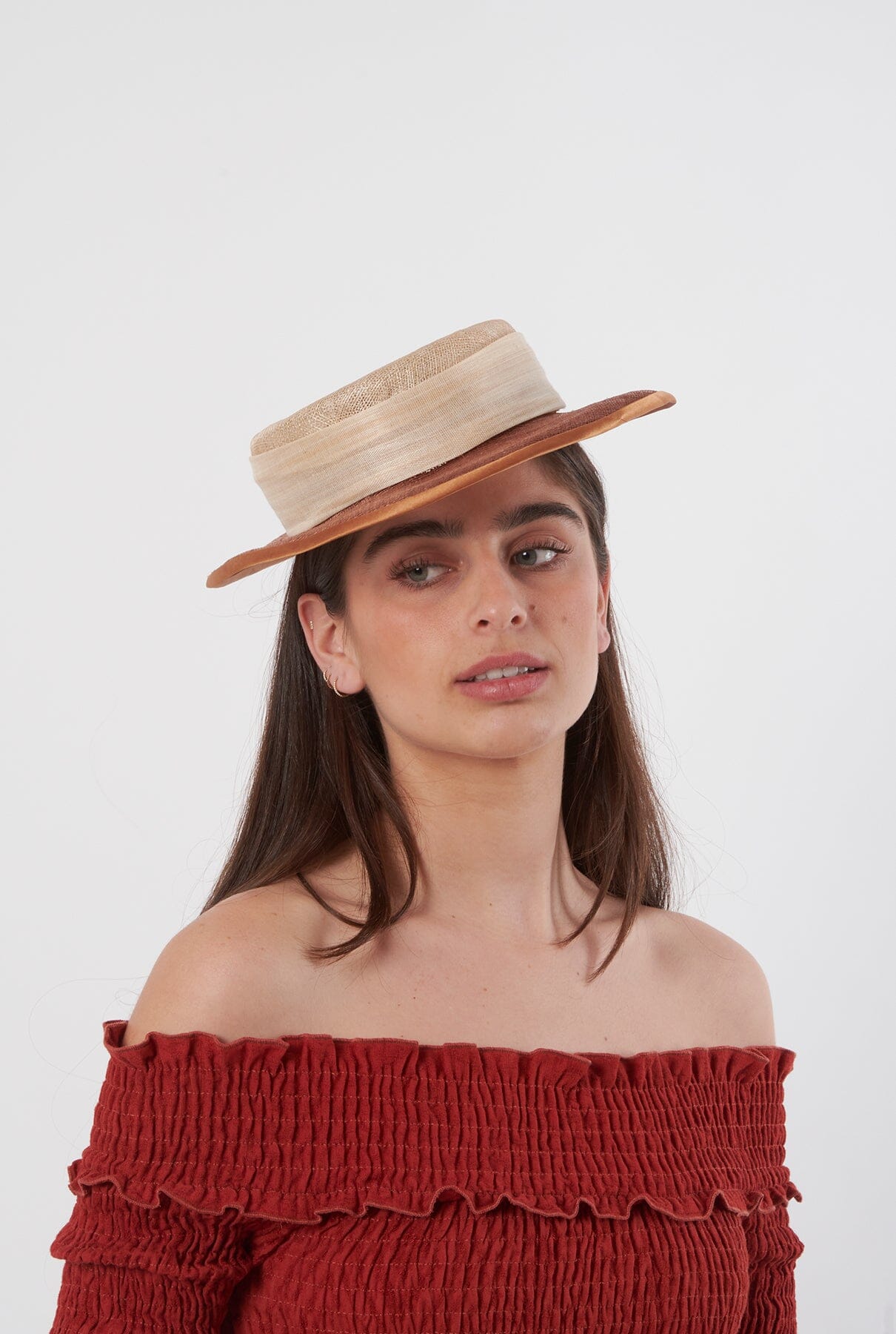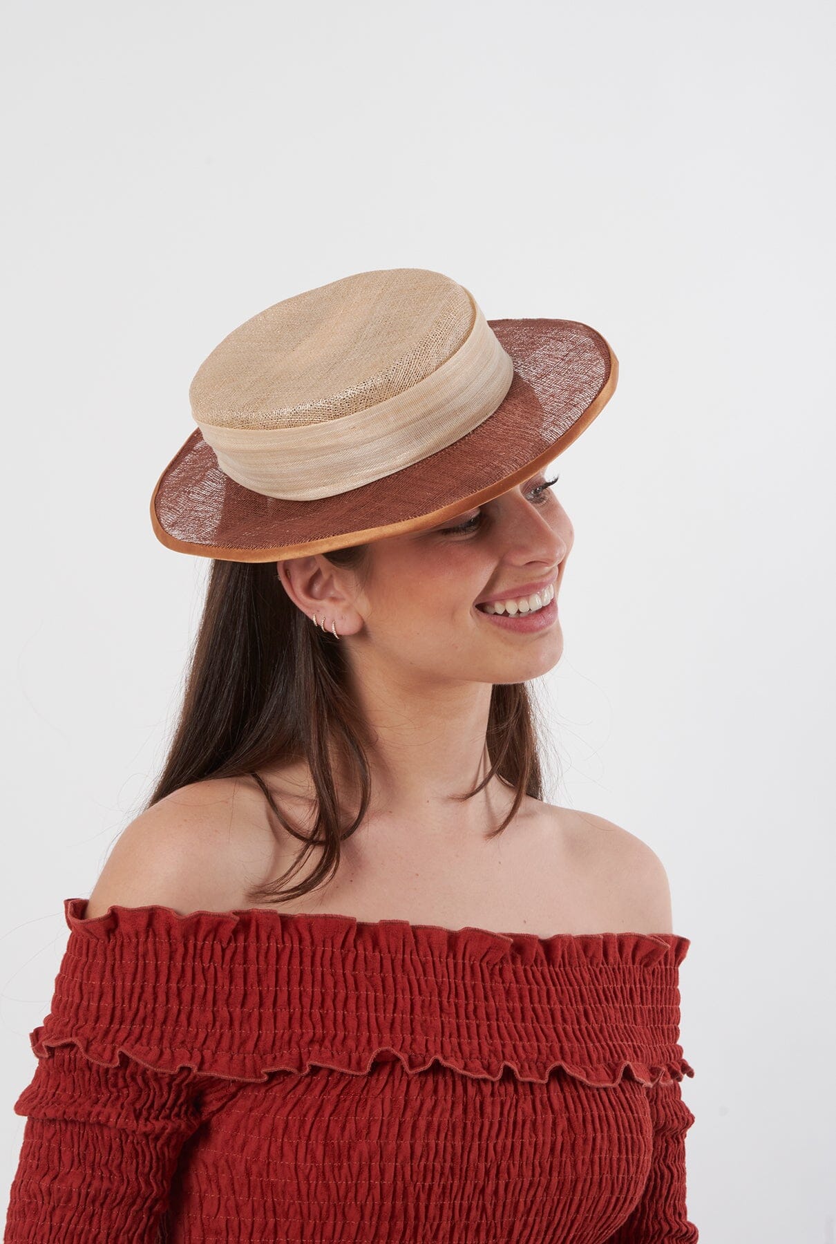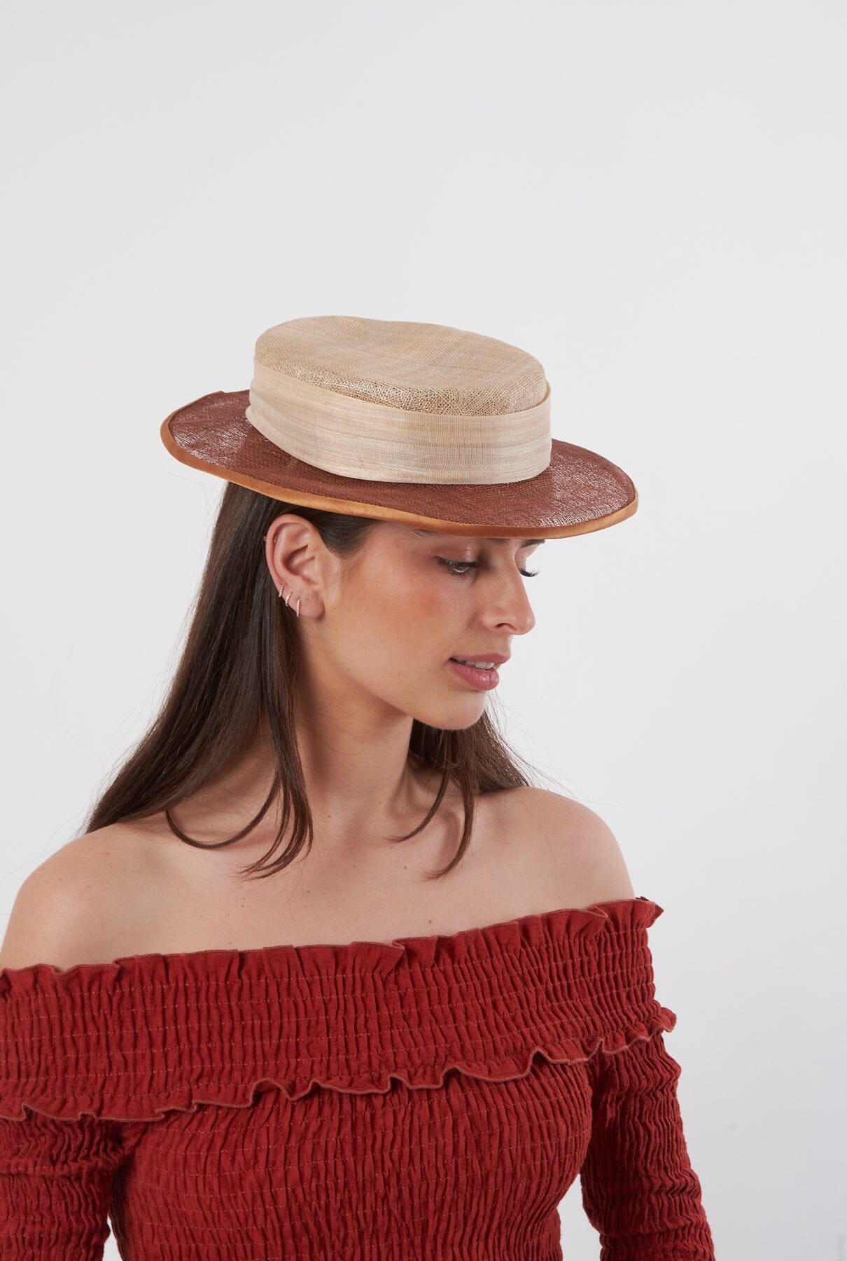 Canotier de sinamay hecho a mano, totalmente cosido y cosido, en tonos beige y marrón chocolate con diadema forrada de raso en el mismo tono.