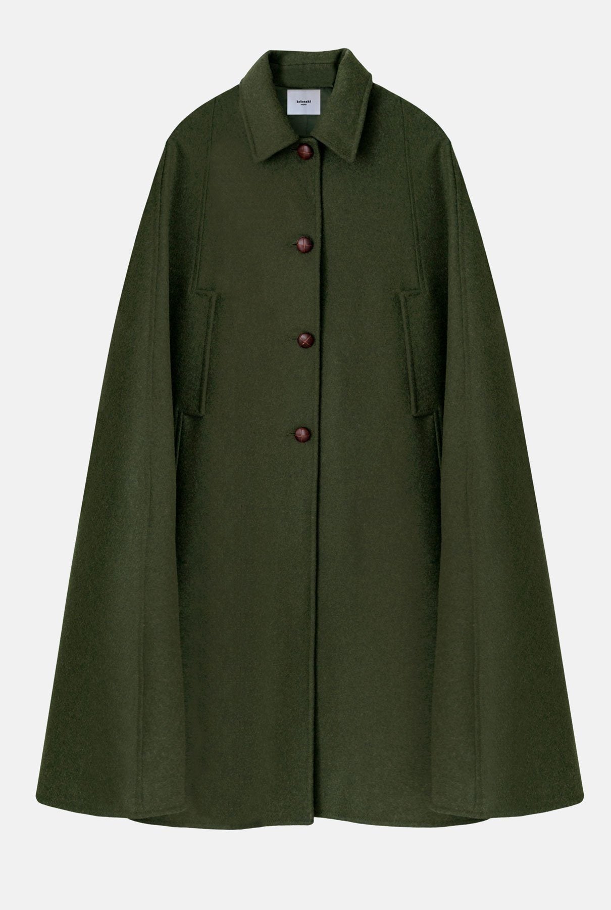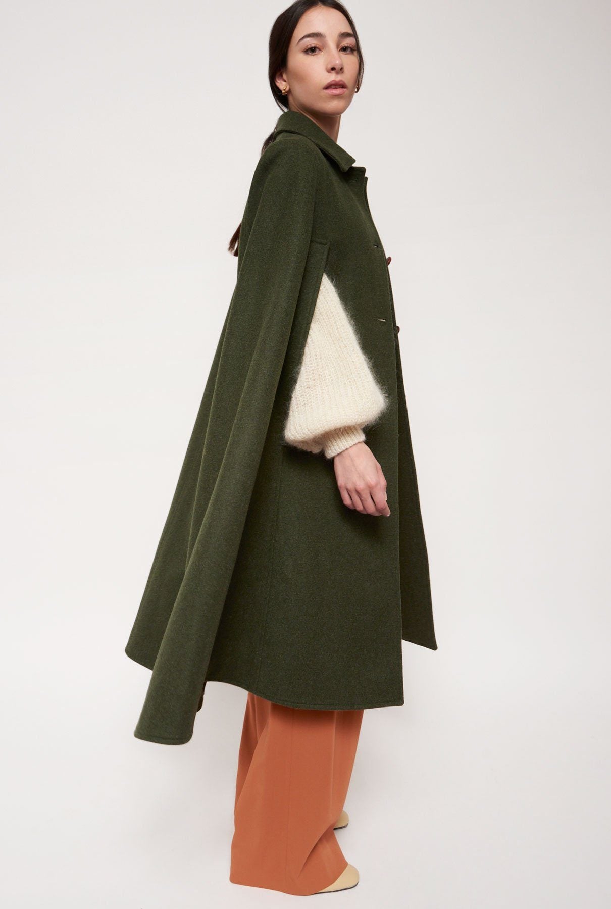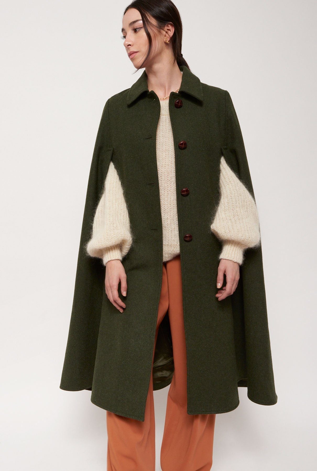 Abrigo verde confeccionado en paño 100% lana. Con tratamiento superficial impermeable. Diseñado por Kolonaki