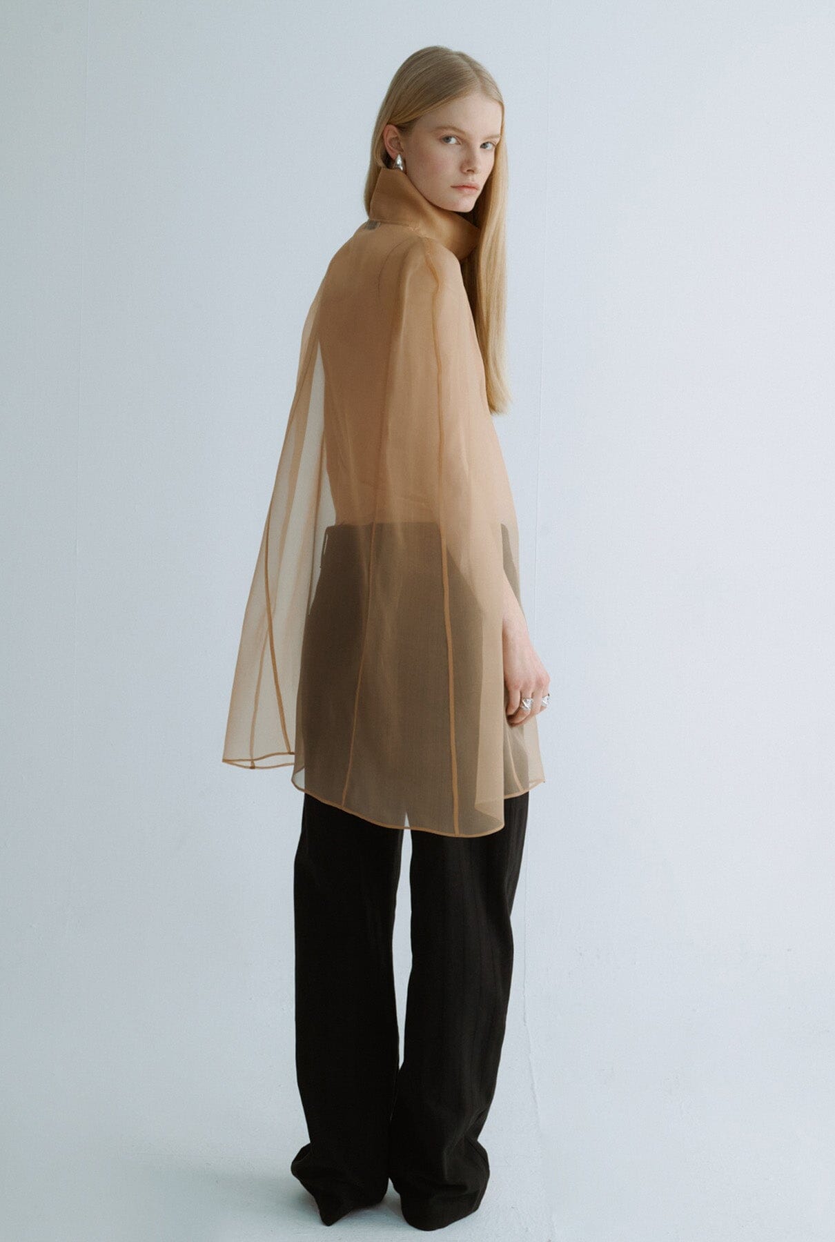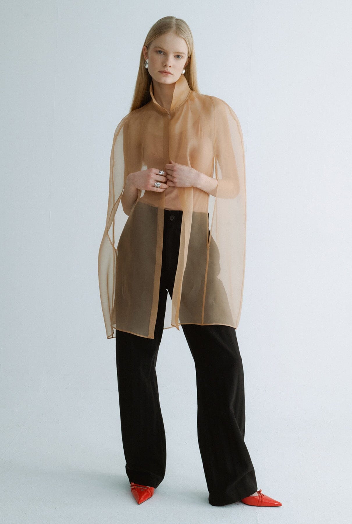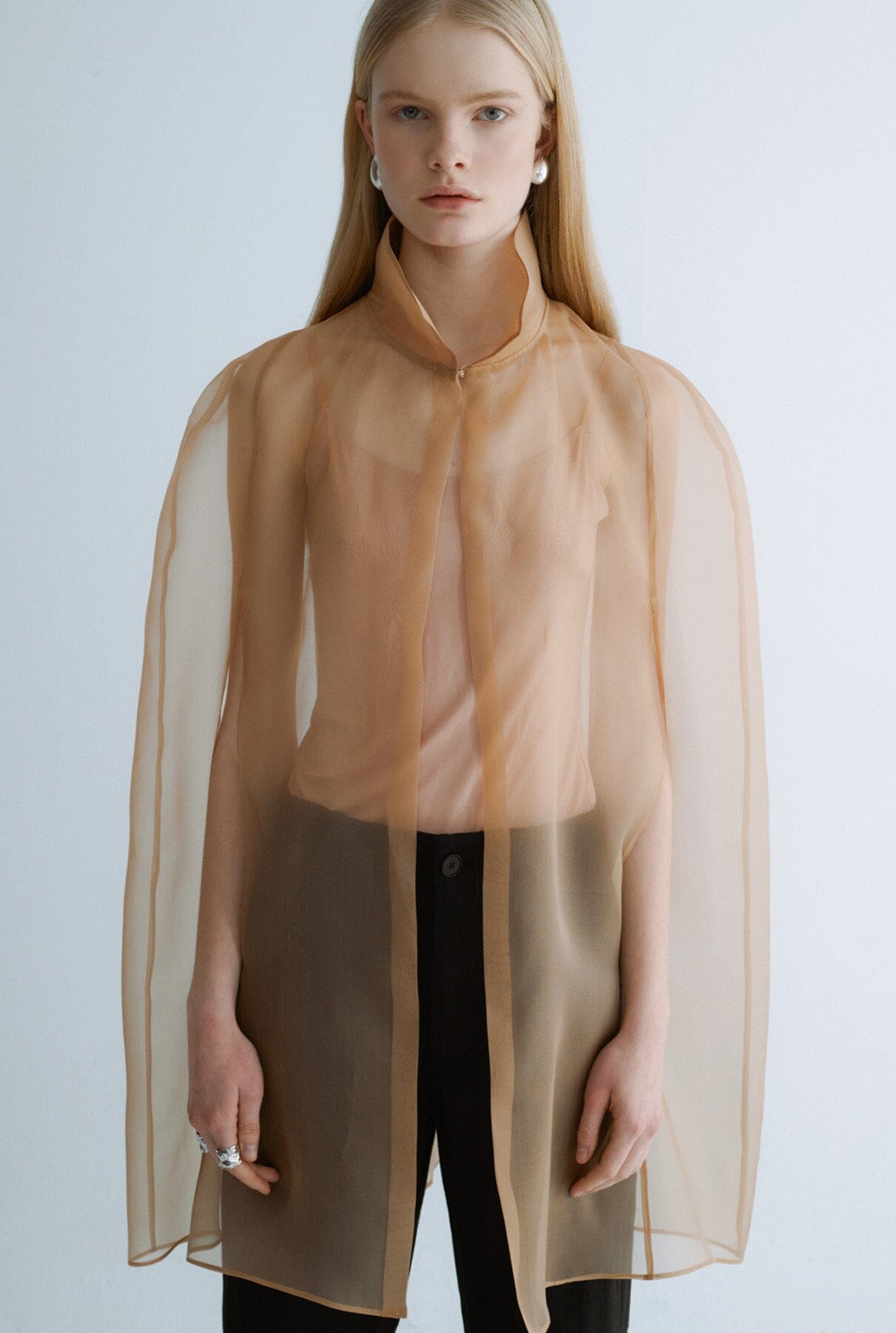 Capa de Miguel Marinero en organza color camel. Tejido semitransparente con cierre de corchetes forrados en el cuello. Prenda sofisticada para invitadas y ocasiones especiales.