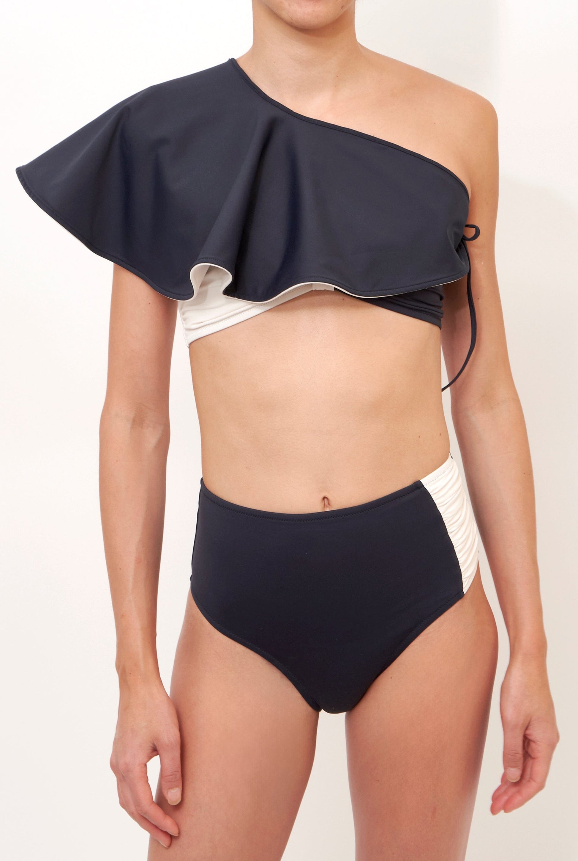 Original capa reversible, en color blanco roto y azul marino, para llevar encima del bikini Gala. Ideal para el chiringuito de la playa y para combinar con tus camisetas de verano.