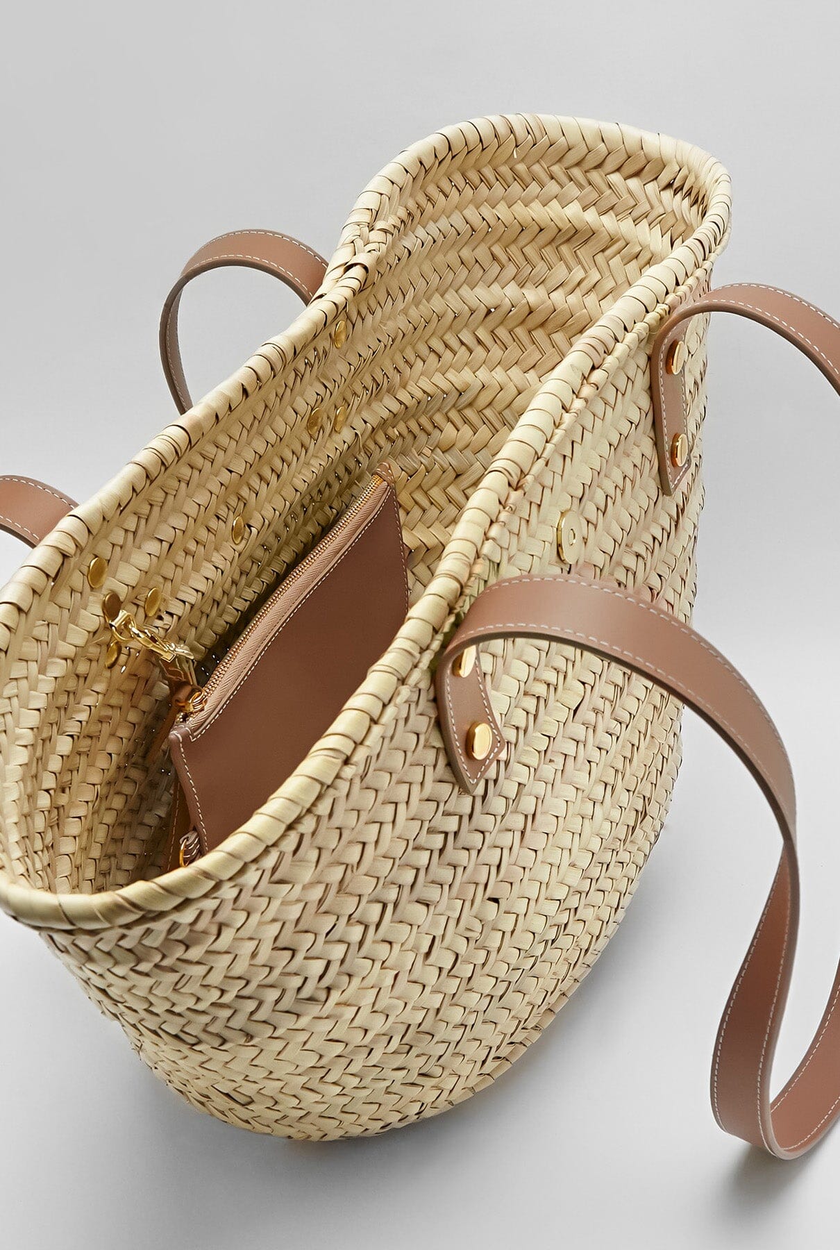 Bolso Cesta elaborado artesanalmente con hojas de palma y decorado con asas y solapa de piel de vacuno lisa de color marrón, adornado con el logo de Carnevale grabado en oro. Contiene una bolsa de piel extraíble en su interior. El cierre de la solapa es magnético. Presenta acabados metálicos en tono dorado. La compra incluye una bolsa de algodón orgánico.