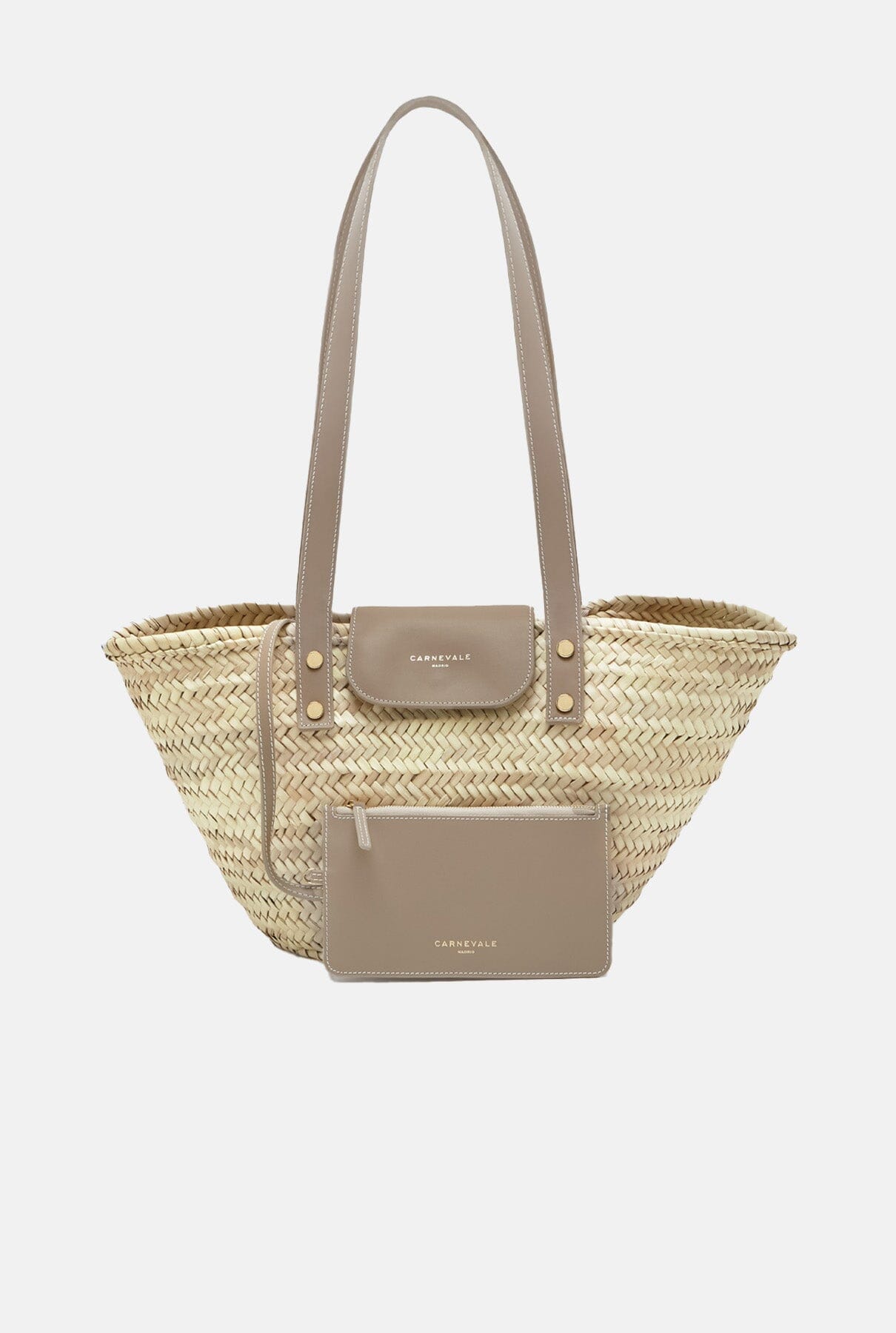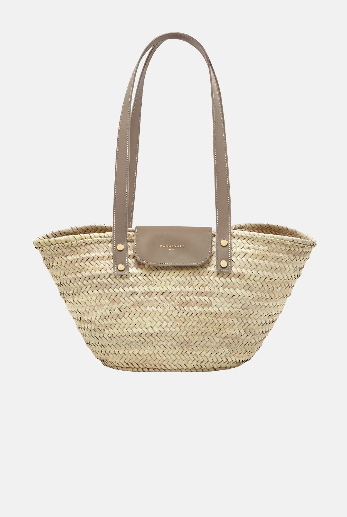 Bolso Cesta elaborado artesanalmente con hojas de palma y decorado con asas y solapa de piel de vacuno lisa de color marrón, adornado con el logo de Carnevale grabado en oro. Contiene una bolsa de piel extraíble en su interior. El cierre de la solapa es magnético. Presenta acabados metálicos en tono dorado. La compra incluye una bolsa de algodón orgánico.