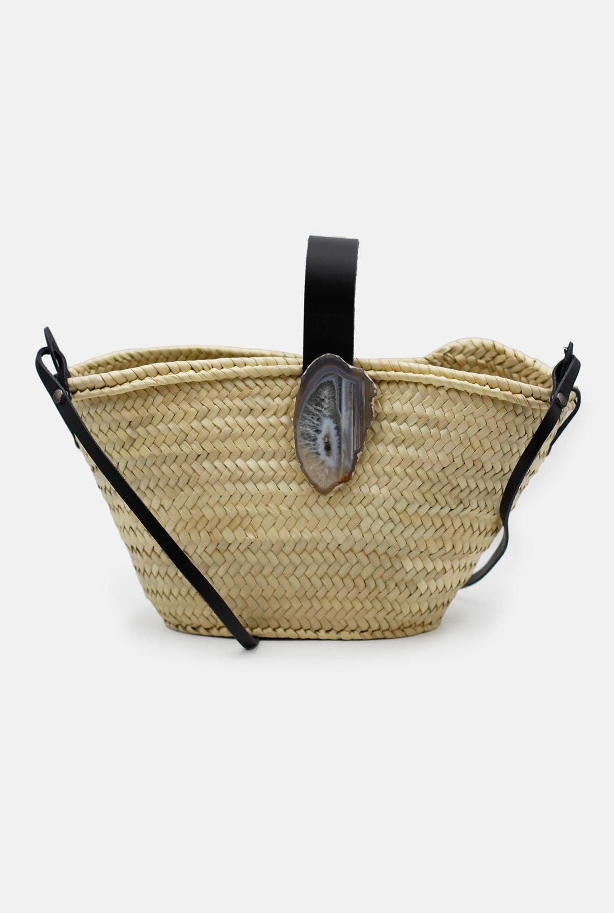 Nuestro capazo Zoé de tamaño mediano es el bolso perfecto para este verano y cuenta con una gran capacidad. El asa de cuero negro, combinada con el aplique de ágata intercambiable, le da un toque original, alegre y muy especial a cualquier look. Serás el centro de atención con este accesorio único, funcional y diferente.
