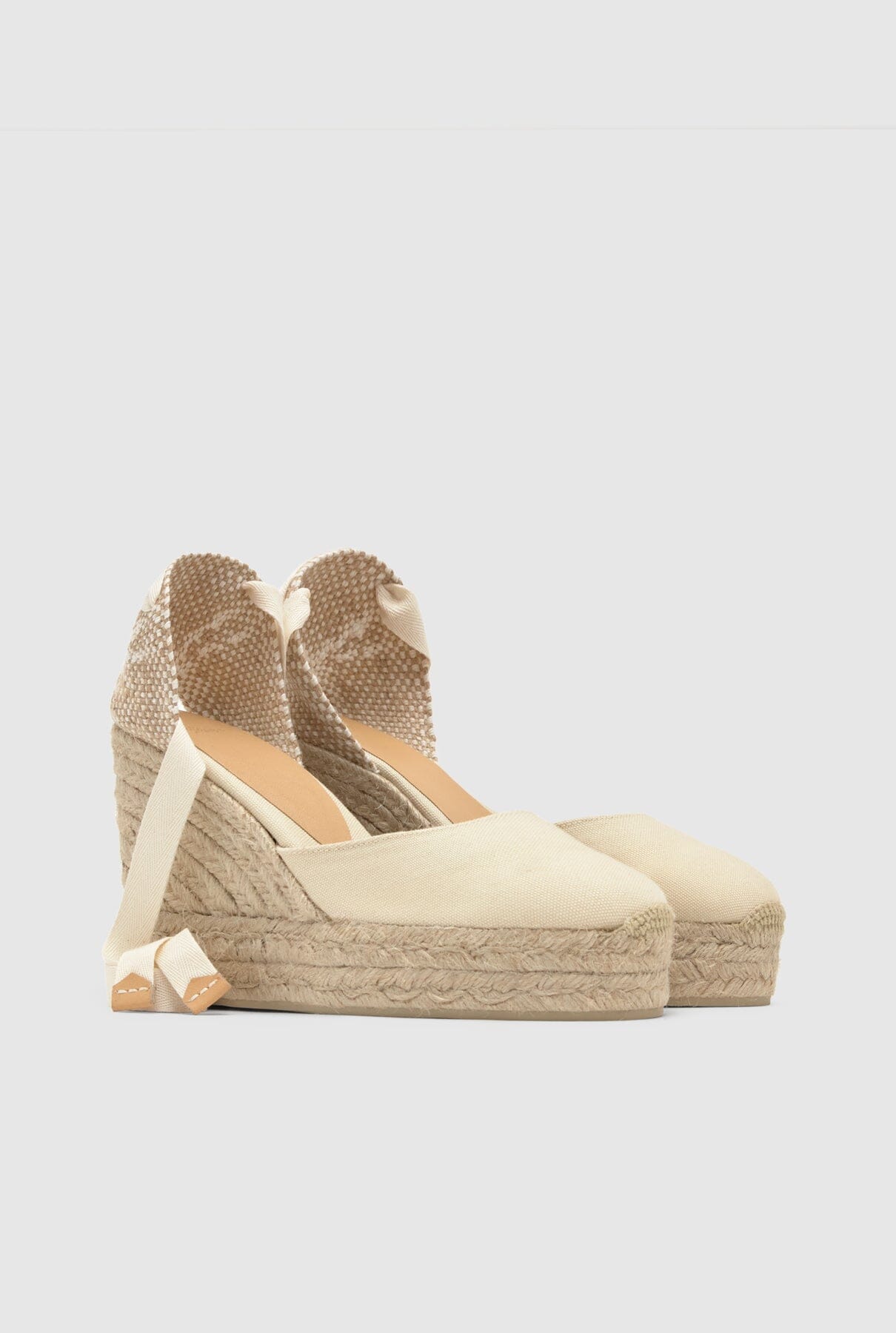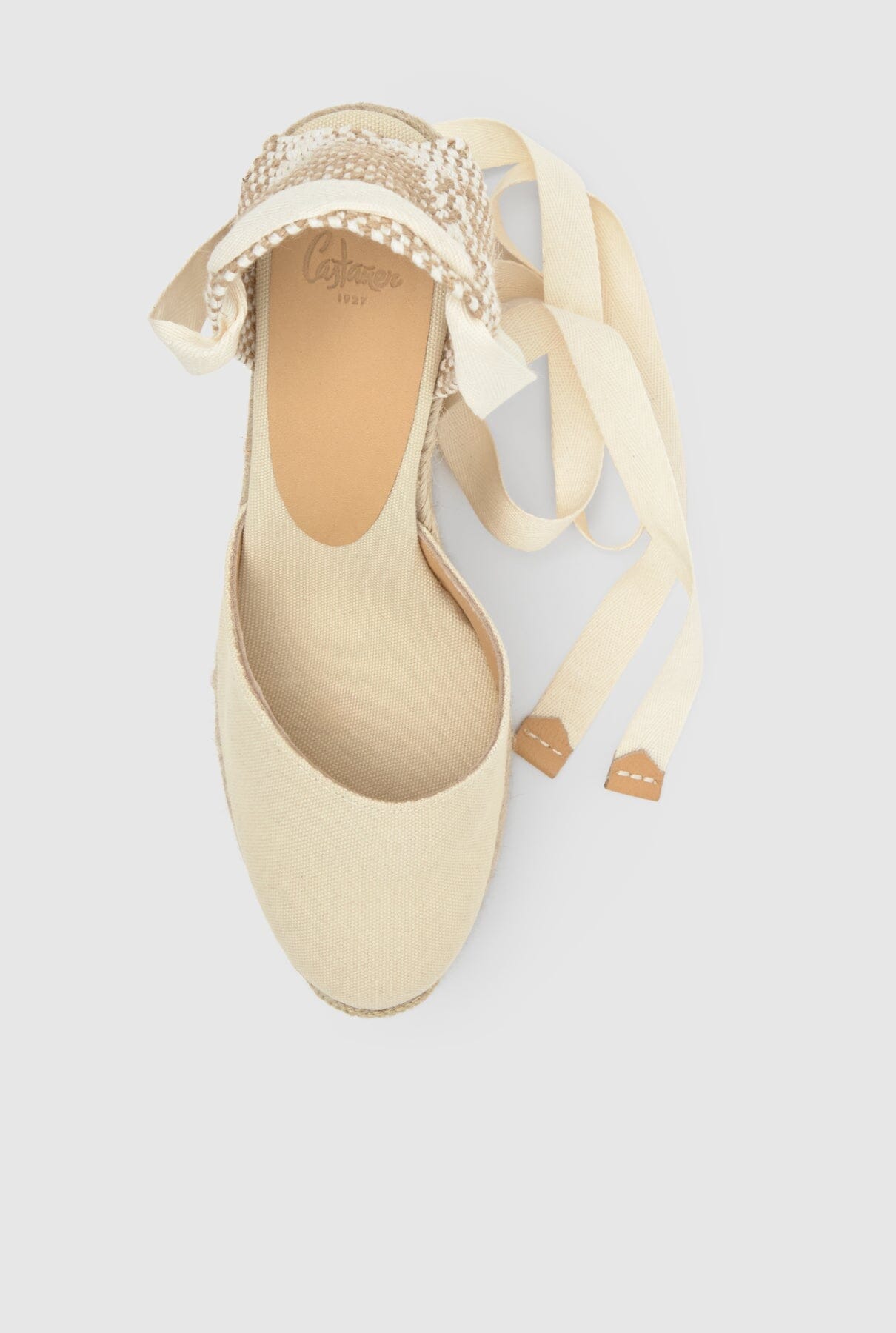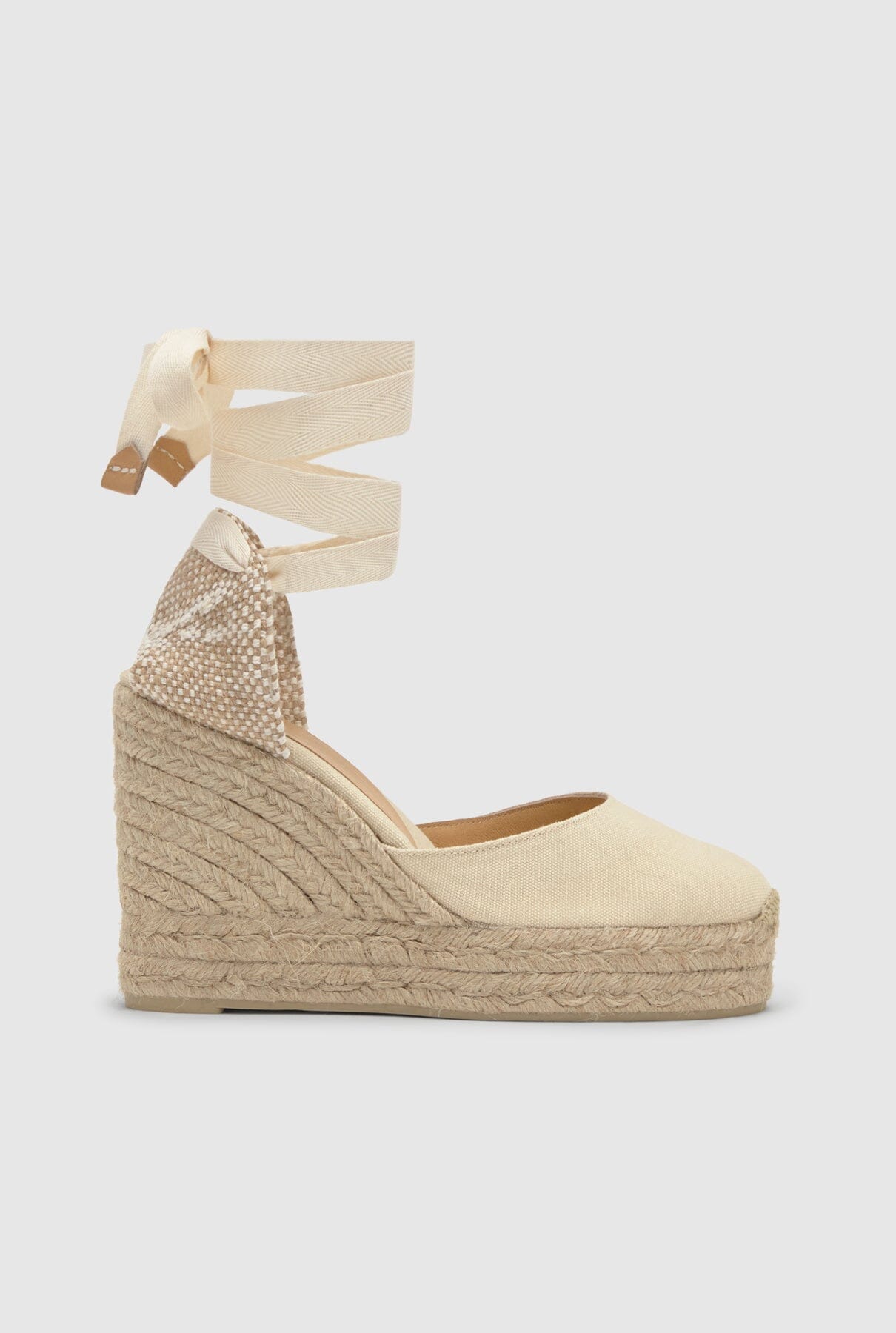 Icónica alpargata Carina en algodón orgánico con cierre de cordones y plantilla acolchada. Tacón de yute de 11cm con doble plataforma.